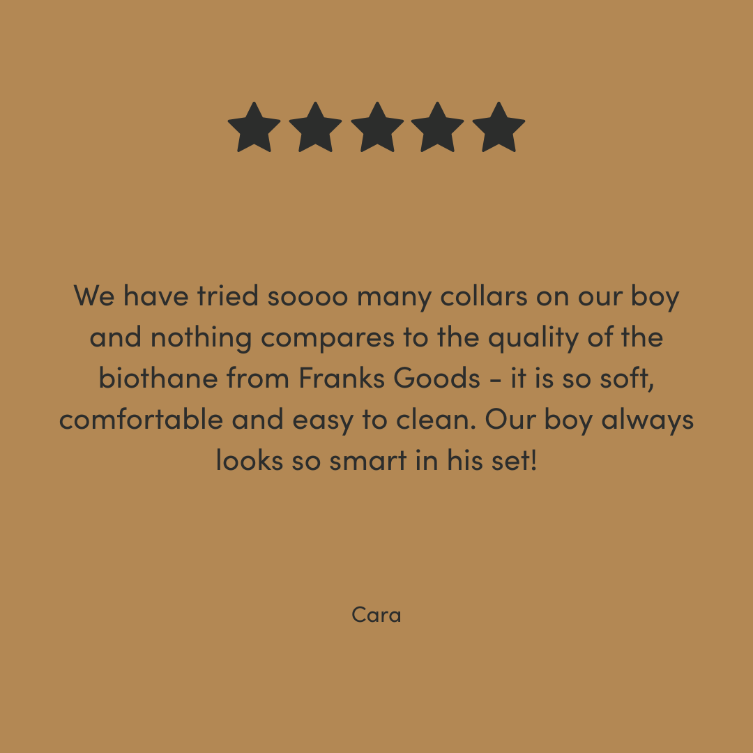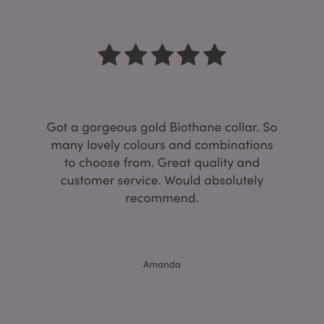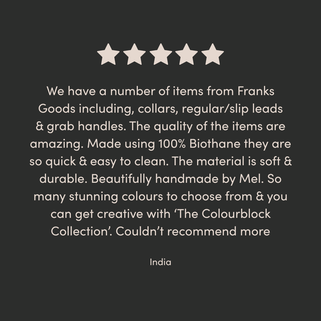 Our BioThane® collars are available in sizes XS - XL and our BioThane® leads are available in S/M and M/L to suit all dog breeds. All of our accessories are handmade to order in our workshop by the sea in Brighton, UK.