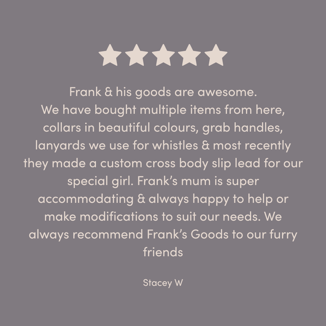 Beautiful colour block designs created for our customers. If you would like a combination you cannot see here please order a collar & lead in the main colour & let us know the highlight colour you would like. If you come up with a combination we haven't done yet we can also name it after your dog!