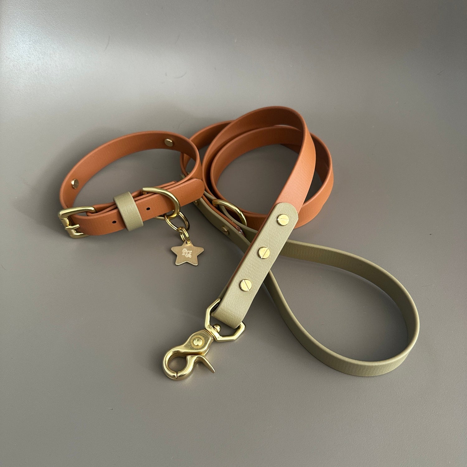 This gorgeous collaboration with our friends over at Bark & Vibe has resulted in a beautifully classic tan & khaki collar & lead set. The set matches perfectly to their must have best selling Doggo Weekender Bag.