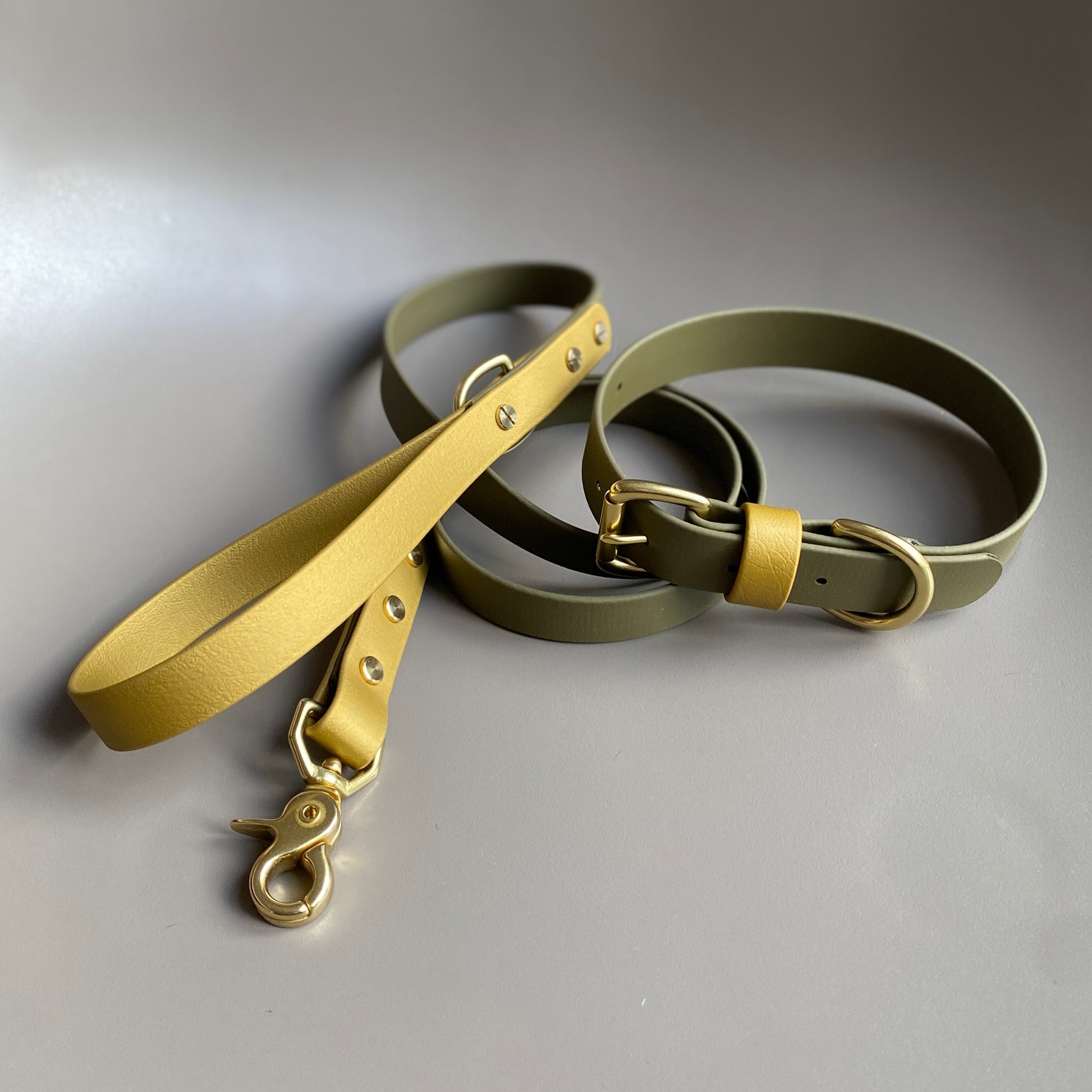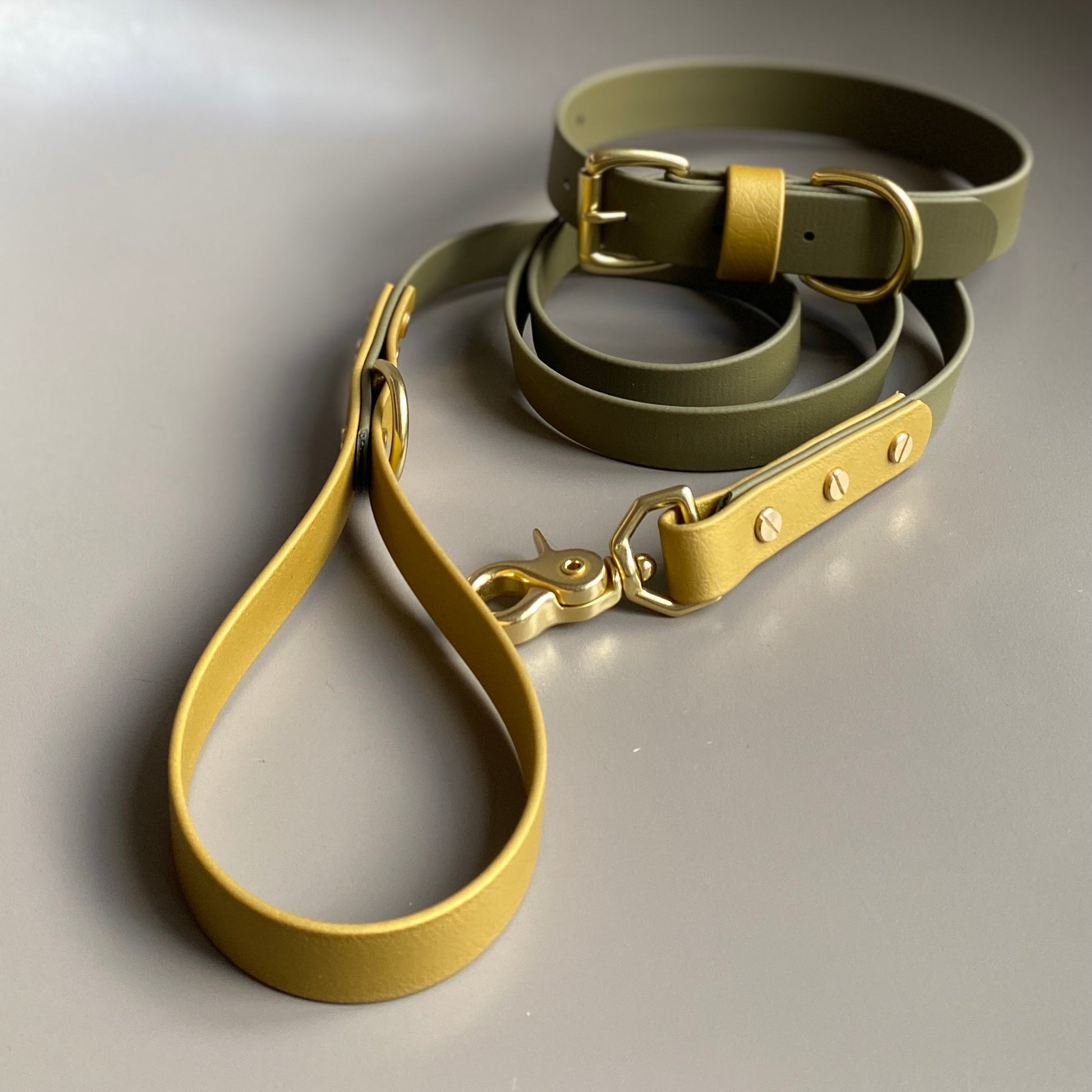 Our Olive as the main colour with a highlight of Gold. Designed & worn by handsome customer Alfie the Hungarian Vizsla.