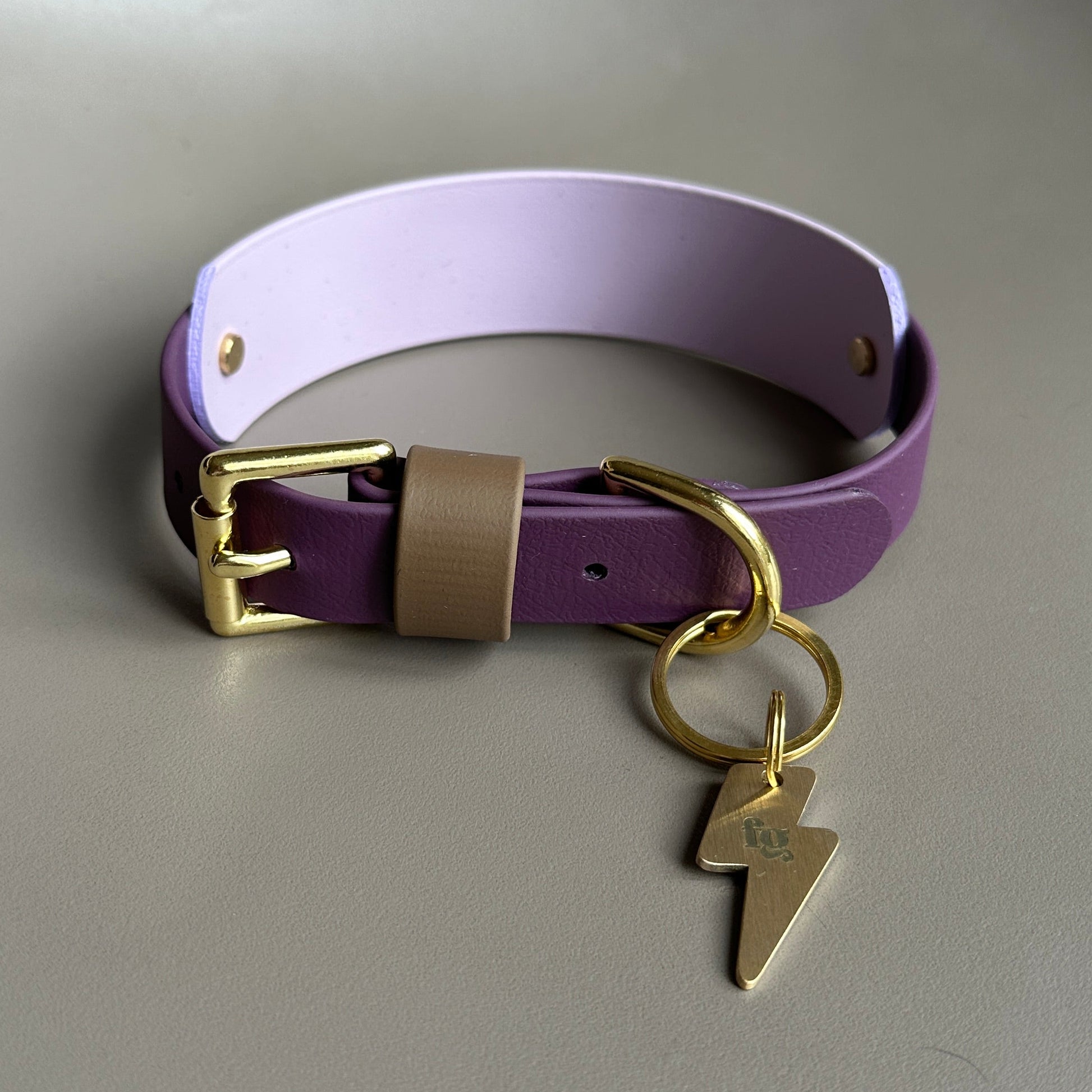 Our Hound Style Collar in Aubergine with a wide band in Lavender and a Mushroom keeper. Designed and worn by beautiful customer Petra the German Shorthaired Pointer.