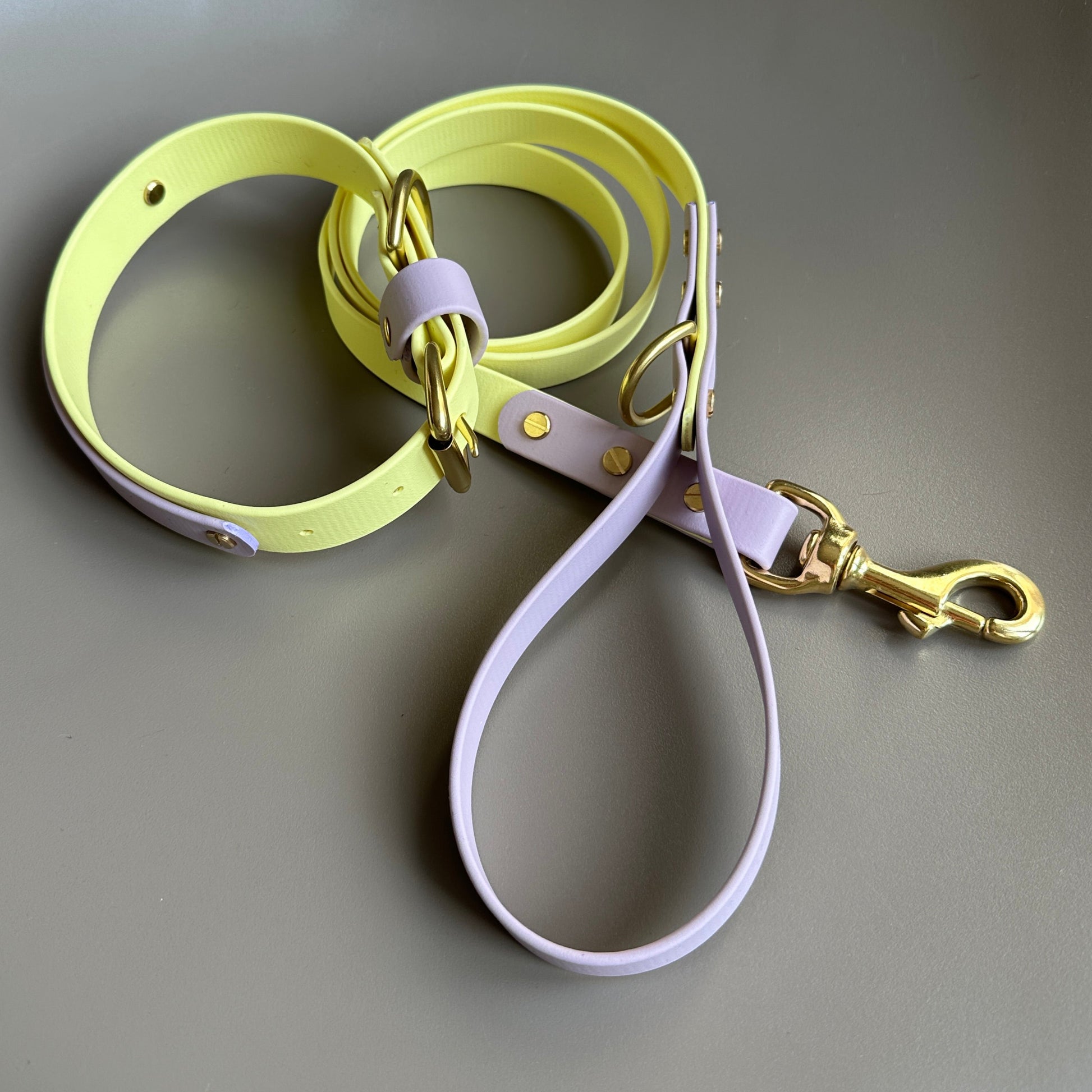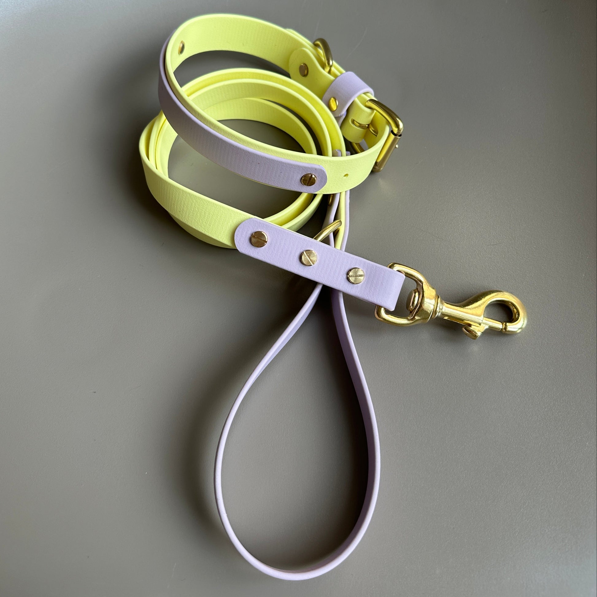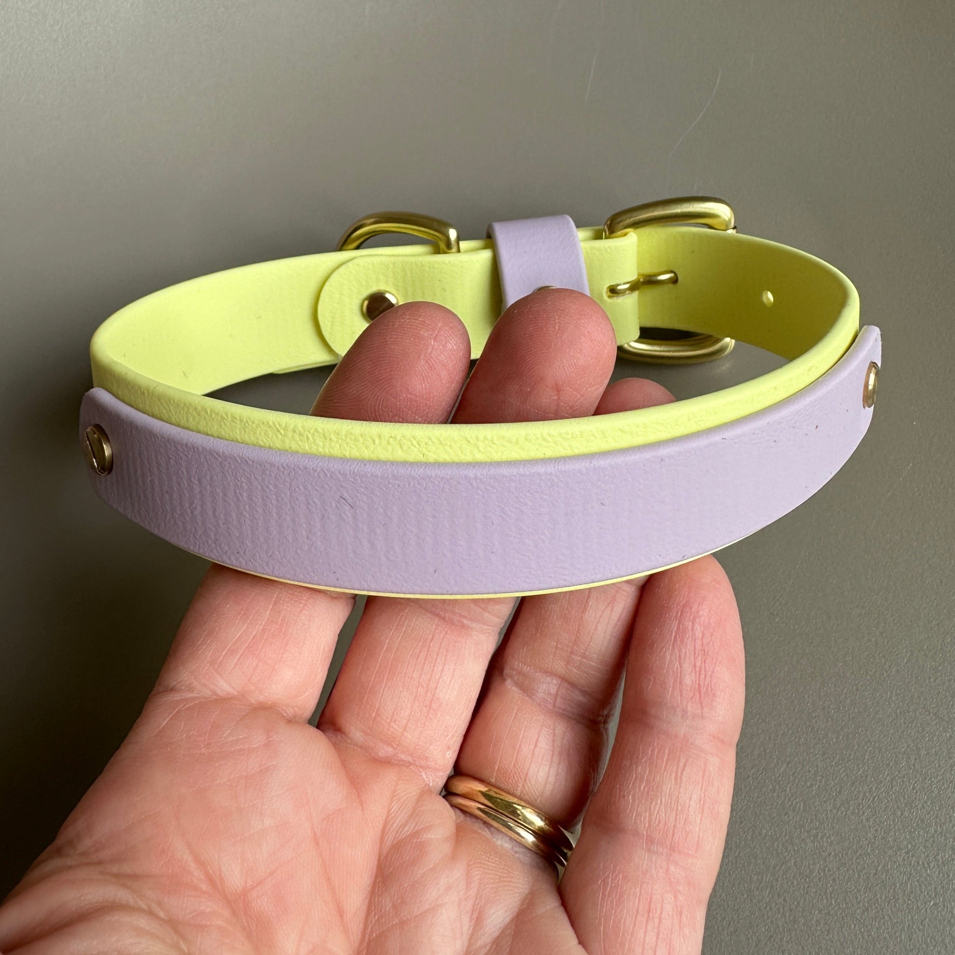 Our Lemonade as the main colour with a highlight of Lavender on the keeper and band. Designed & worn by pretty customer Sage the Labrador X Cocker Spaniel.