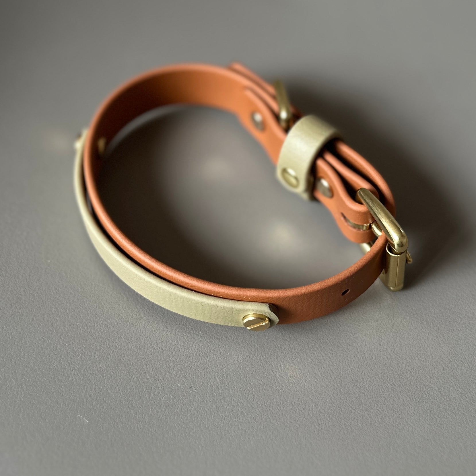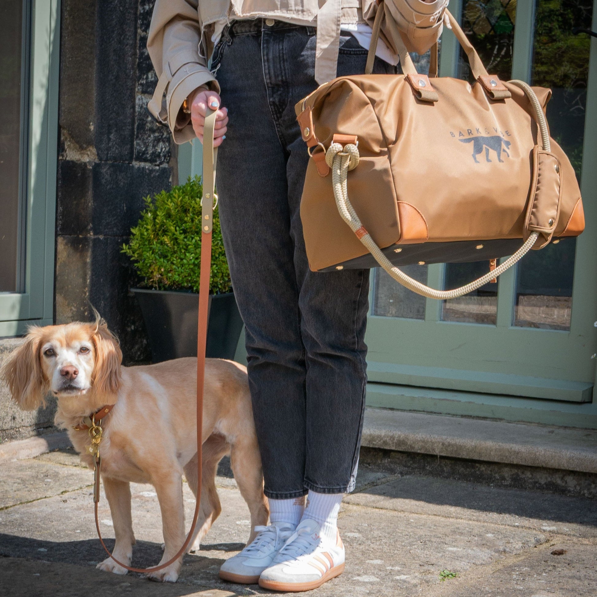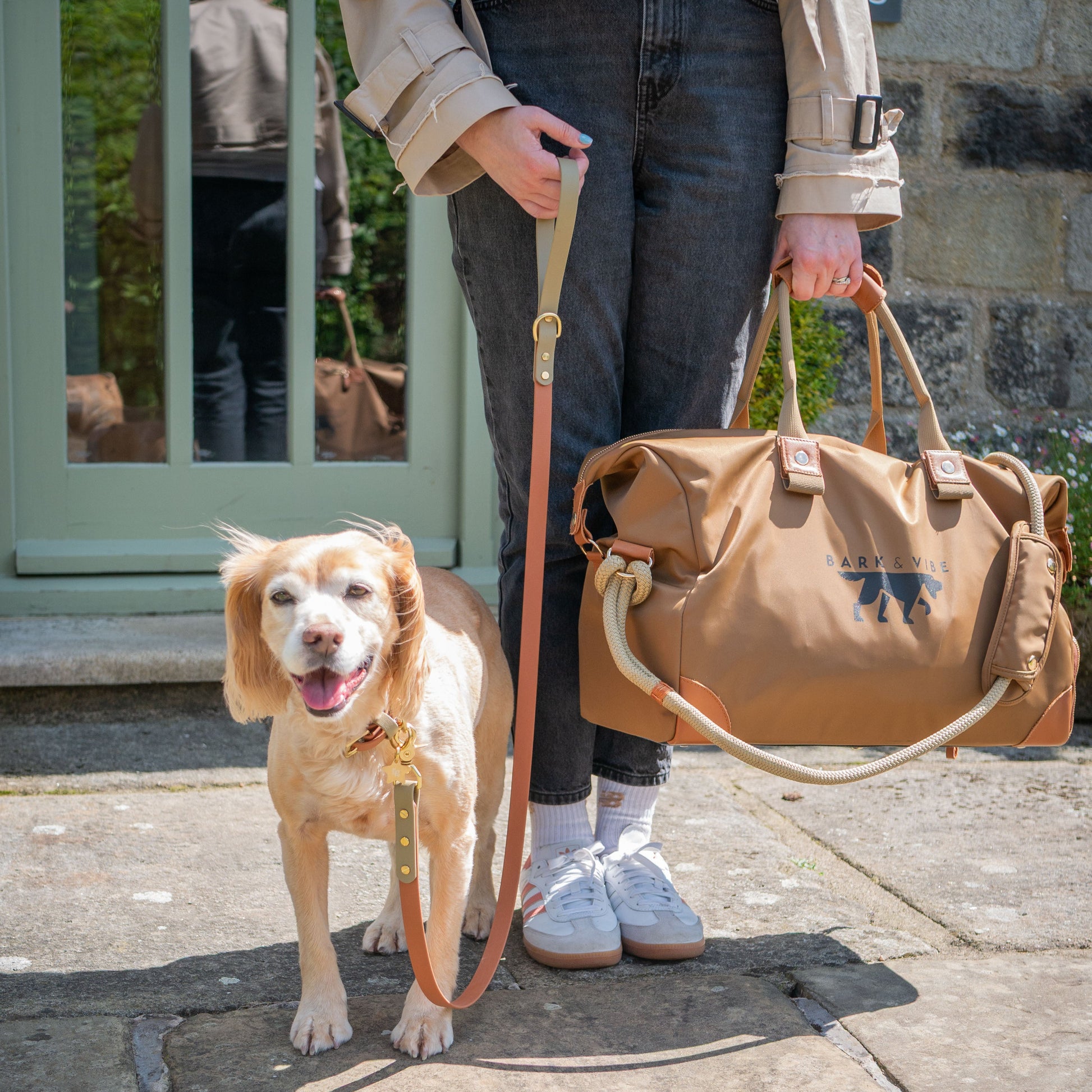 Our brand new Tan as the main colour with a highlight of our classic Khaki on the keeper and band. This colour combination was chosen by our lovely friends over at Bark & Vibe to match their famous must have dog travel bag.