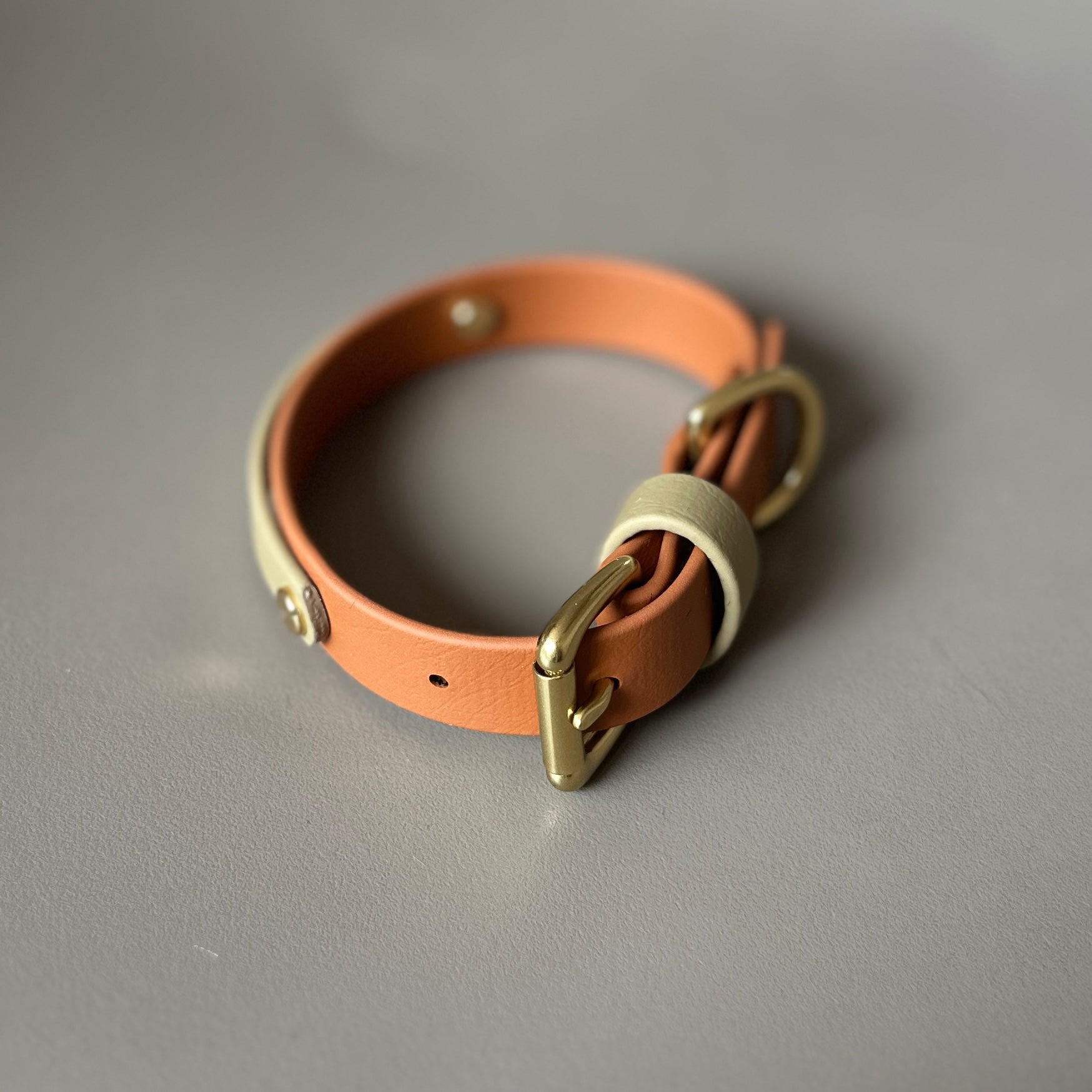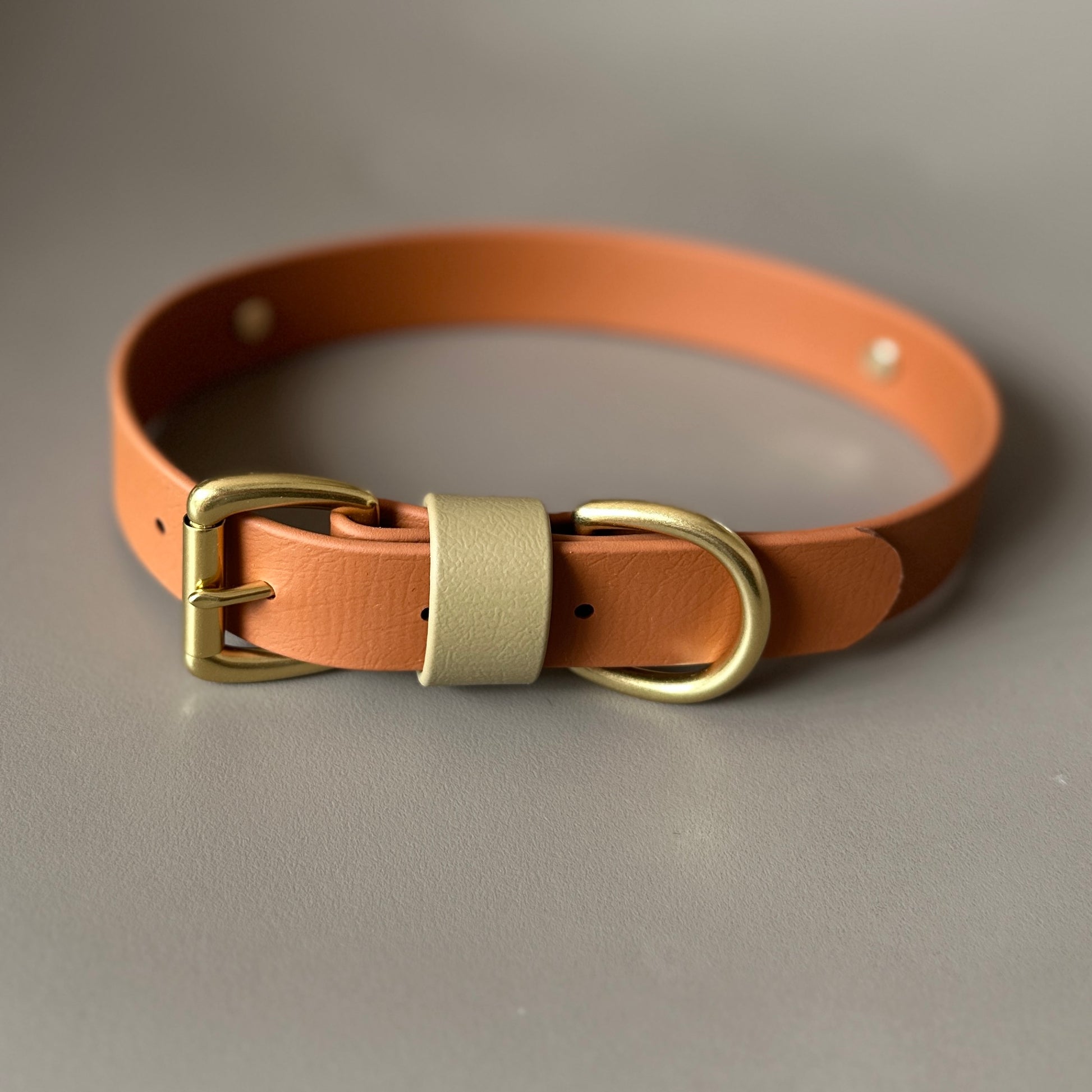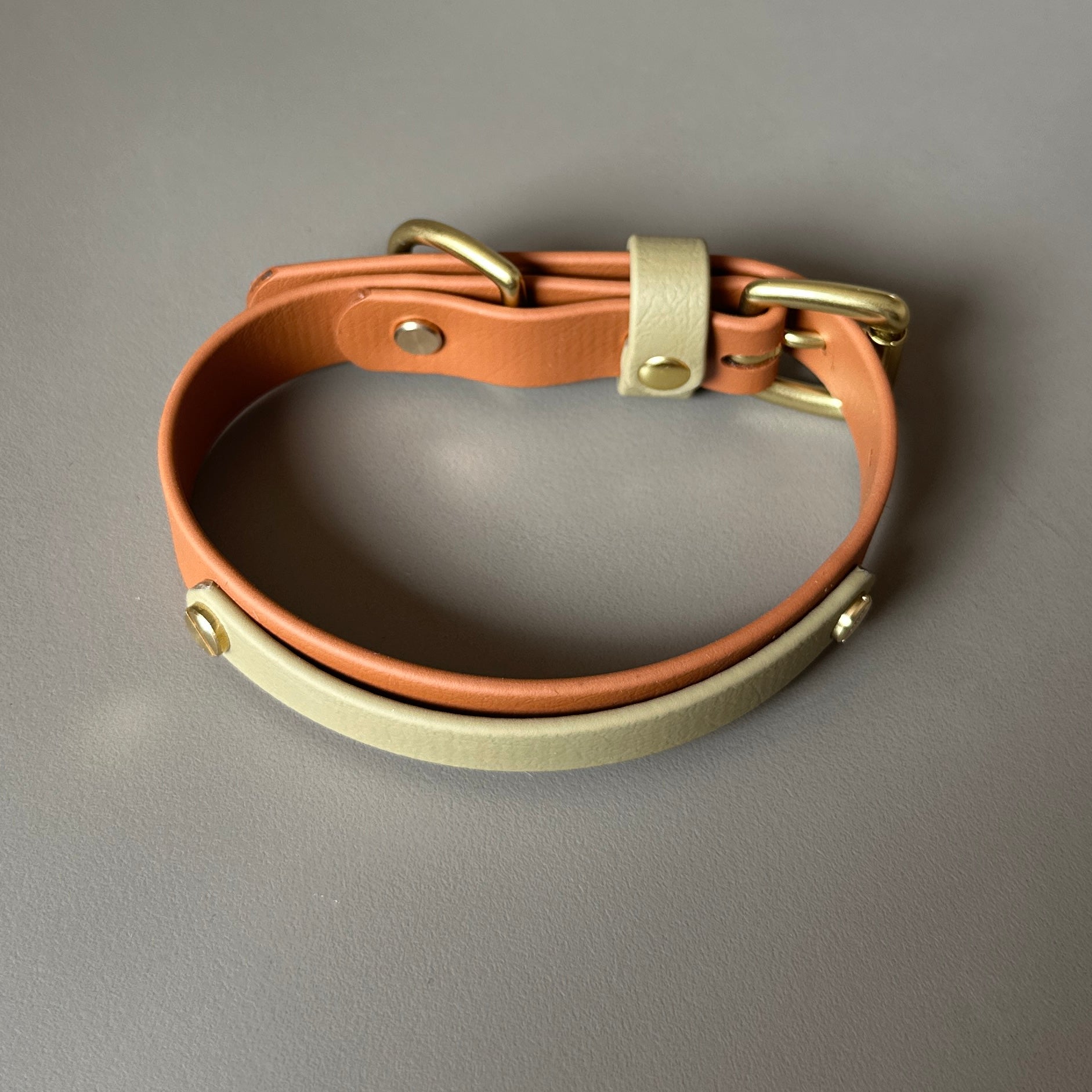 Our brand new Tan as the main colour with a highlight of our classic Khaki on the keeper and band. This colour combination was chosen by our lovely friends over at Bark & Vibe to match their famous must have dog travel bag.