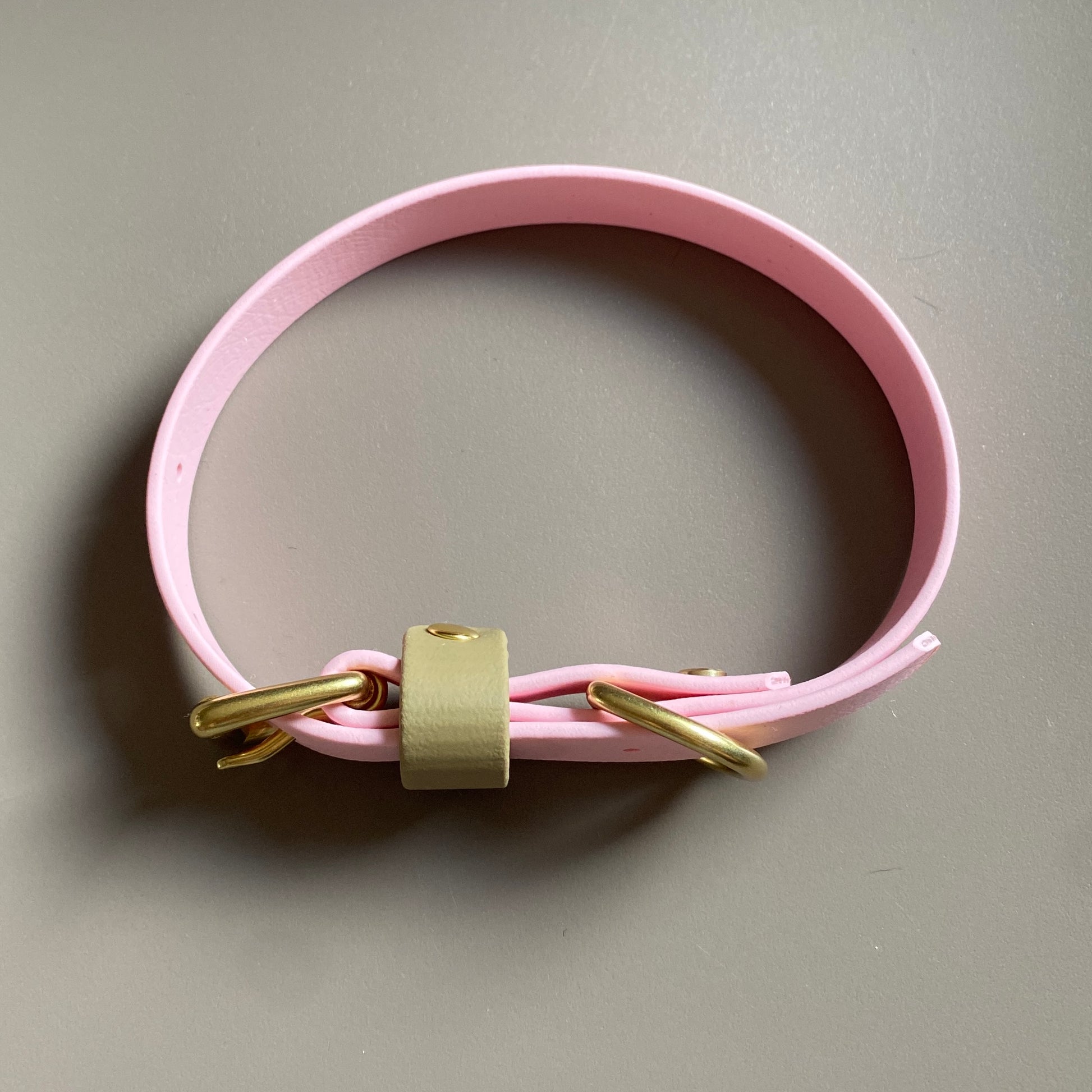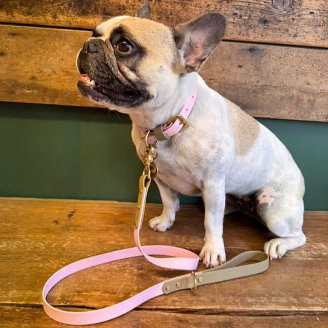 Our Pastel Pink as the main colour with a highlight of Khaki on the keeper. Designed & worn by beautiful customer Beans the French Bulldog.