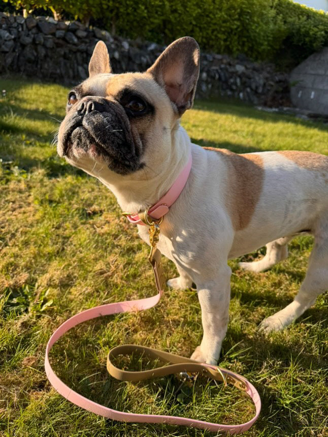 Our Pastel Pink as the main colour with a highlight of Khaki. Designed & worn by beautiful customer Beans the French Bulldog.