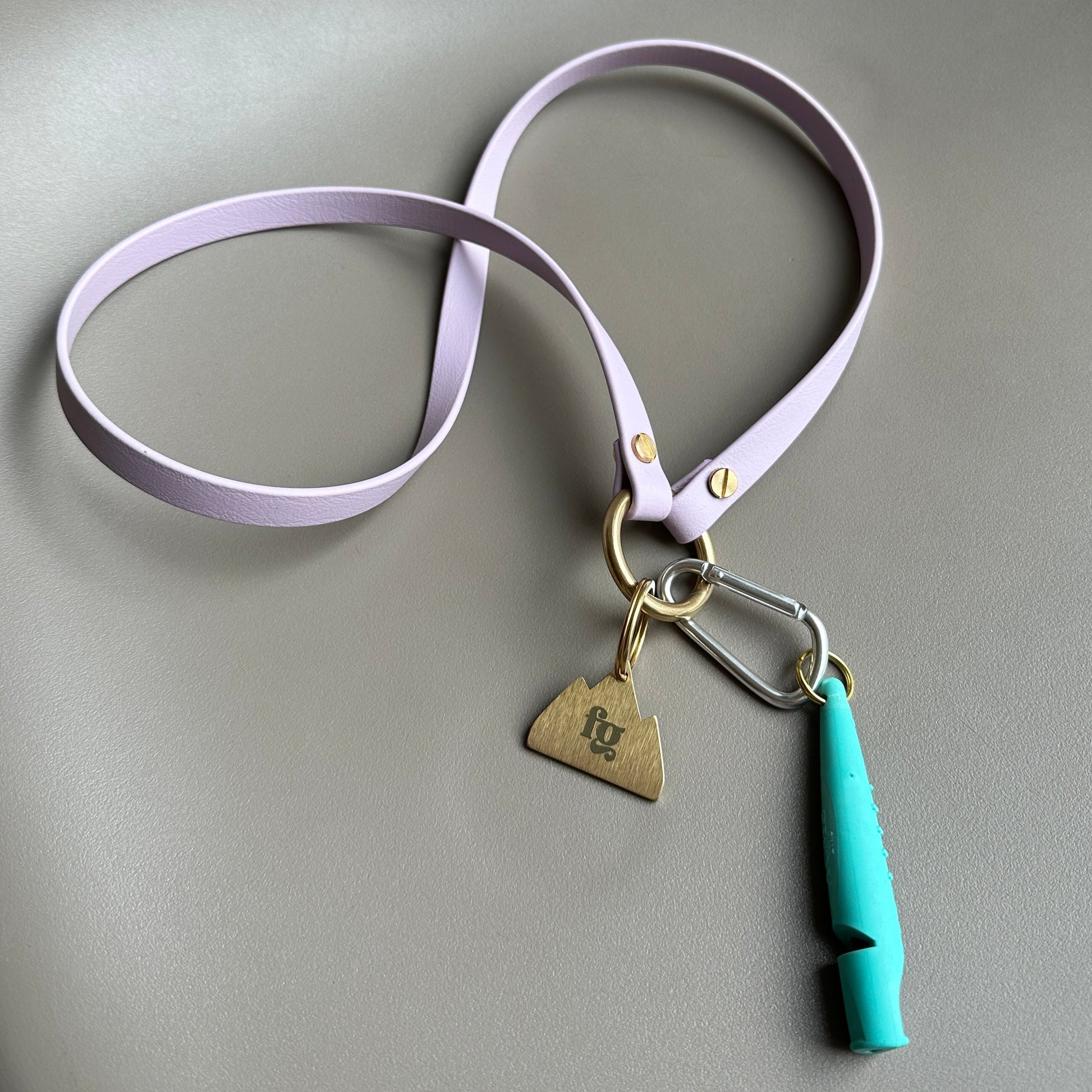 Our key and whistle lanyards have an 80cm long strap. They are made with 13mm wide BioThane® and a solid cast brass ring, all held together with solid brass screws. We have added a rust proof aluminium carabiner clip so you can easily clip your keys and dog whistle on.
