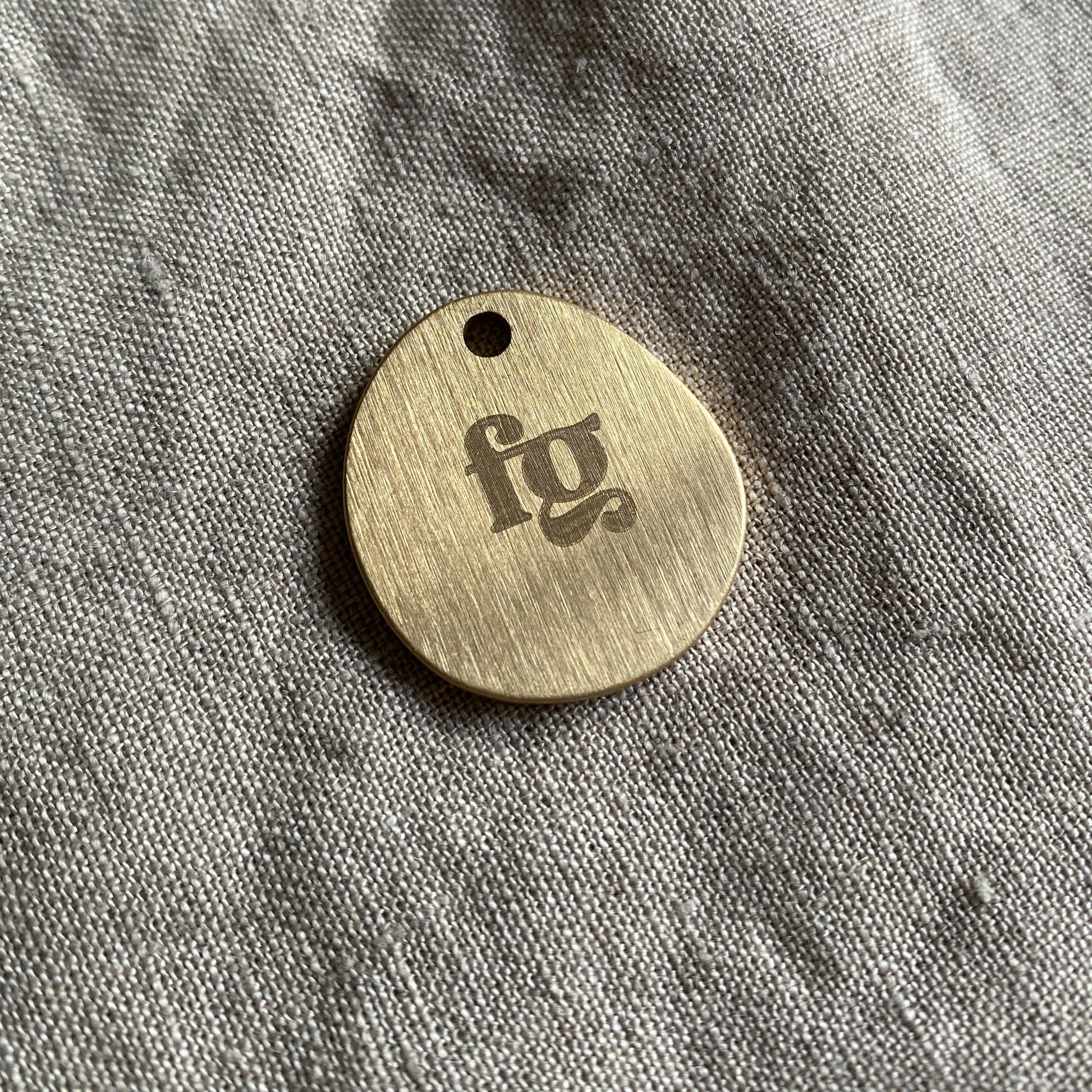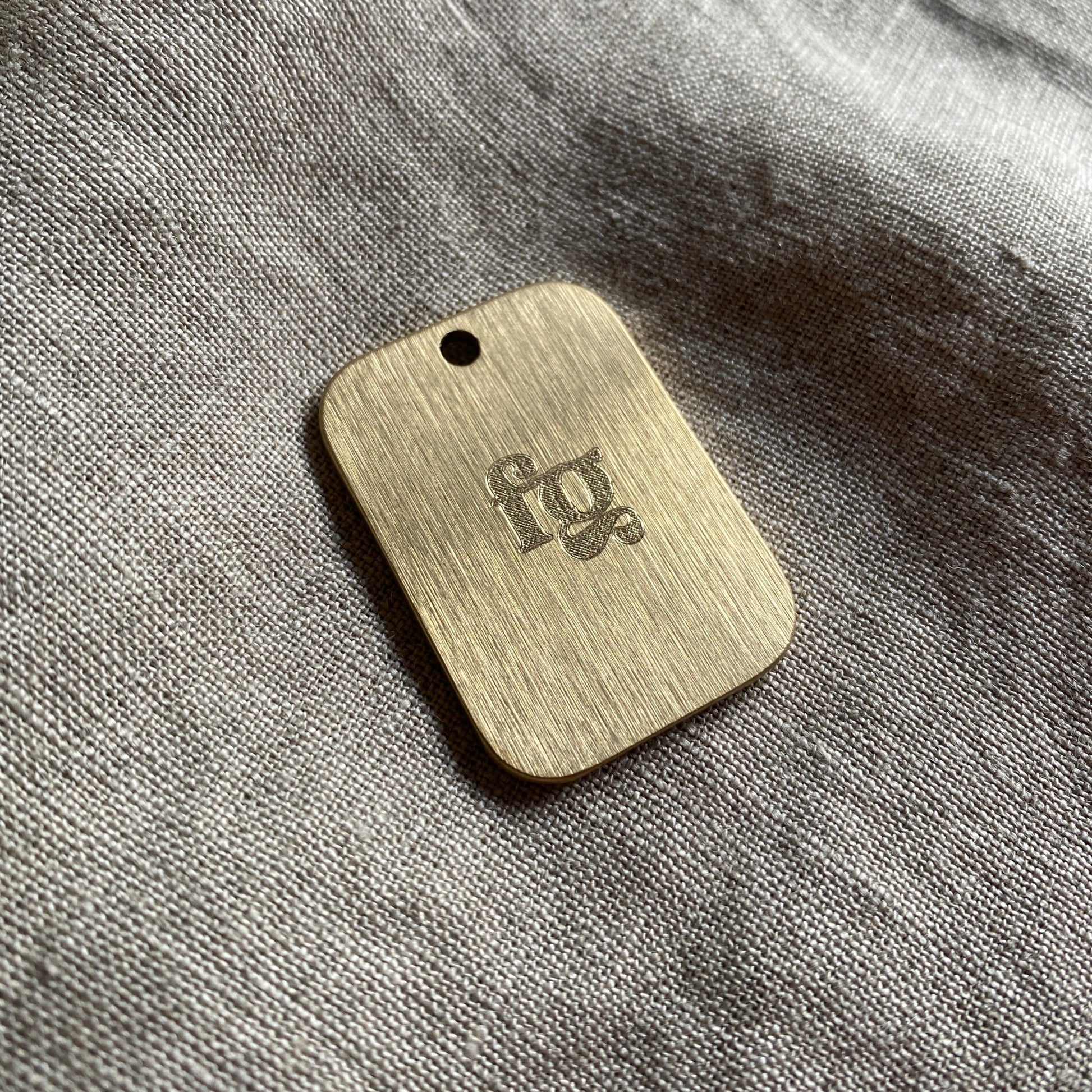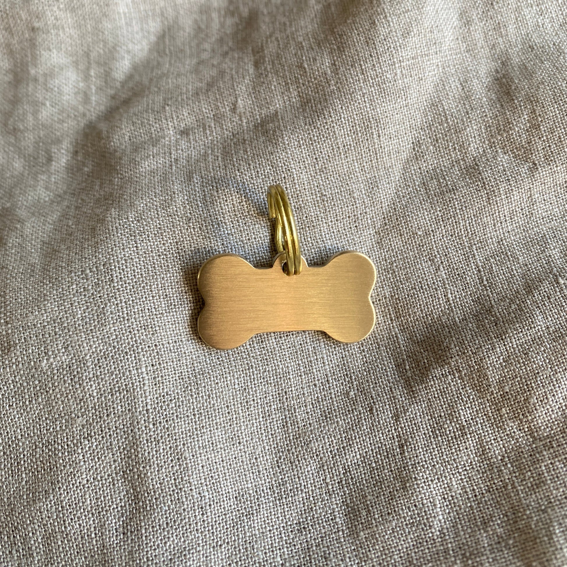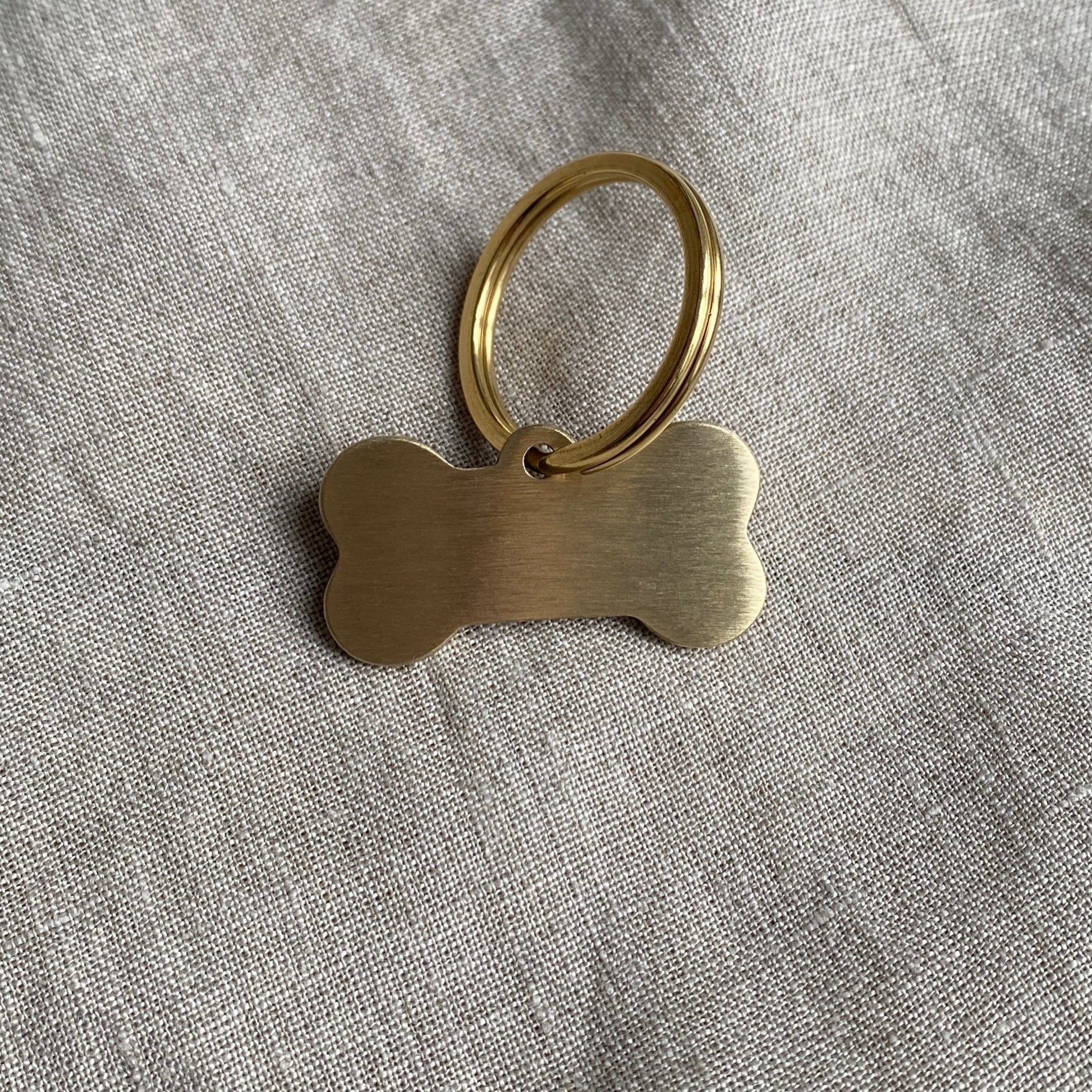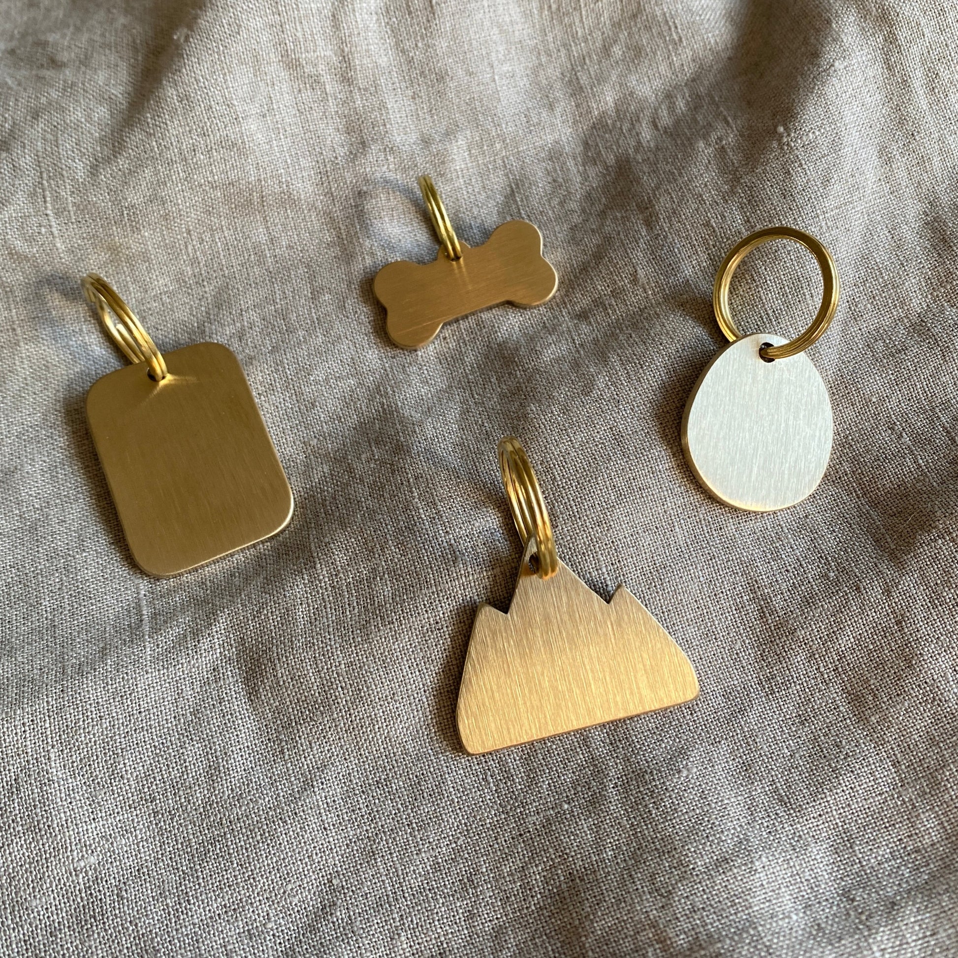 All tags include a small solid brass split ring and a medium solid brass split ring.