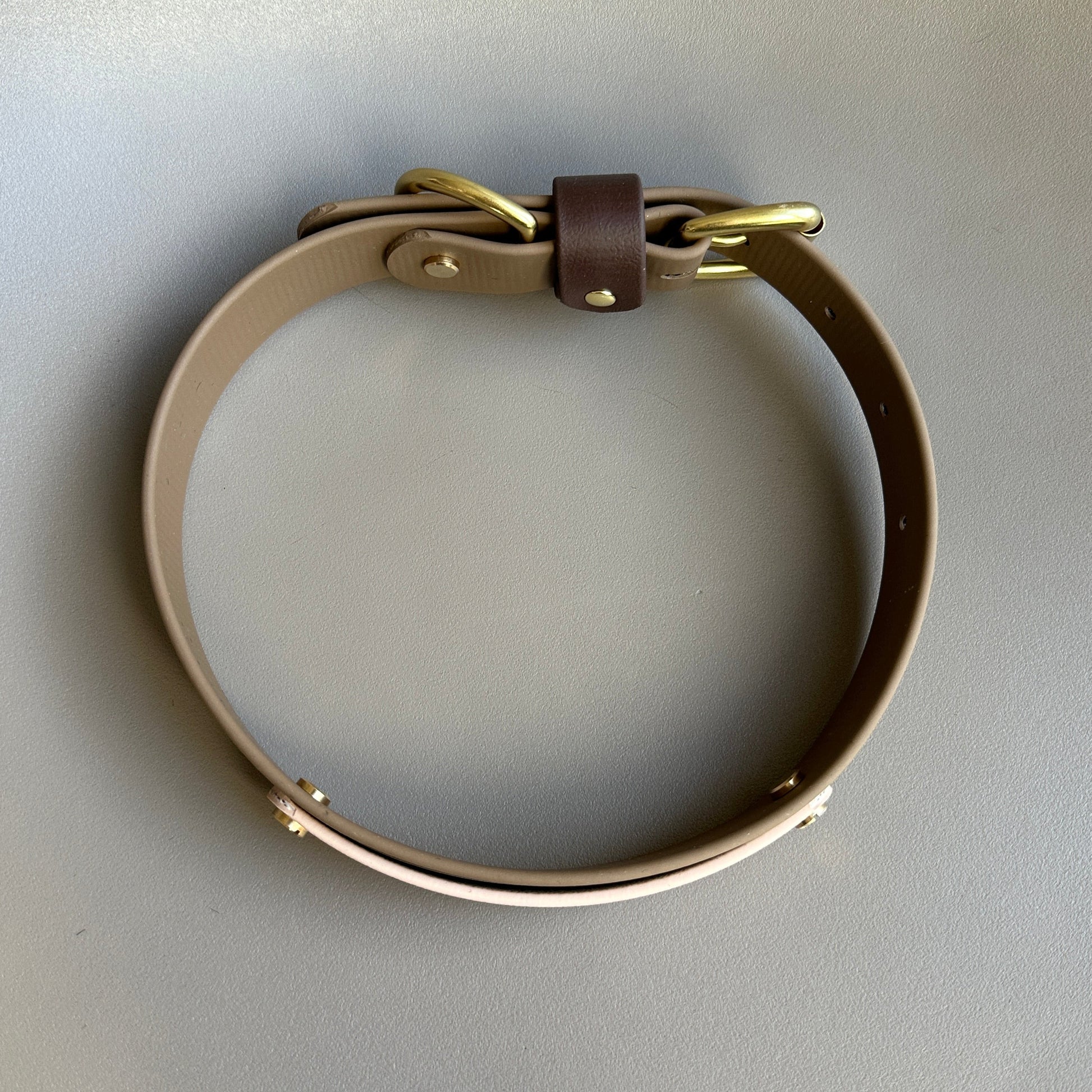 Mushroom as the main colour with a highlight of Dark Brown on the keeper and Latte on the back band. Designed and worn by wonderful repeat customers Petra & Rupert the German Shorthaired Pointers.