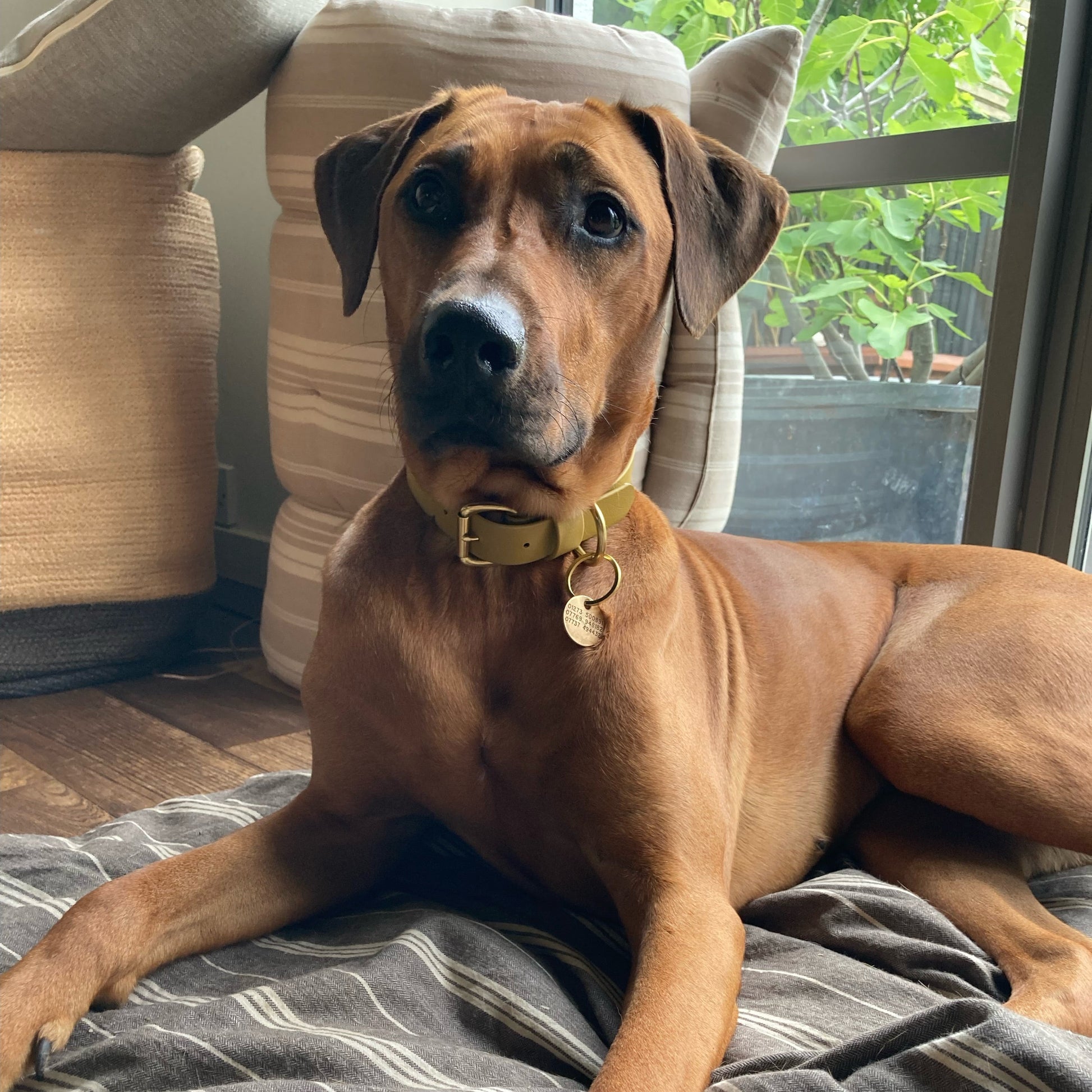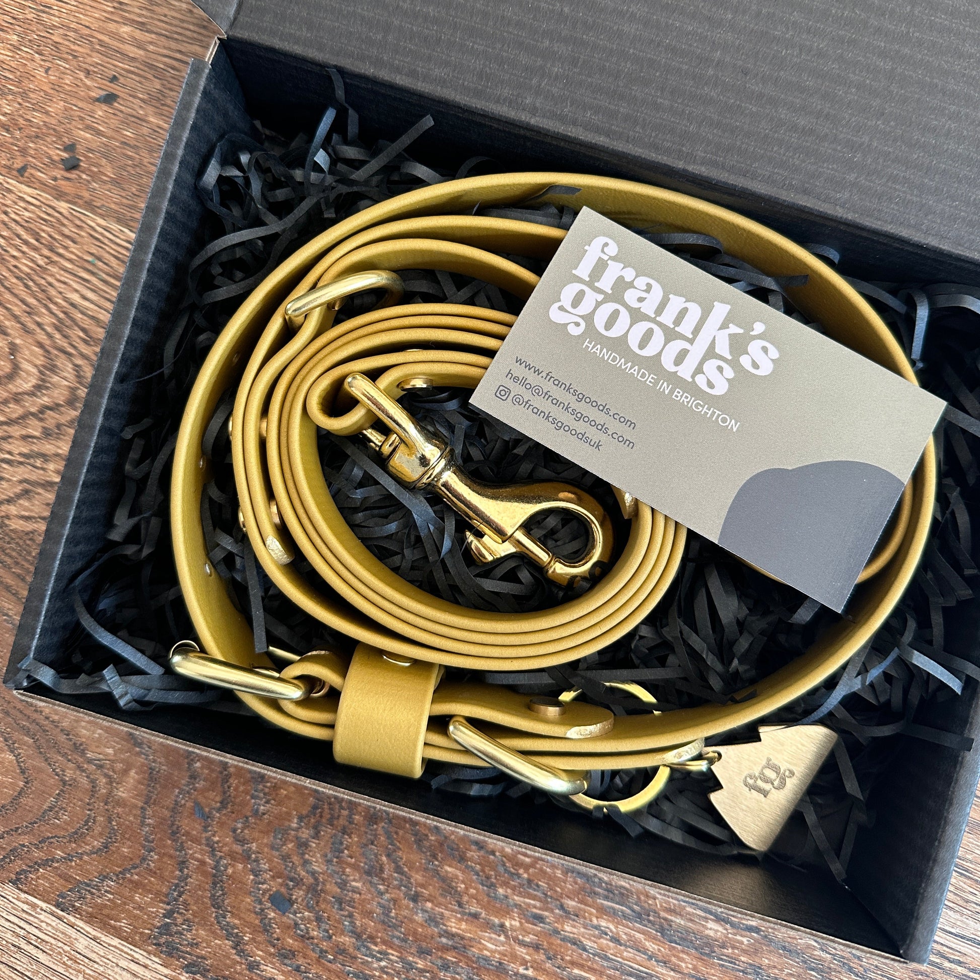 Our handmade collars and leads are made of BioThane®, a very strong rubber coated webbing that has a soft pliable leather like look and feel. BioThane® is water resistant, mould resistant, odour resistant, anti-bacterial and easy to keep clean. The ideal material for any active pup, especially if your dog likes a swim or gets very dirty during their walks, simply wipe it clean afterwards and it will be as good as new.