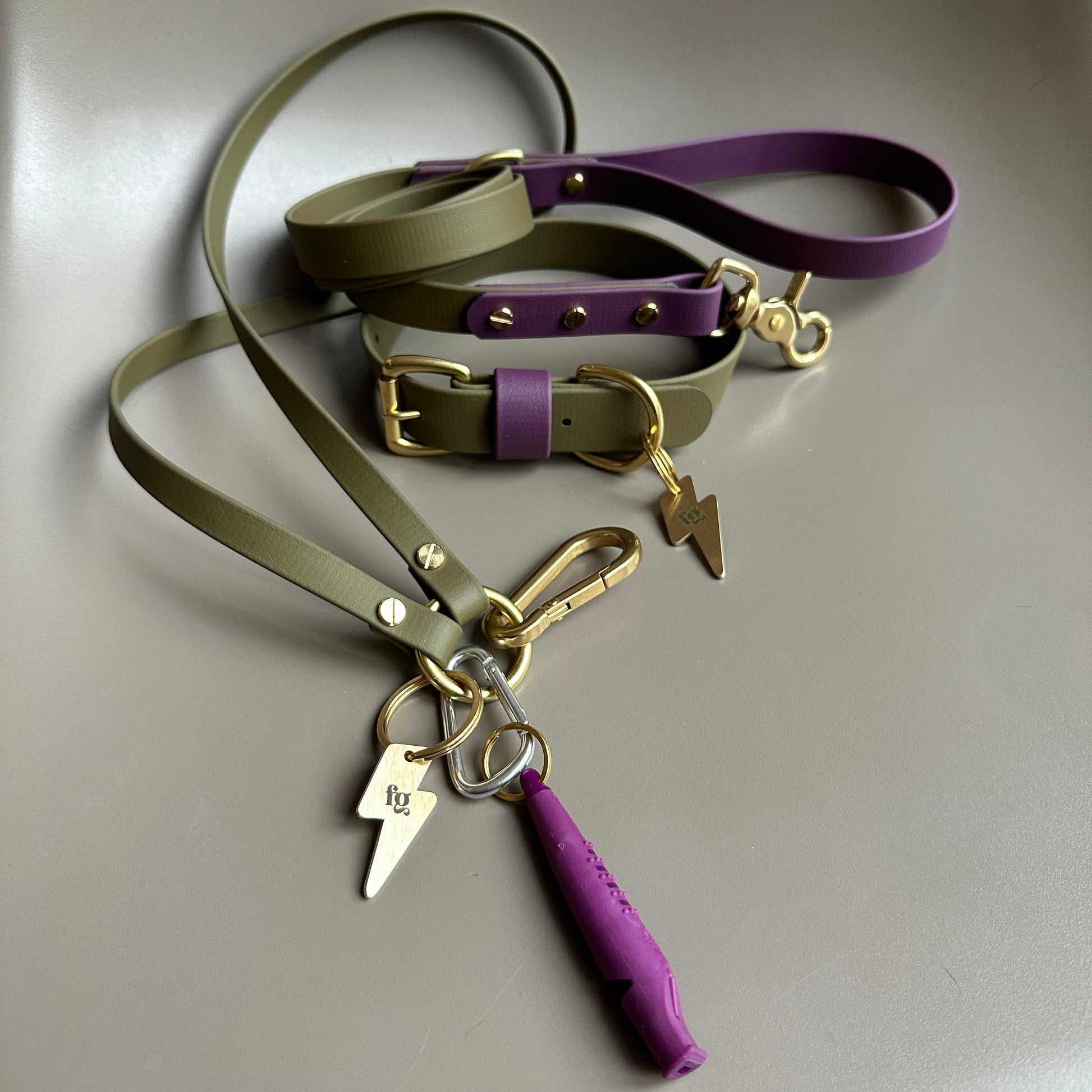 Our Dallas lanyard is crafted from 13mm wide Olive BioThane® and is held together with solid brass screws. From the solid brass o-ring hangs an aluminium carabiner clip, a solid brass carabiner clip with Purple Acme Alpha Whistle with brass split ring and a lightning bolt FG engraved tag with brass split ring.