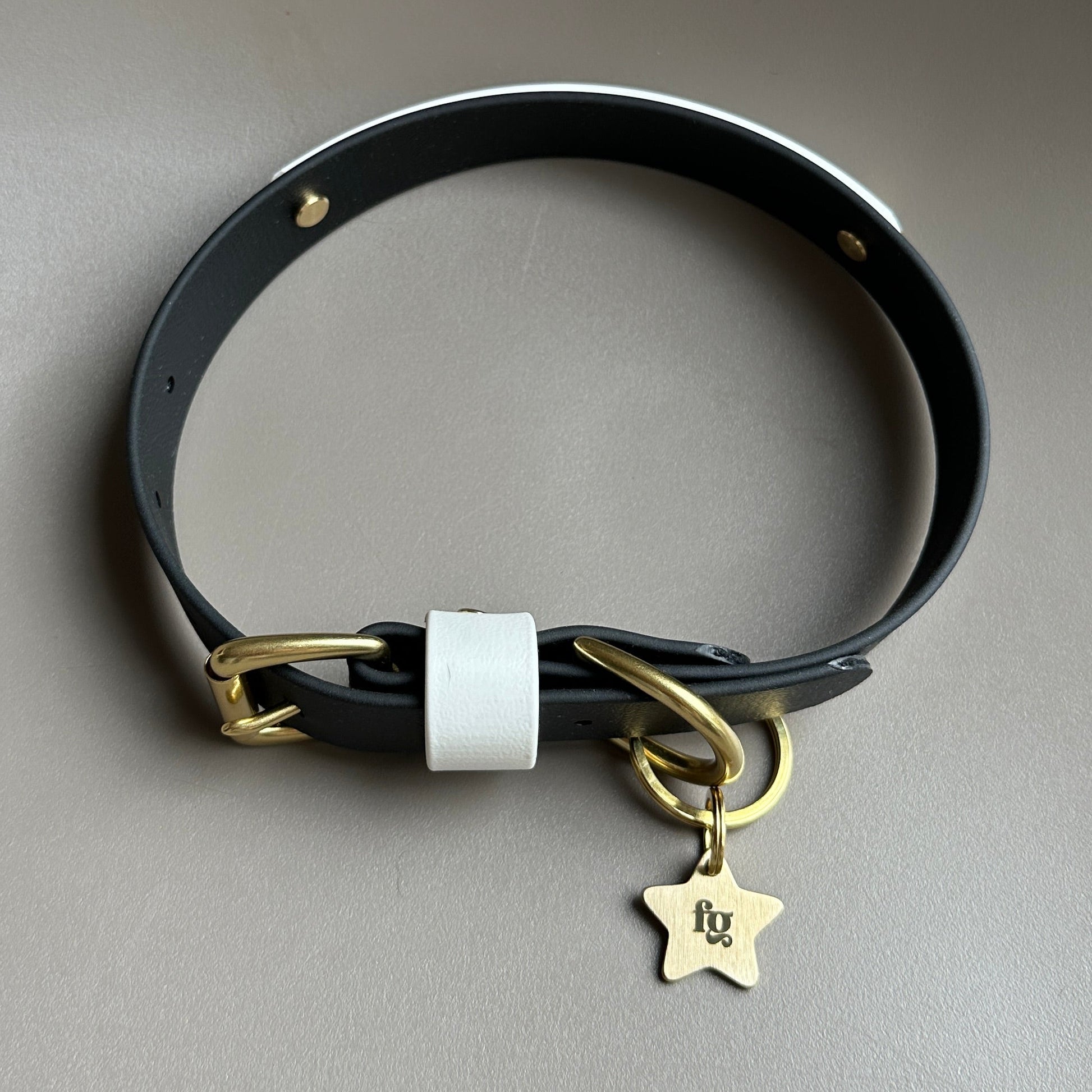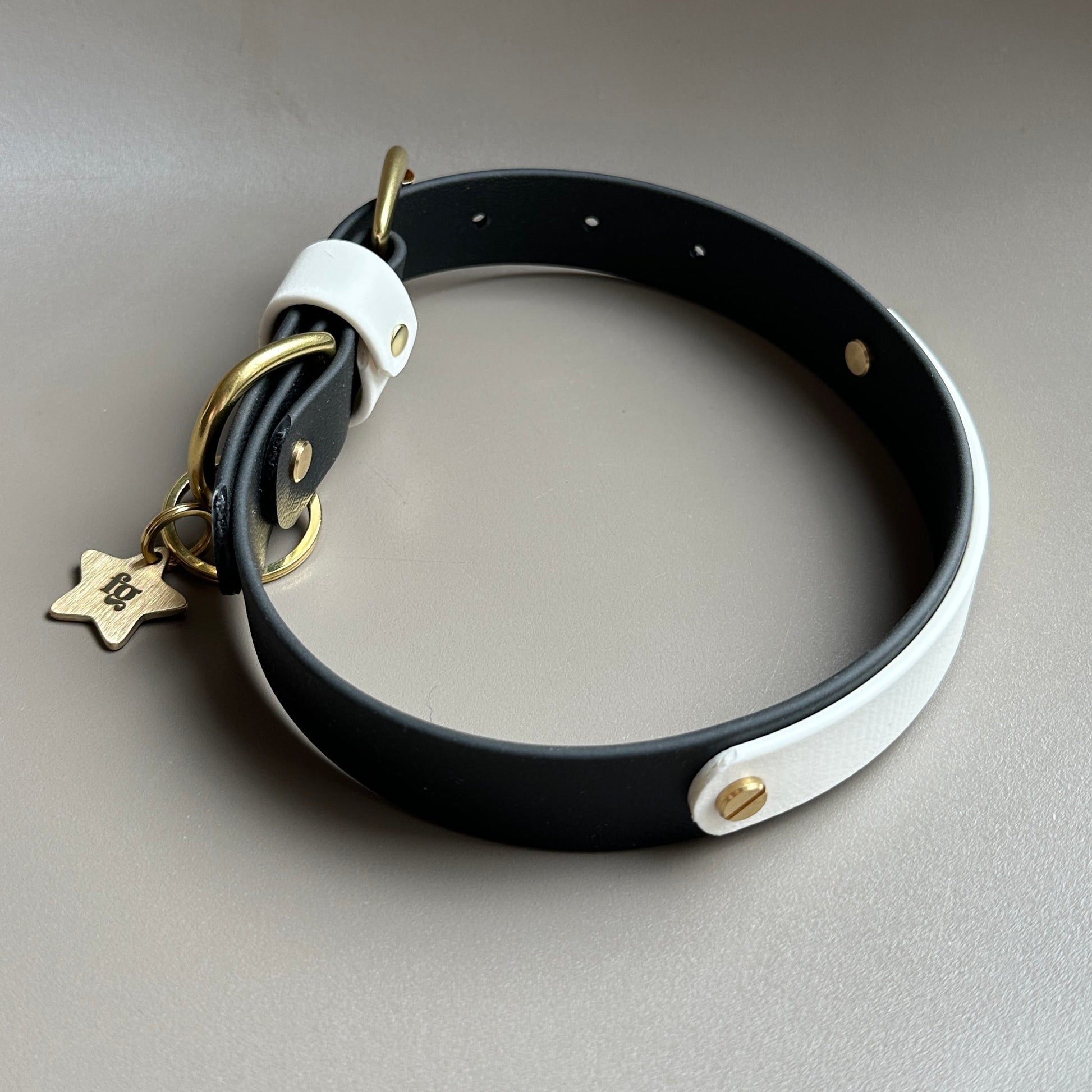 Black as the main colour with a highlight of White on the keeper and back band. Designed and worn by superstar customer Darcy the Dalmation.
