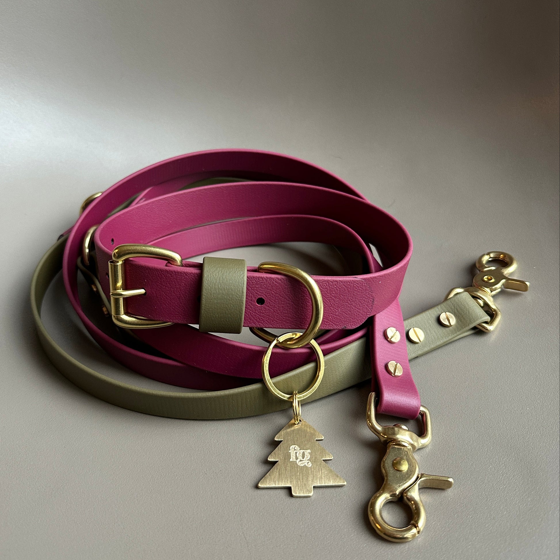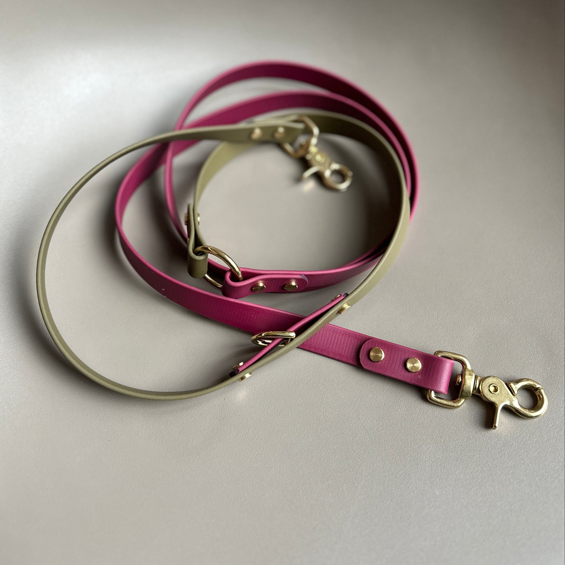 A beautiful colourblock multiway lead in Wine and Olive. Created by gorgeous customer Dottie the Golden Retriever.