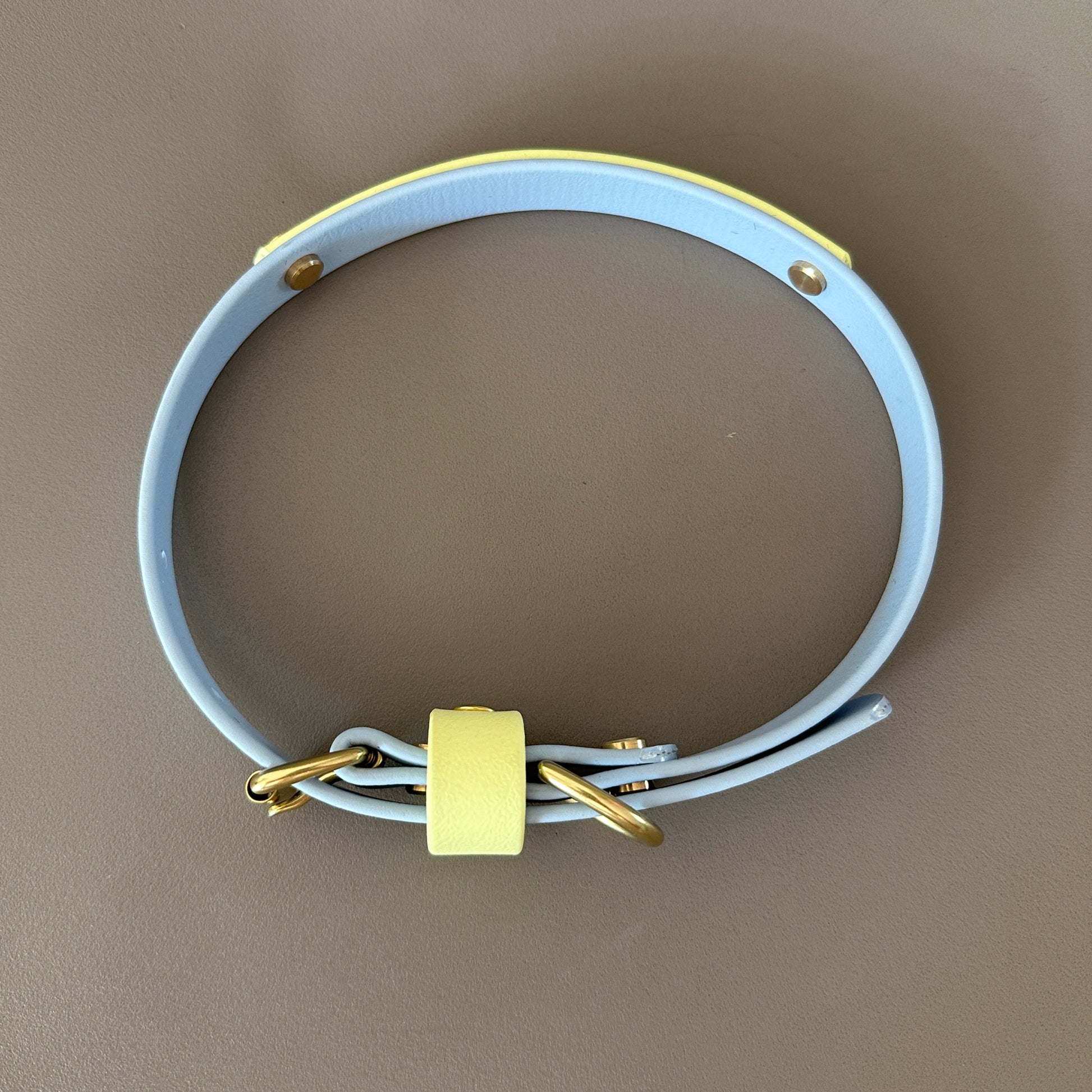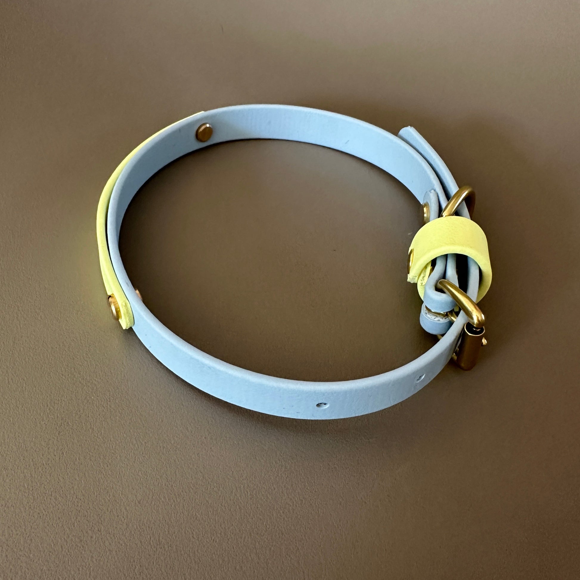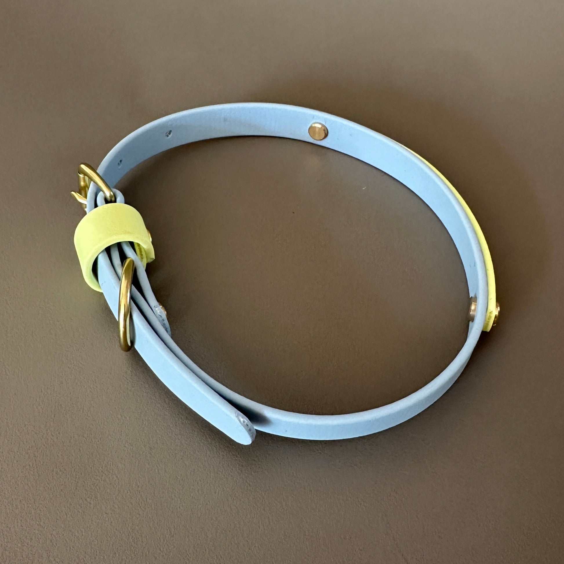 Our Powder Blue as the main colour with a highlight of Lemonade on the keeper and band. Designed & worn by handsome customer Arlo the Frenchie.