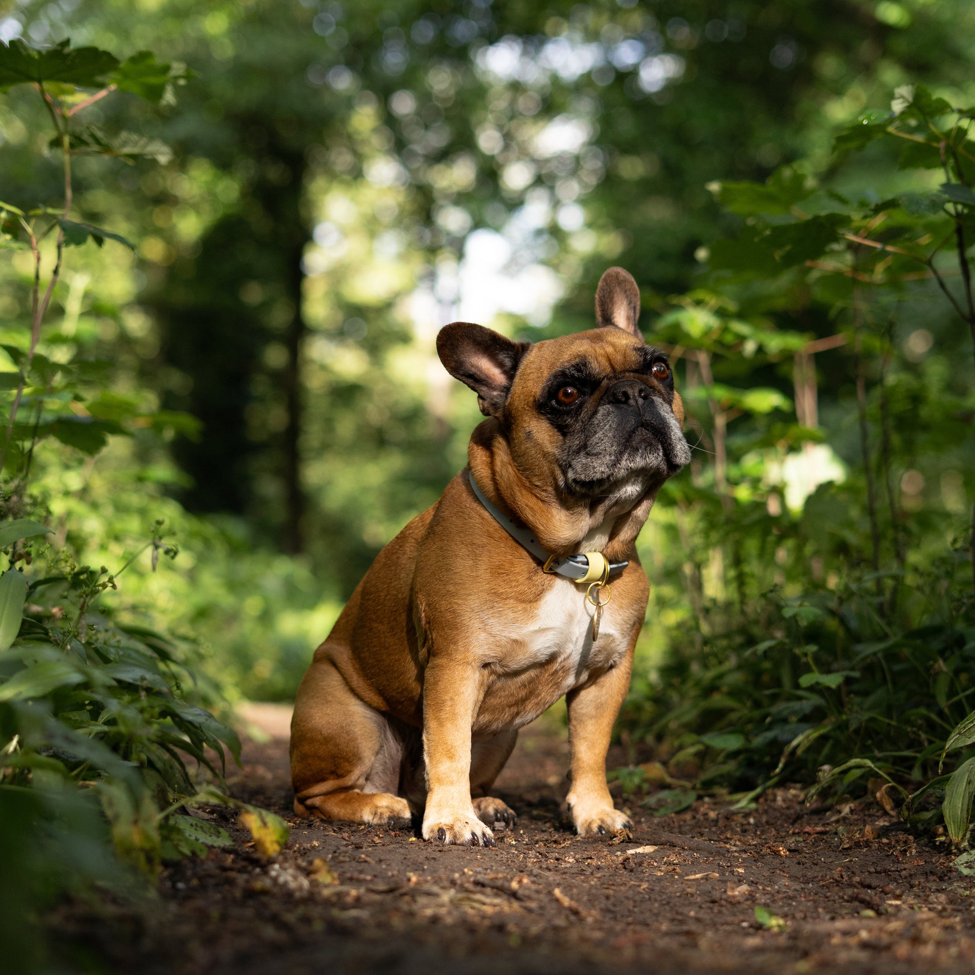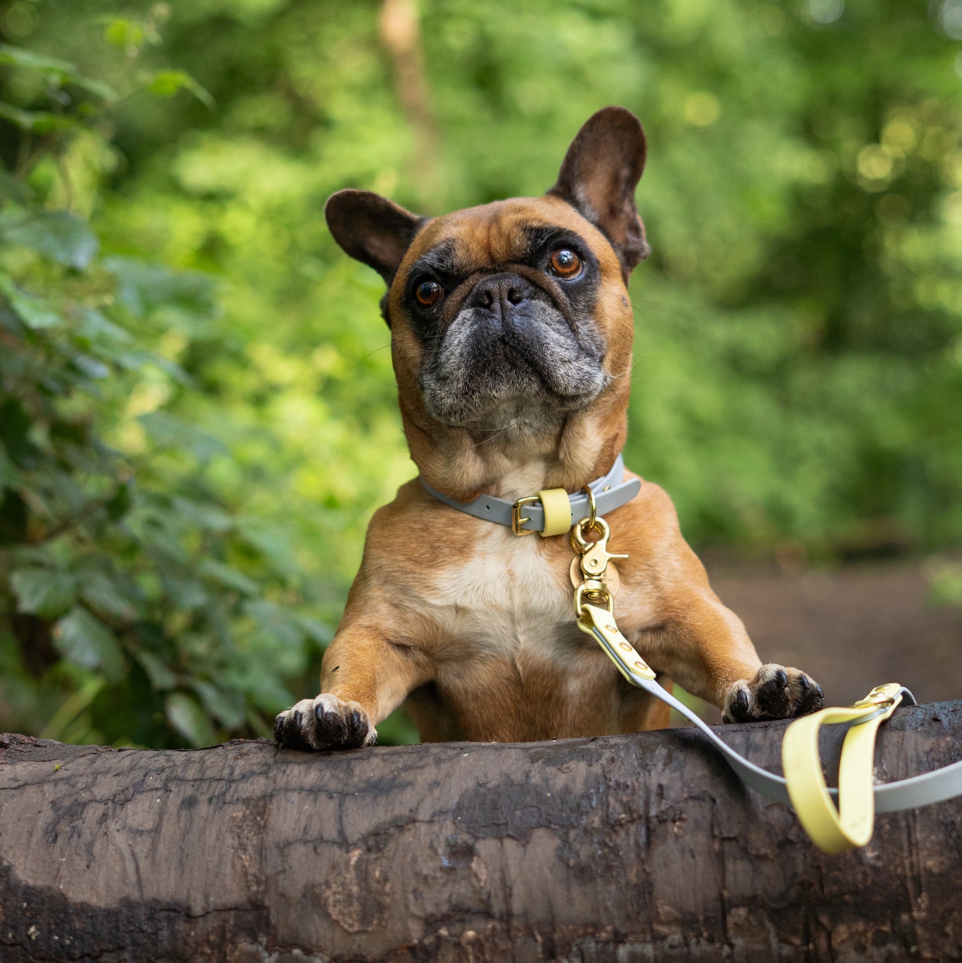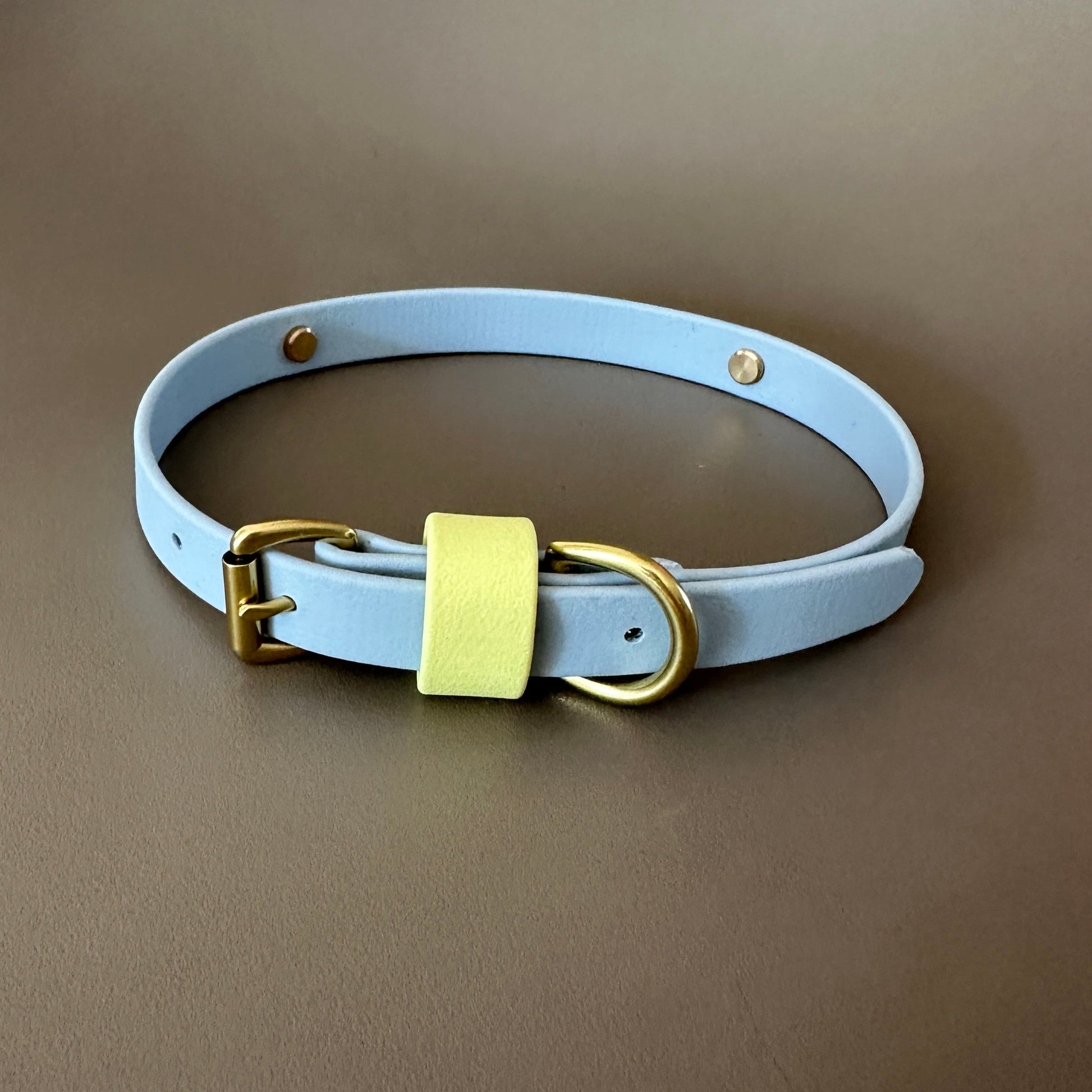 Our Powder Blue as the main colour with a highlight of Lemonade on the keeper and band. Designed & worn by handsome customer Arlo the Frenchie.