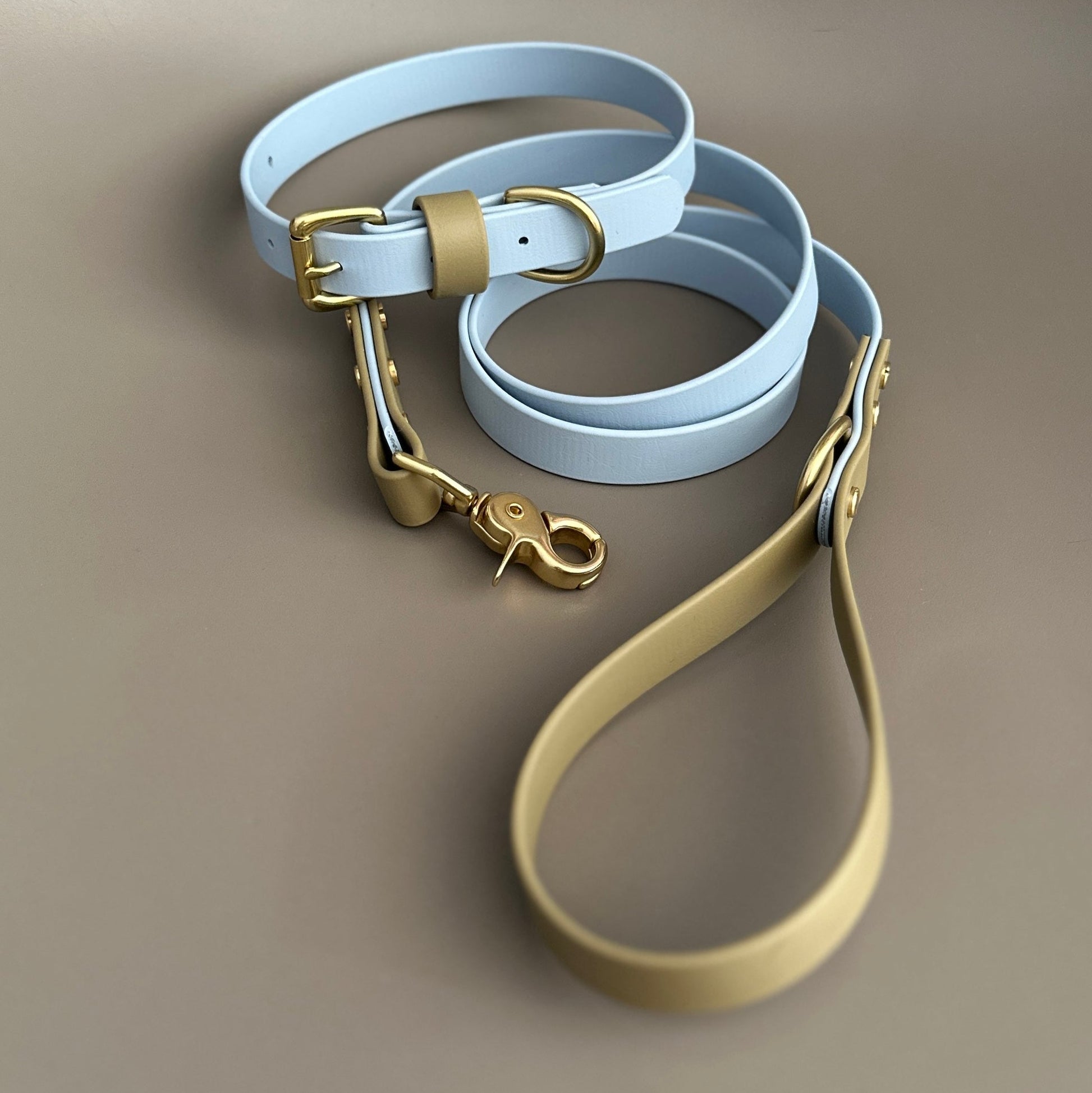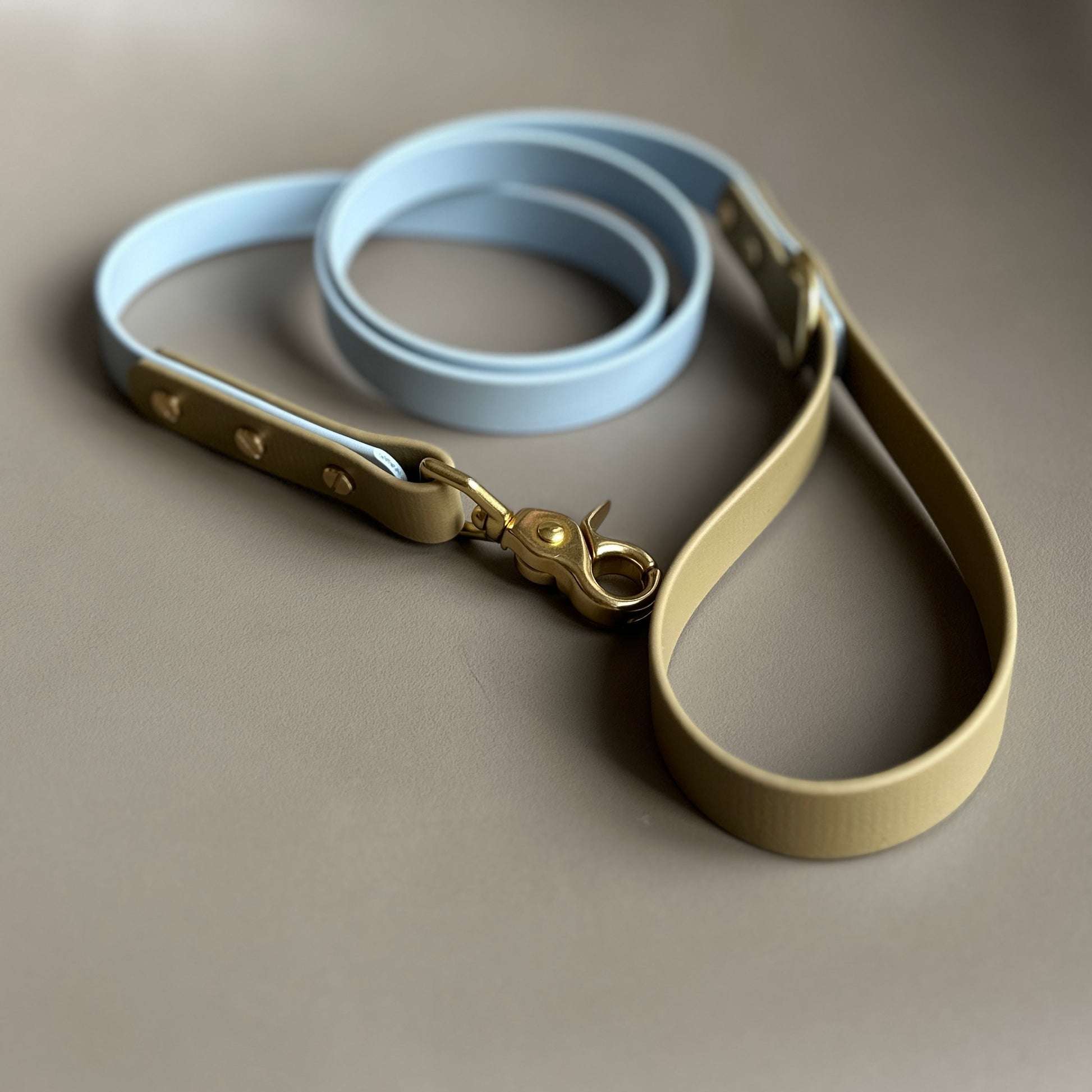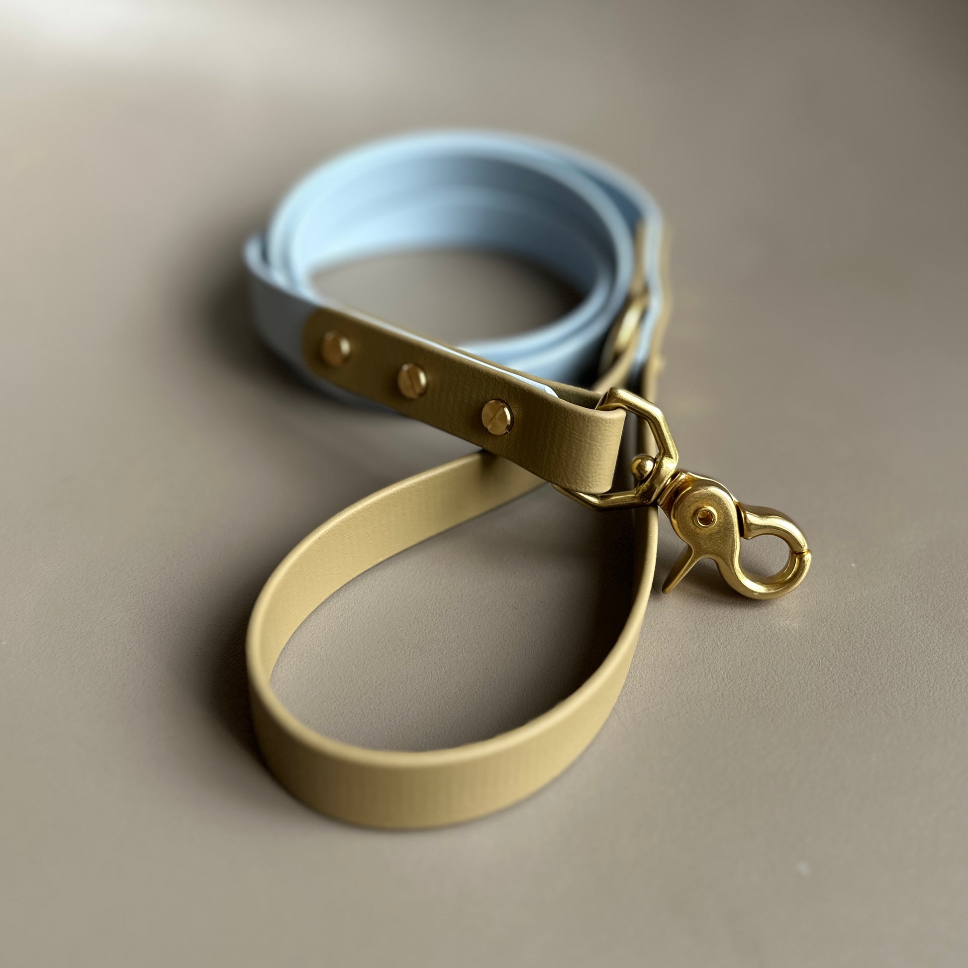 Our handmade collars and leads are made of BioThane®, a very strong rubber coated webbing that has a soft pliable leather like look and feel.  BioThane® is water resistant, mould resistant, odour resistant, anti-bacterial and easy to keep clean. The ideal material for any active pup, especially if your dog likes a swim or gets very dirty during their walks, simply wipe it clean afterwards and it will be as good as new.