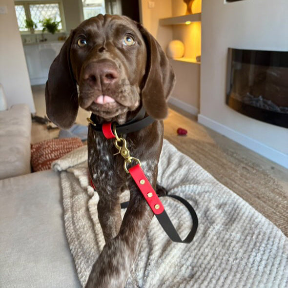 Our Black as the main colour with a highlight of Red. Designed and worn by handsome customer Enzo the German Shorthaired Pointer.
