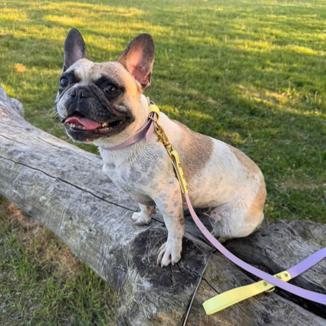 Our Lavender as the main colour with a highlight of Lemonade. Designed & worn by pretty customer Beans the French Bulldog.