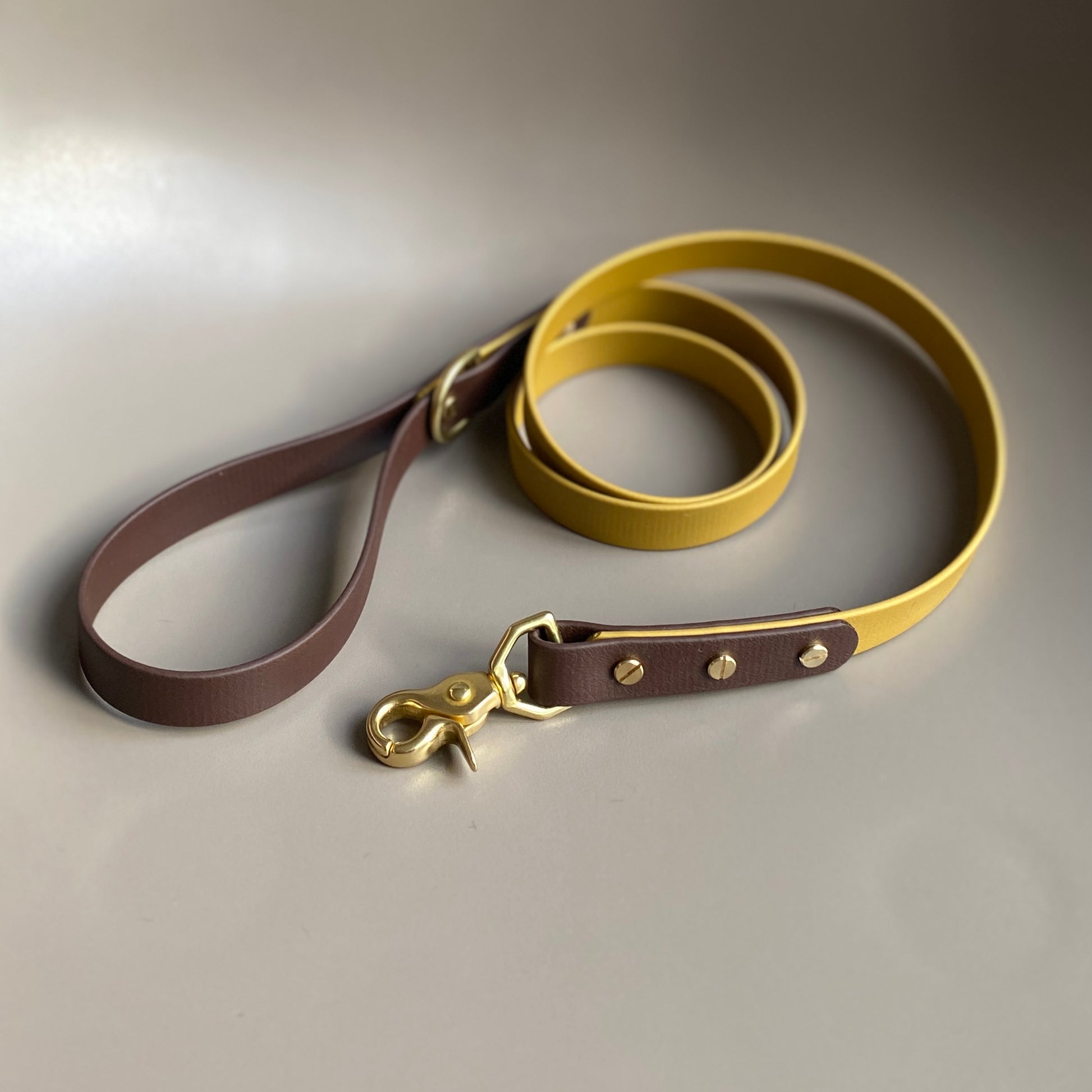 Our leads are 120cm (4ft) in length with a fixed solid brass d-ring at the handle loop to attach poo bags or other accessories. All our leads come with solid brass trigger clasps as standard.