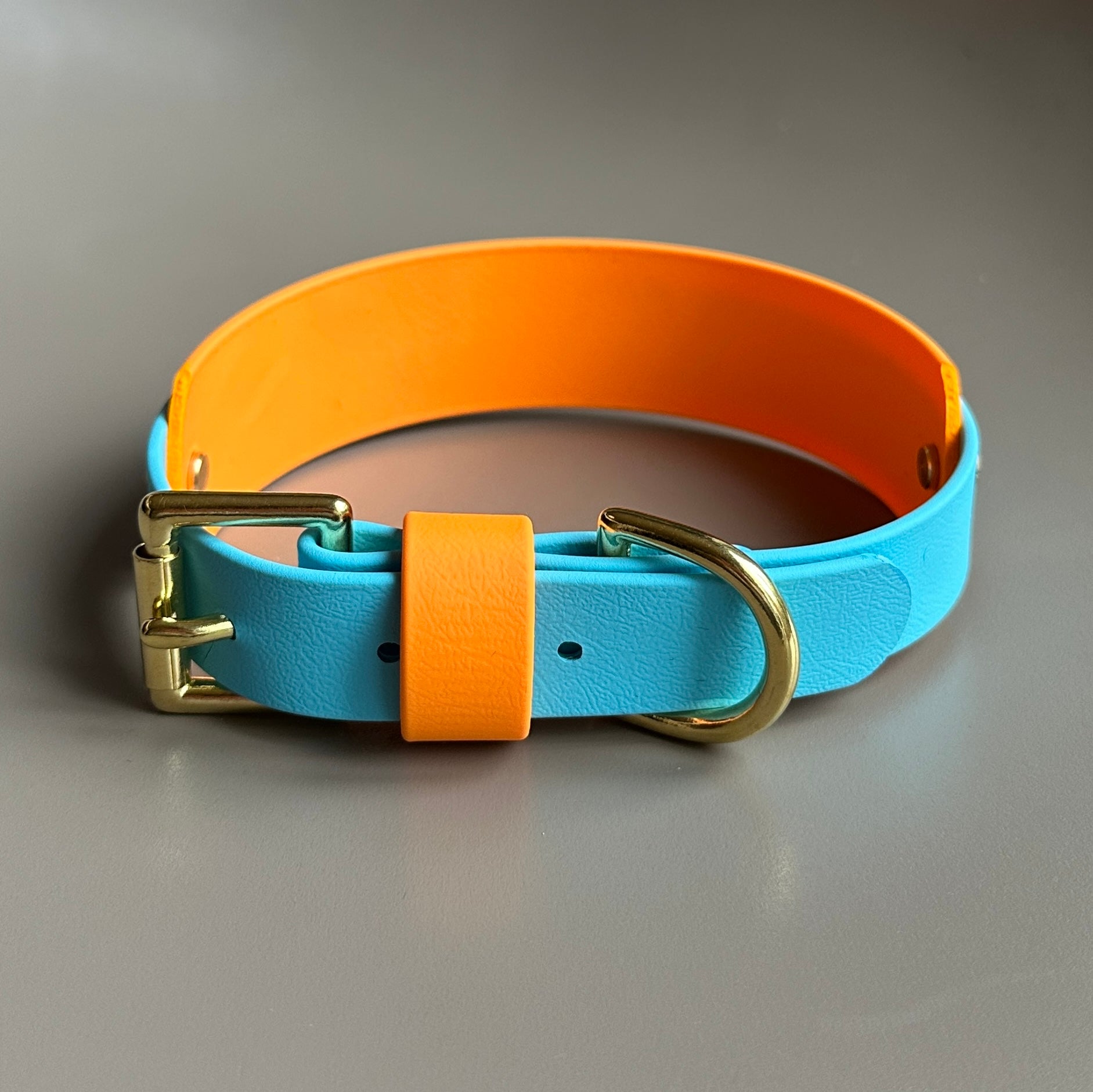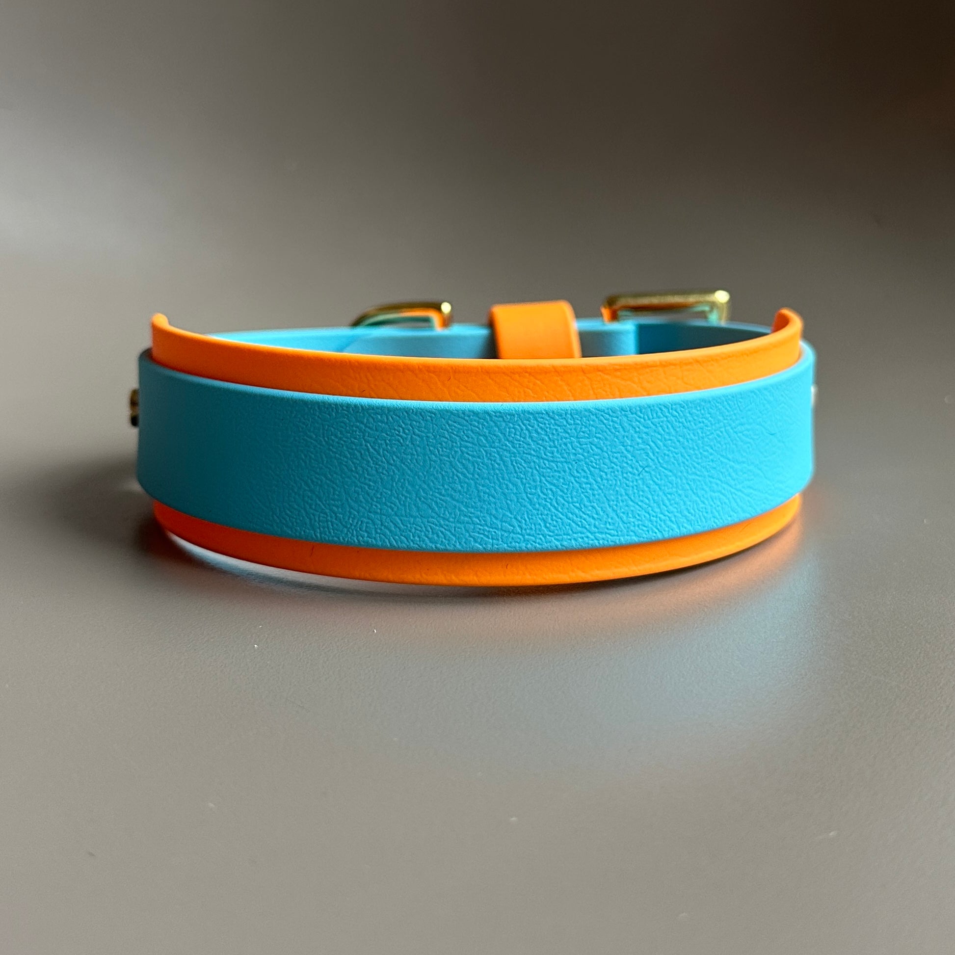 Our Hound Style Collar in Sky Blue with a wide band and keeper in Orange. Designed and worn by handsome customer Hendrix the German Shorthaired Pointer.
