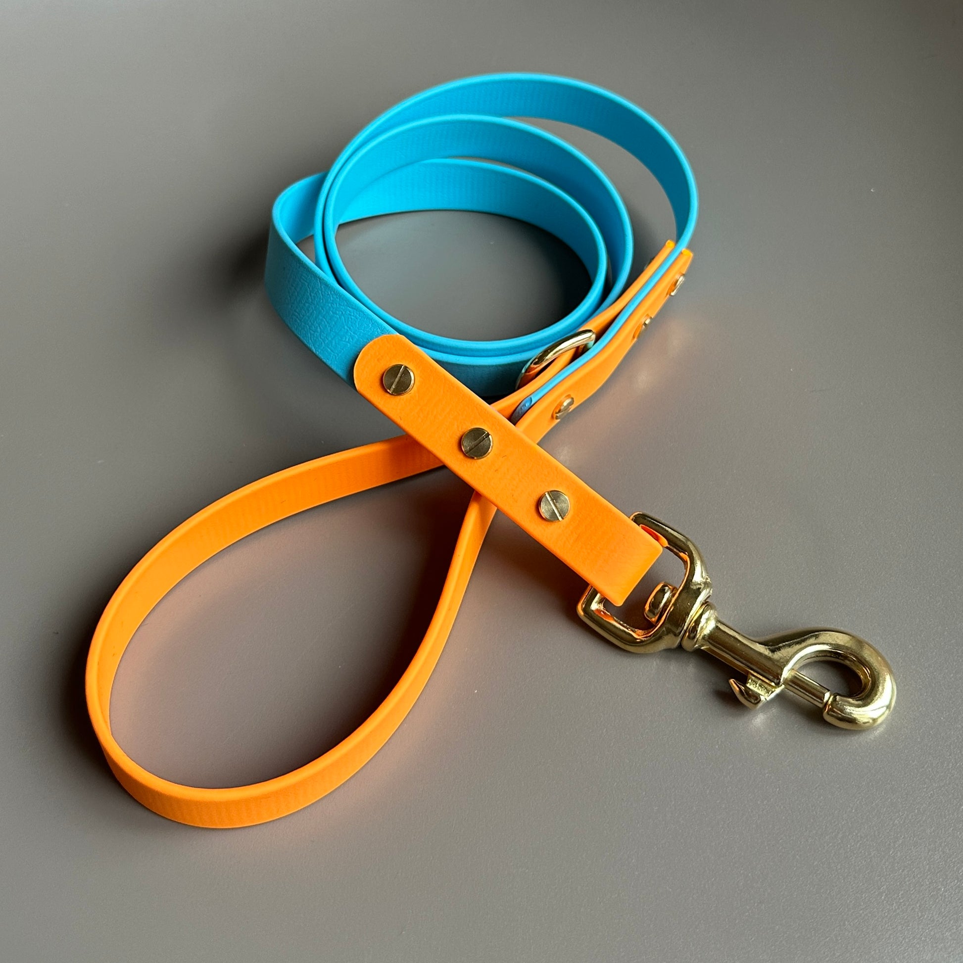 Our Sky Blue as the main colour with a highlight of Orange. Designed & worn by gorgeous customer Hendrix the German Shorthaired Pointer.