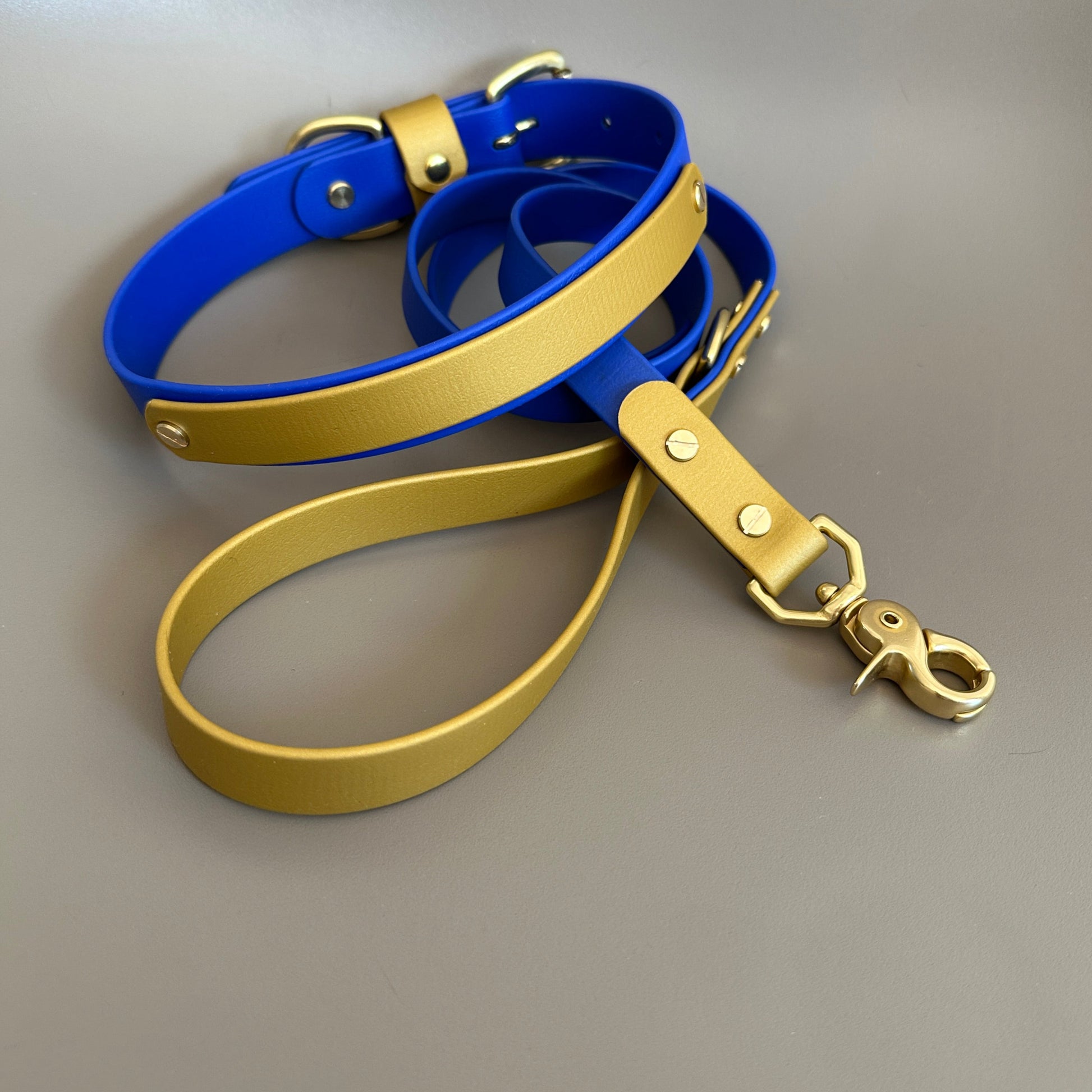 Our handmade collars and leads are made of BioThane®, a very strong rubber coated webbing that has a soft pliable leather like look and feel.  BioThane® is water resistant, mould resistant, odour resistant, anti-bacterial and easy to keep clean. The ideal material for any active pup, especially if your dog likes a swim or gets very dirty during their walks, simply wipe it clean afterwards and it will be as good as new.