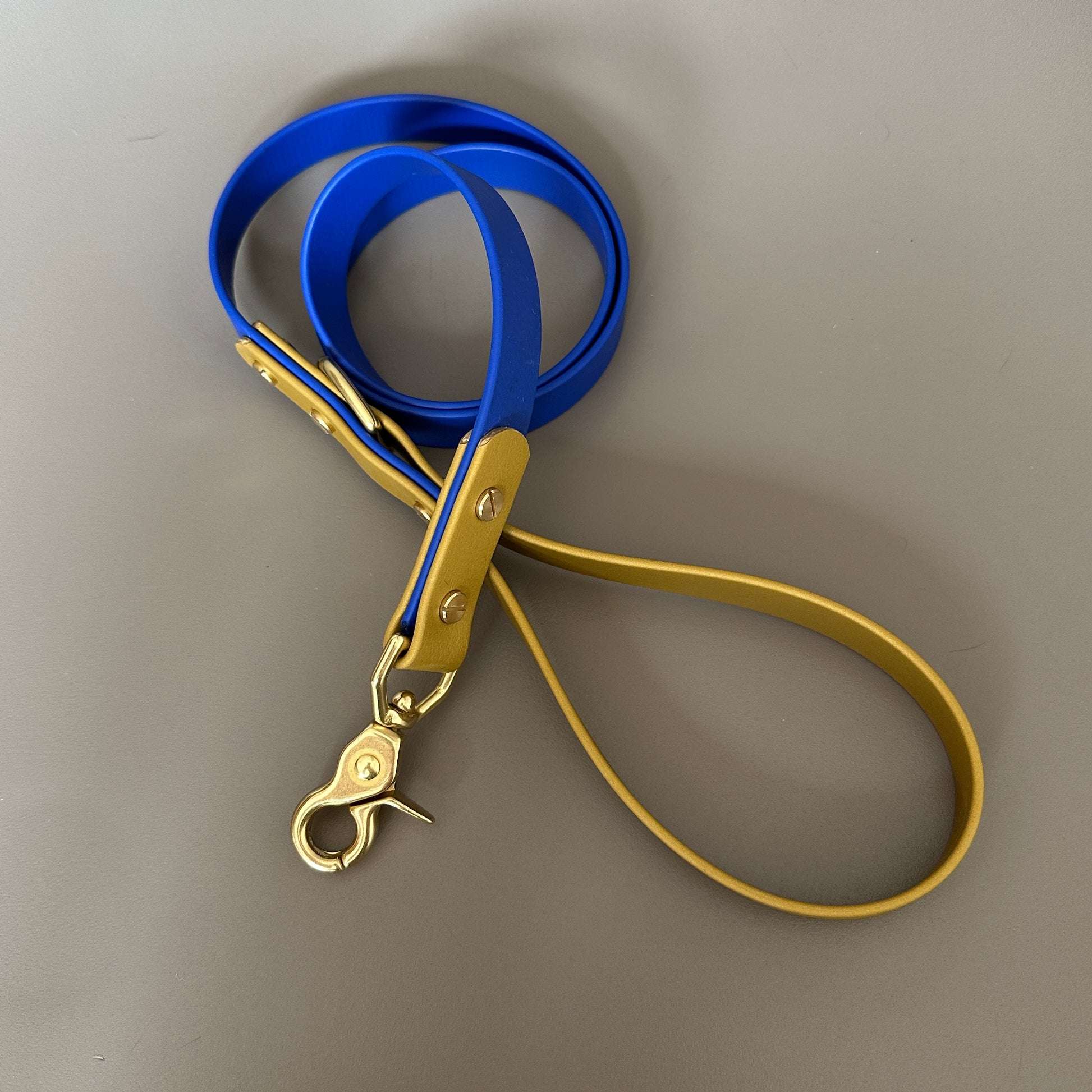 Our leads are 120cm (4ft) in length with a fixed solid brass d-ring at the handle loop to attach poo bags or other accessories. All our leads come with solid brass trigger clasps as standard.