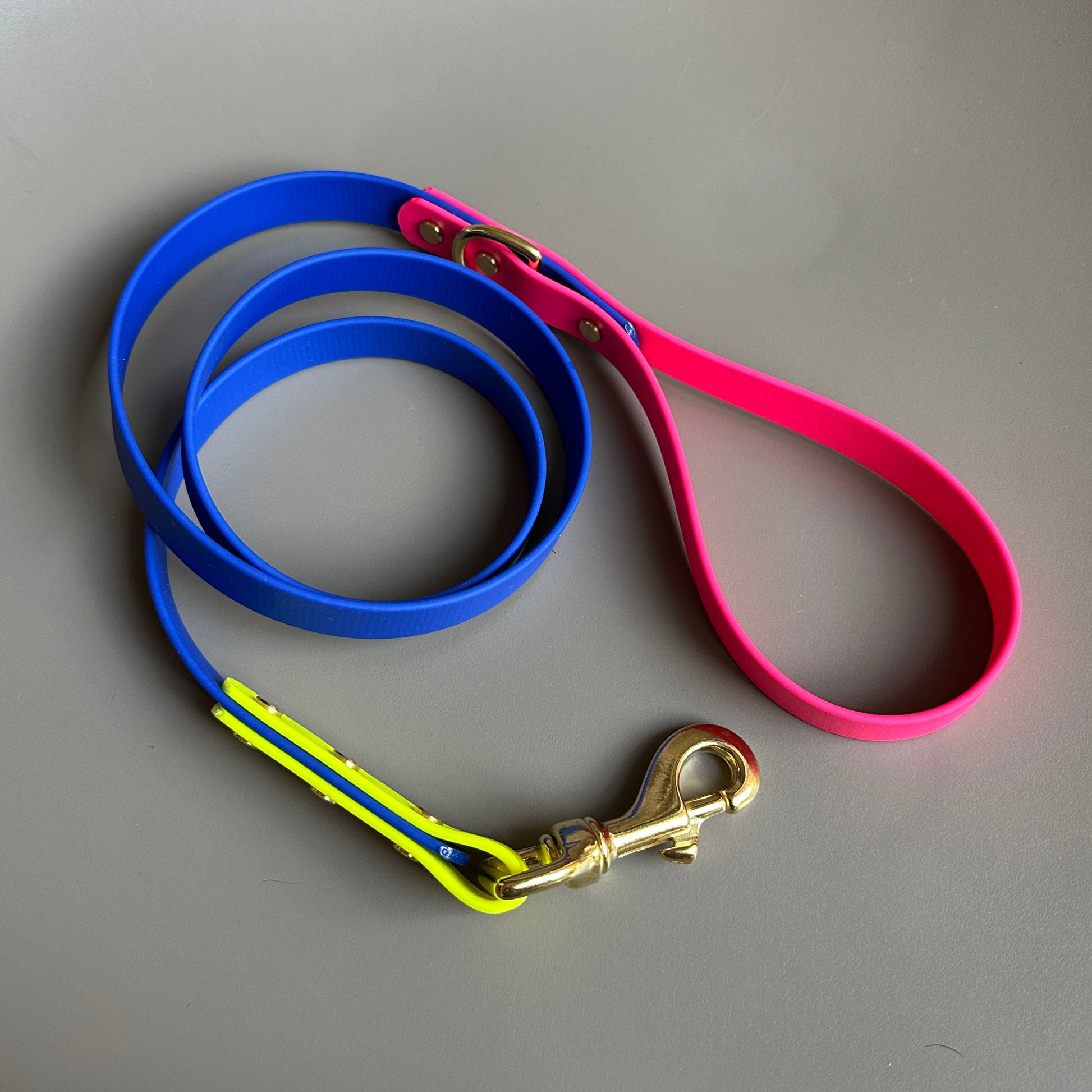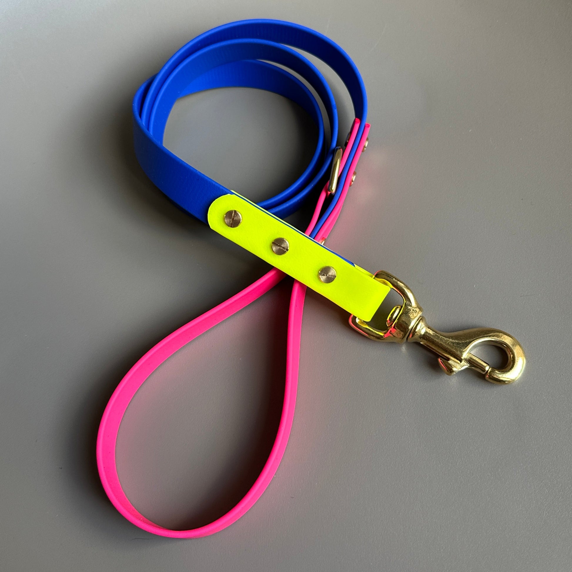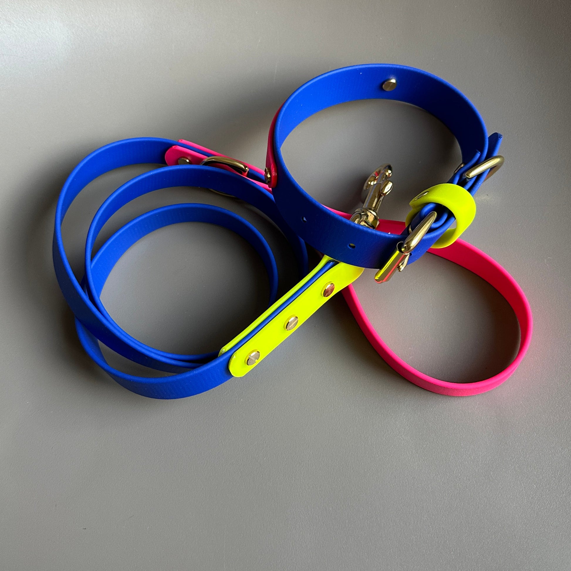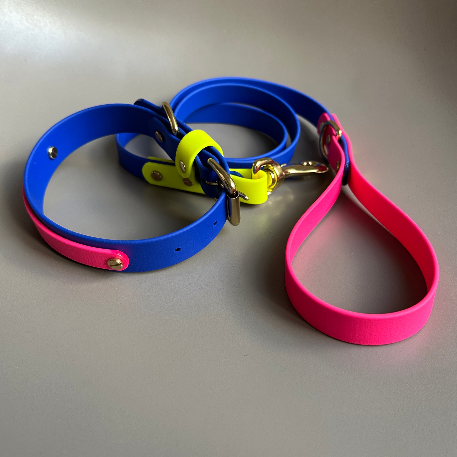 Our Primary Blue as the main colour with highlights of Neon Pink and Neon Yellow. Designed & worn by pretty customer Islay the Vizsla.