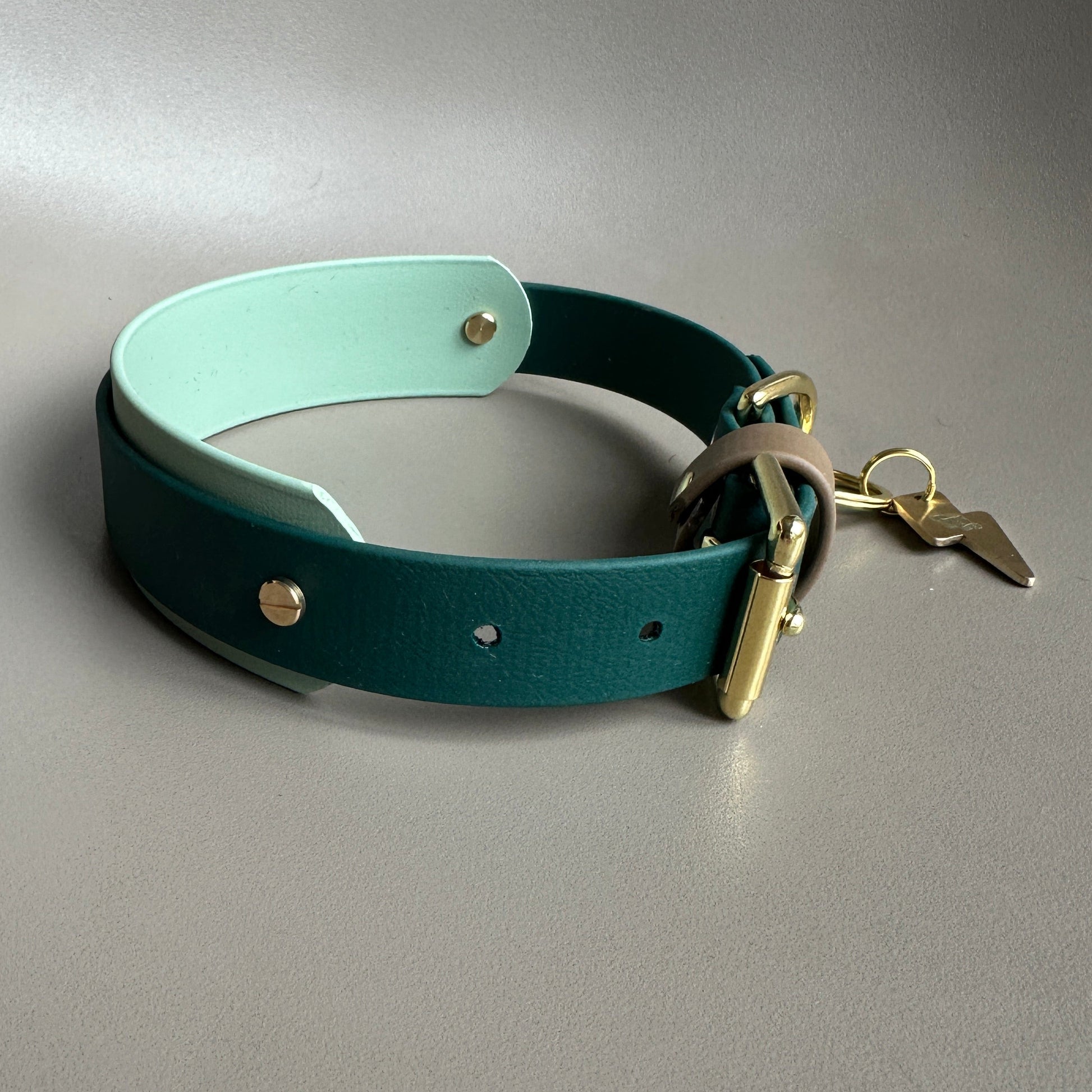 Our Hound Style Collar in Emerald with a wide band in Sage and a Mushroom keeper. Designed and worn by handsome customer Rupert the German Shorthaired Pointer.