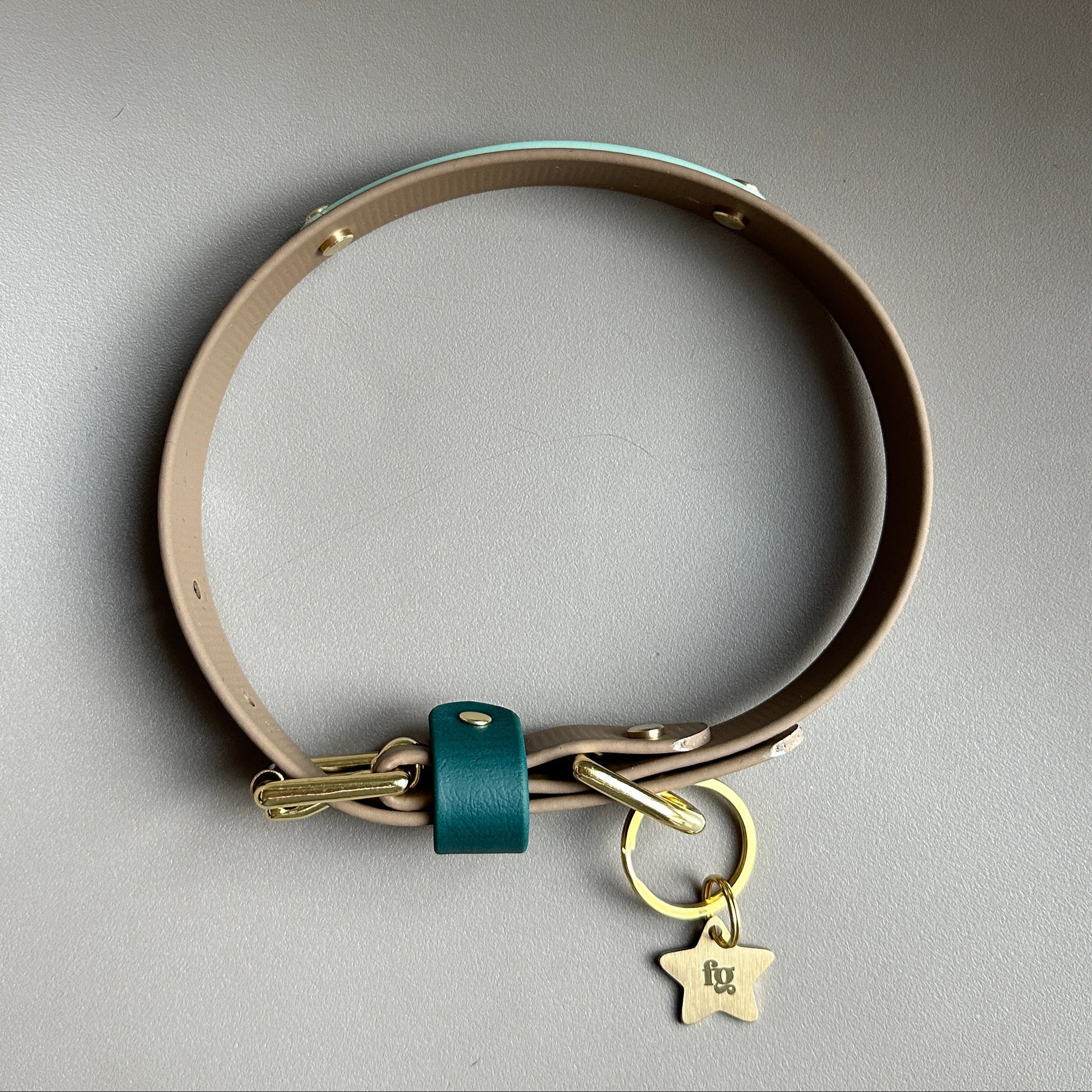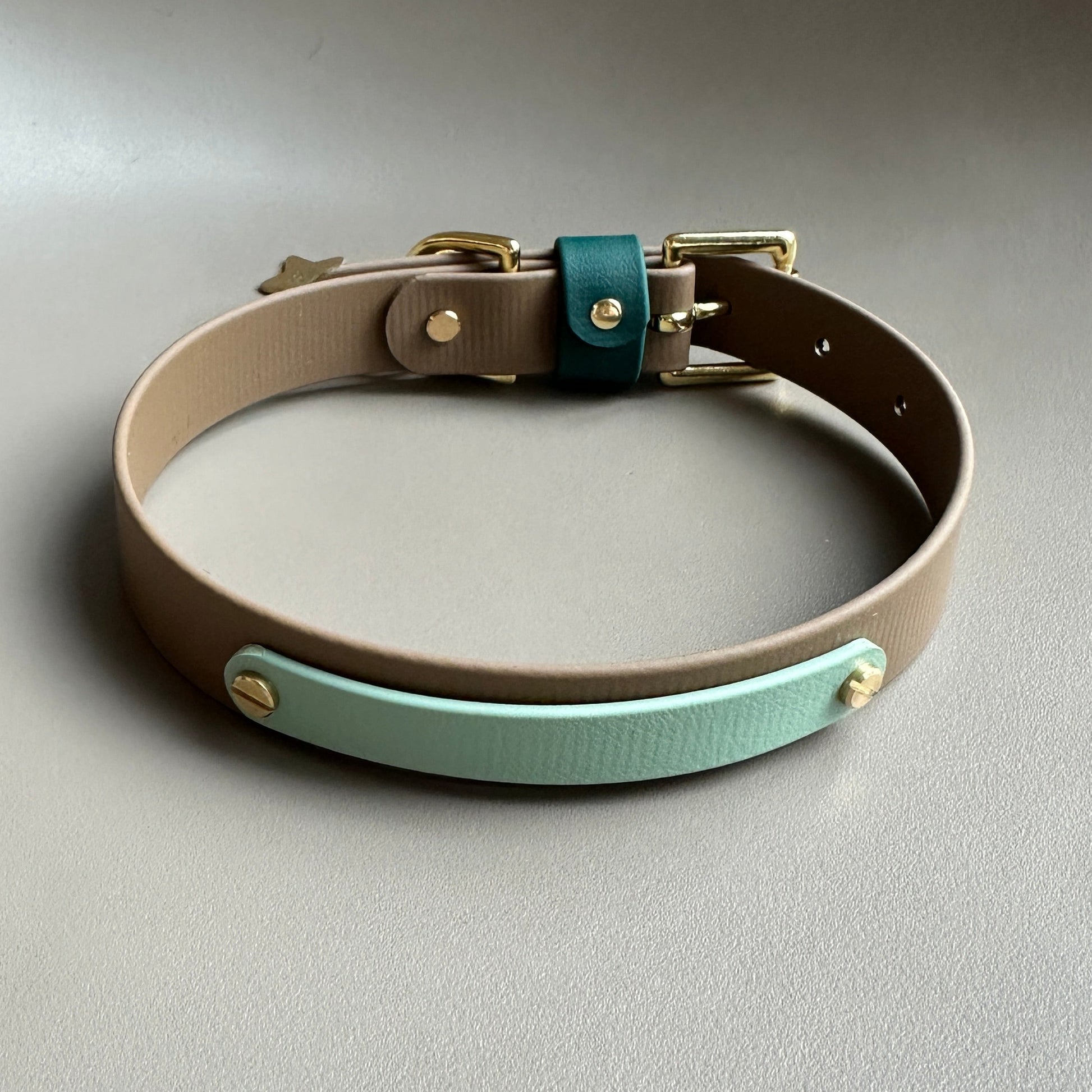 Mushroom as the main colour with a highlight of Emerald on the keeper and Sage on the back band. Designed and worn by gorgeous customer Rupert the German Shorthaired Pointer.