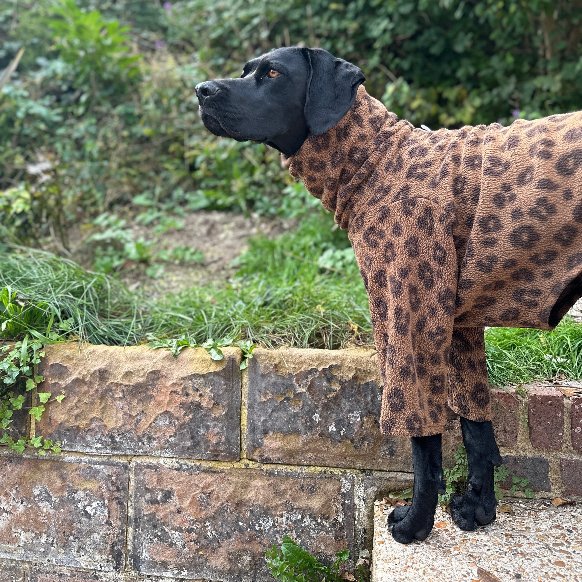 Whether you are looking for a suit for your dog to snuggle in at night, wear out and about or just keep for special occasions this exclusive leopard print is sure to turn heads AND keep your dog super cosy.