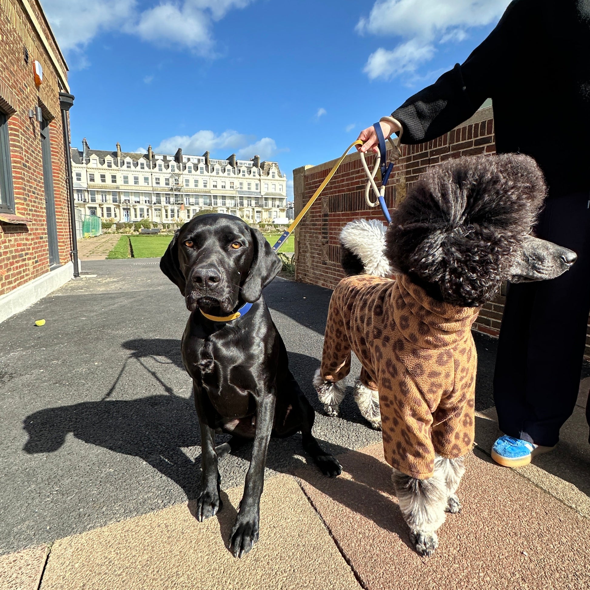 Sebastian our Poodle model in the photos is a Standard Poodle and wears size Large.