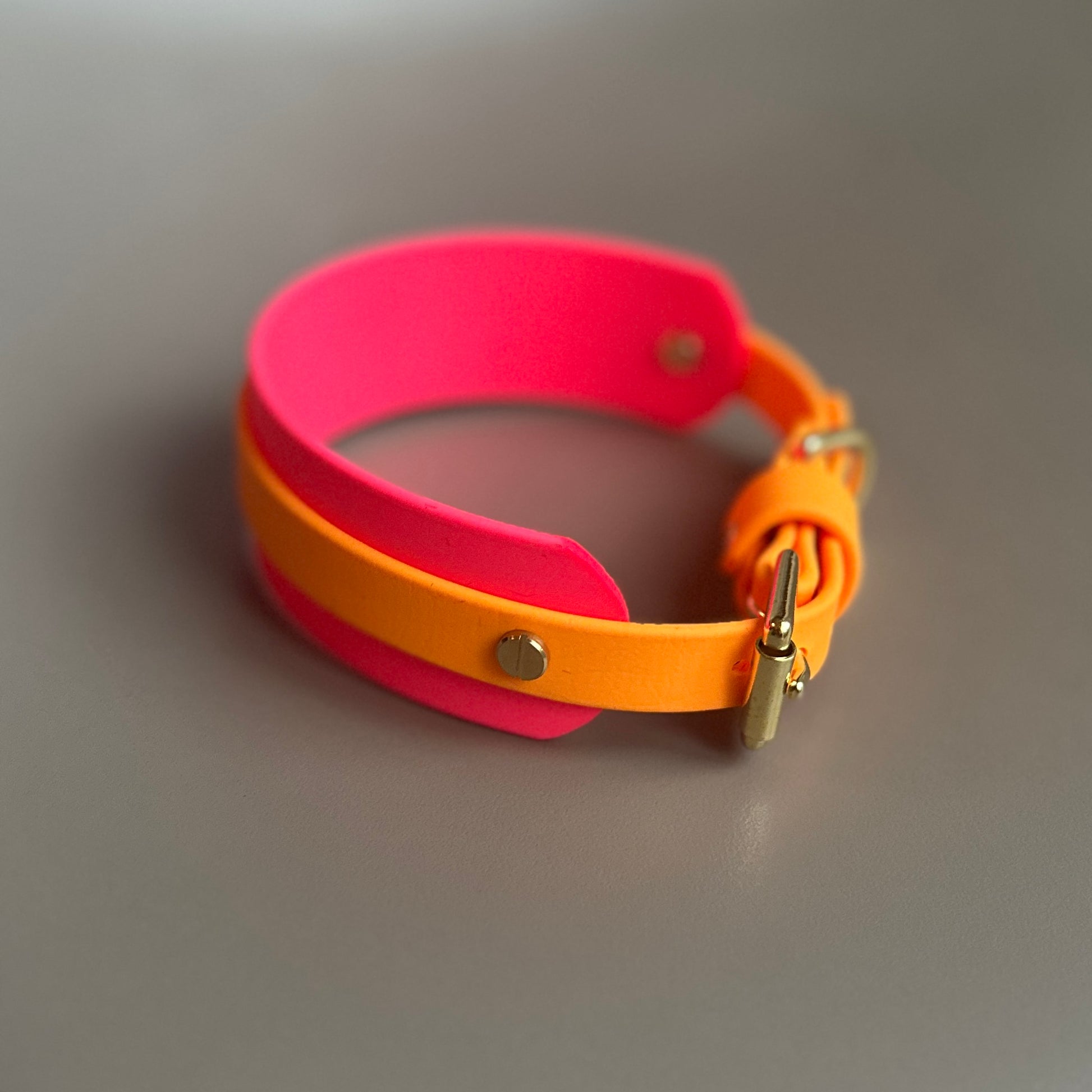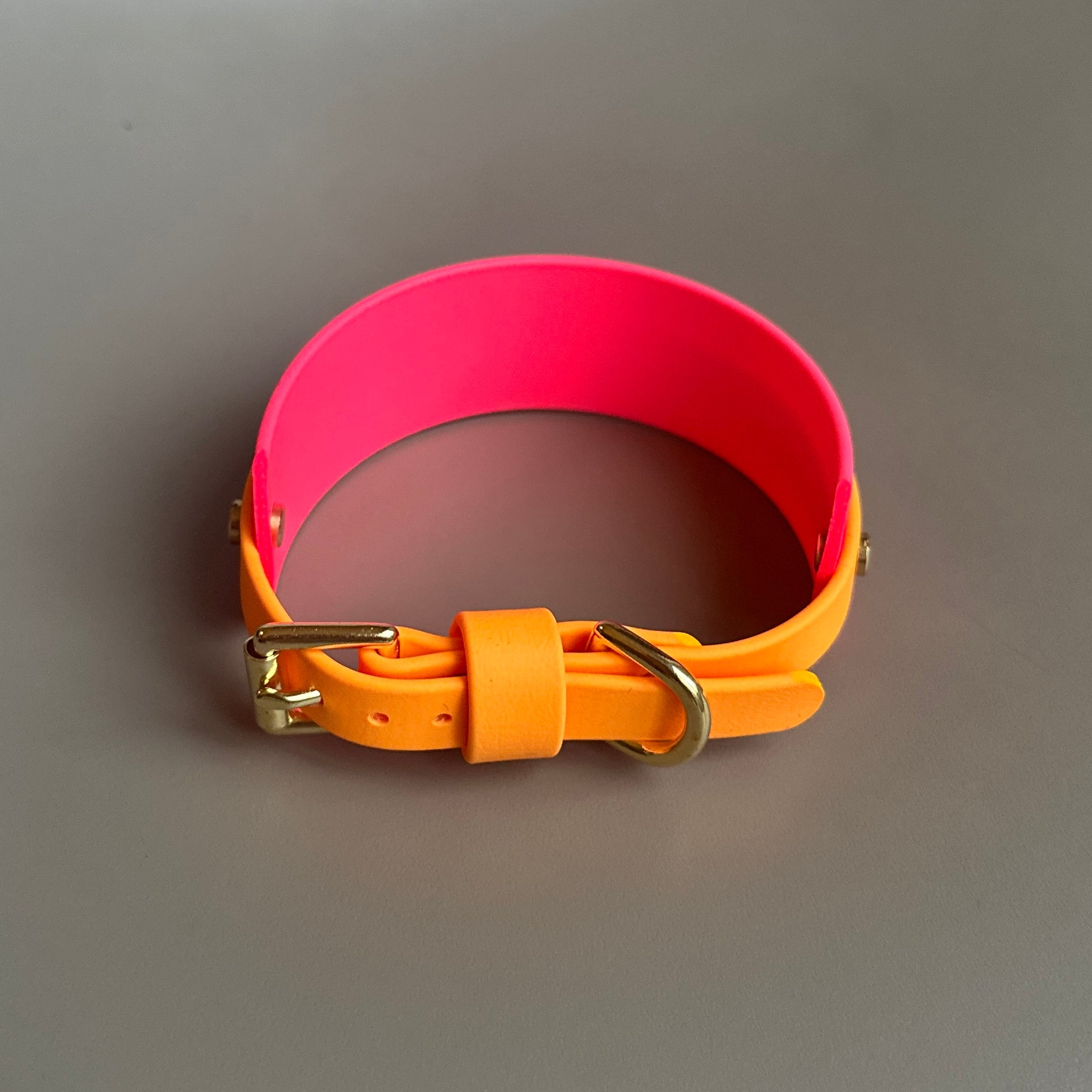 Our Hound Style Collar in Orange with a wide band in Neon Pink designed and worn by beautiful customer Macy the Greyhound.