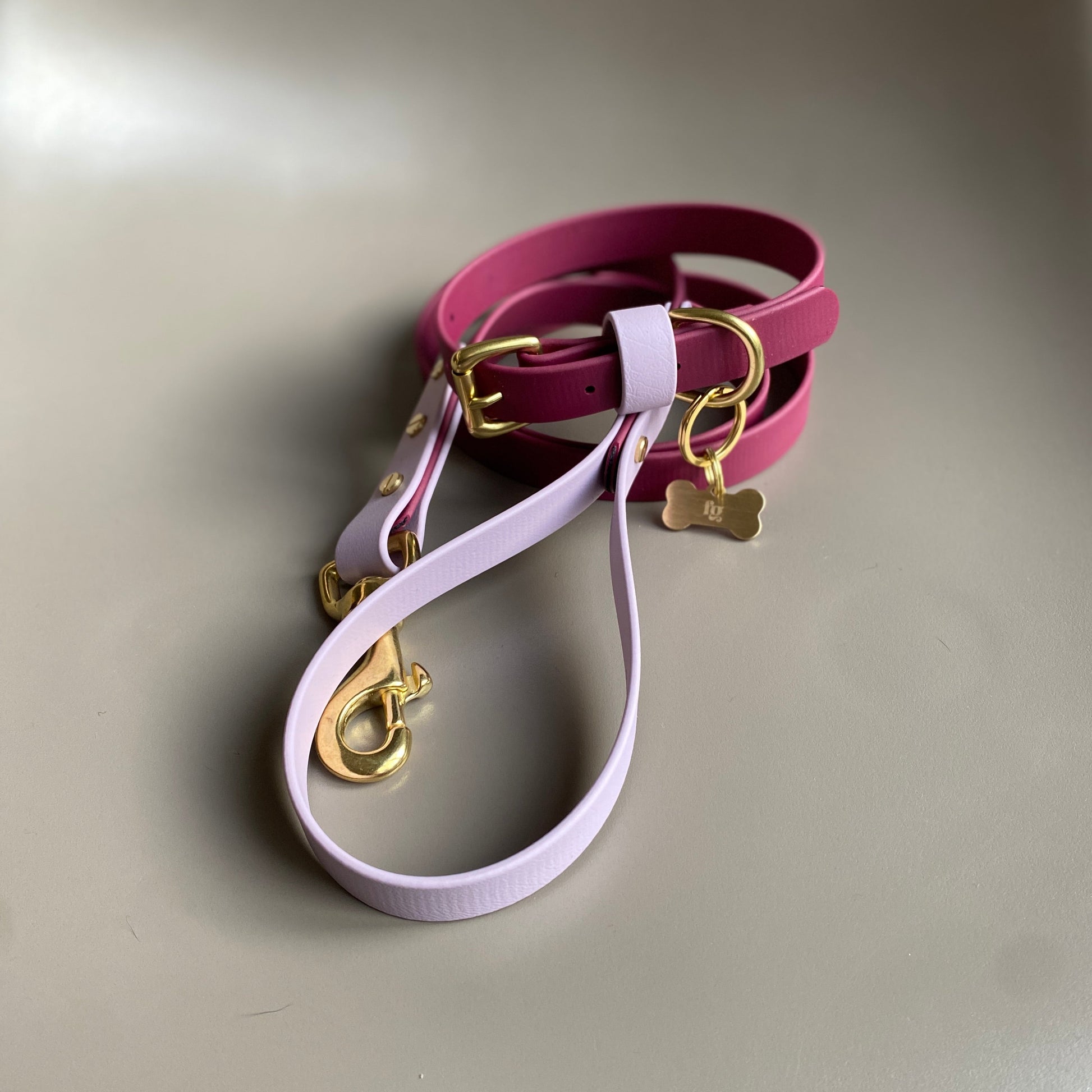 Our handmade collars and leads are made of BioThane®, a very strong rubber coated webbing that has a soft pliable leather like look and feel. BioThane® is water resistant, mould resistant, odour resistant, anti-bacterial and easy to keep clean. The ideal material for any active pup, especially if your dog likes a swim or gets very dirty during their walks, simply wipe it clean afterwards and it will be as good as new.