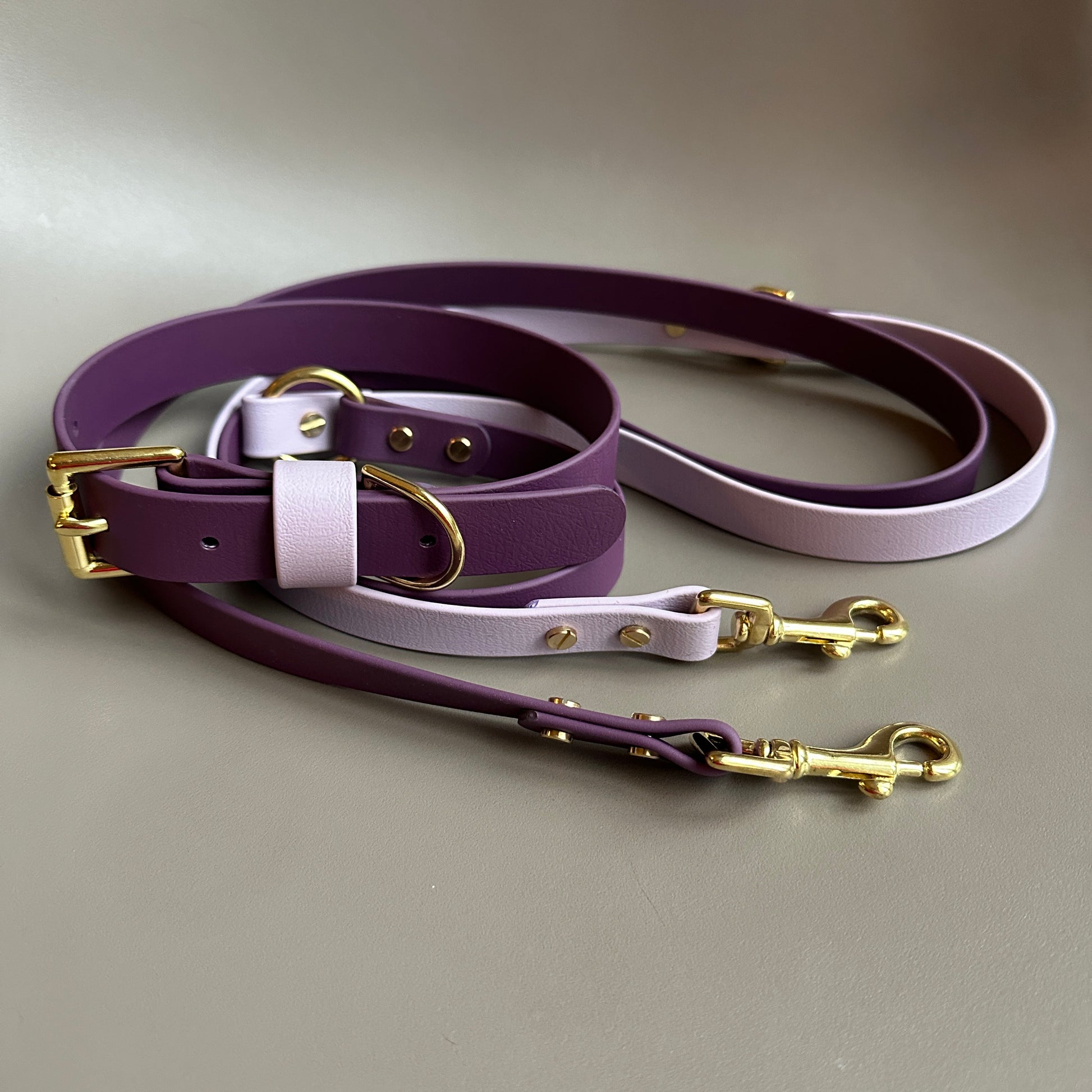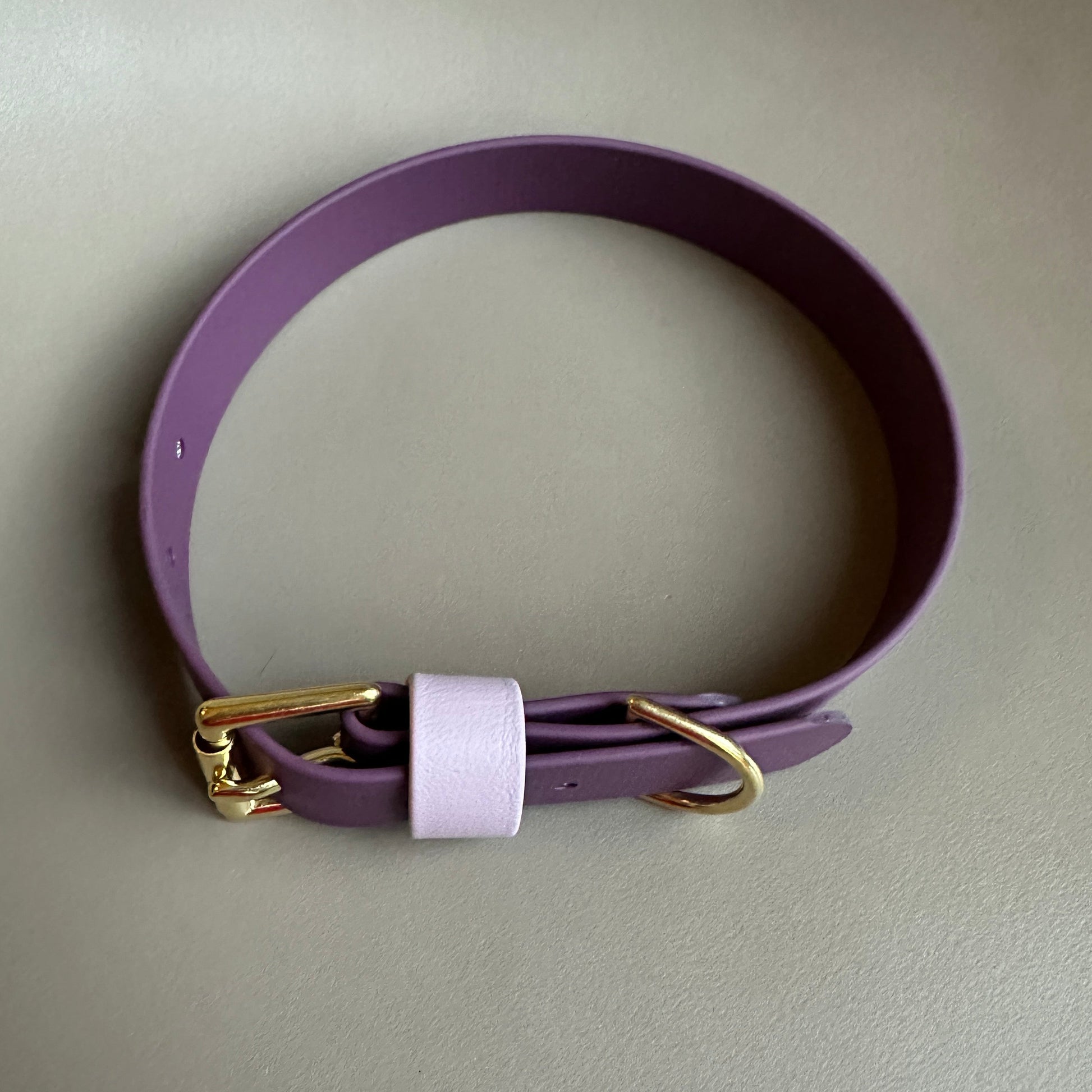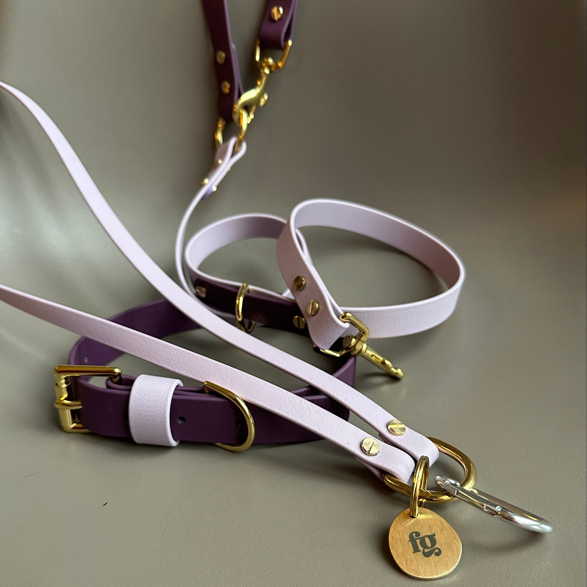 Our beautiful Aubergine purple as the main colour with a highlight of Lavender on the keeper. Designed & worn by gorgeous customer Mindy the Golden Retriever.