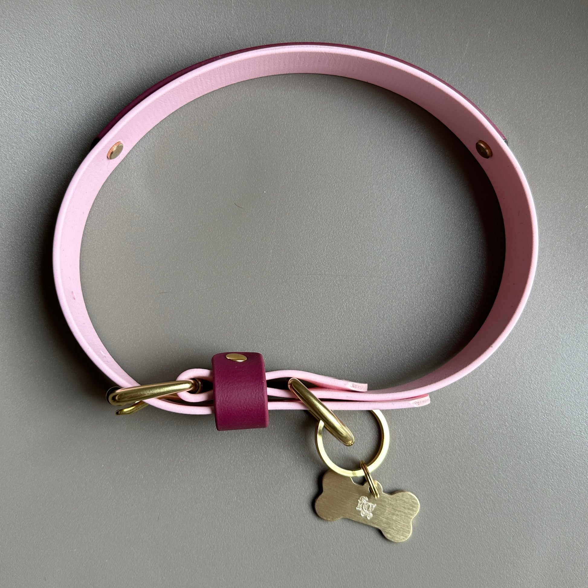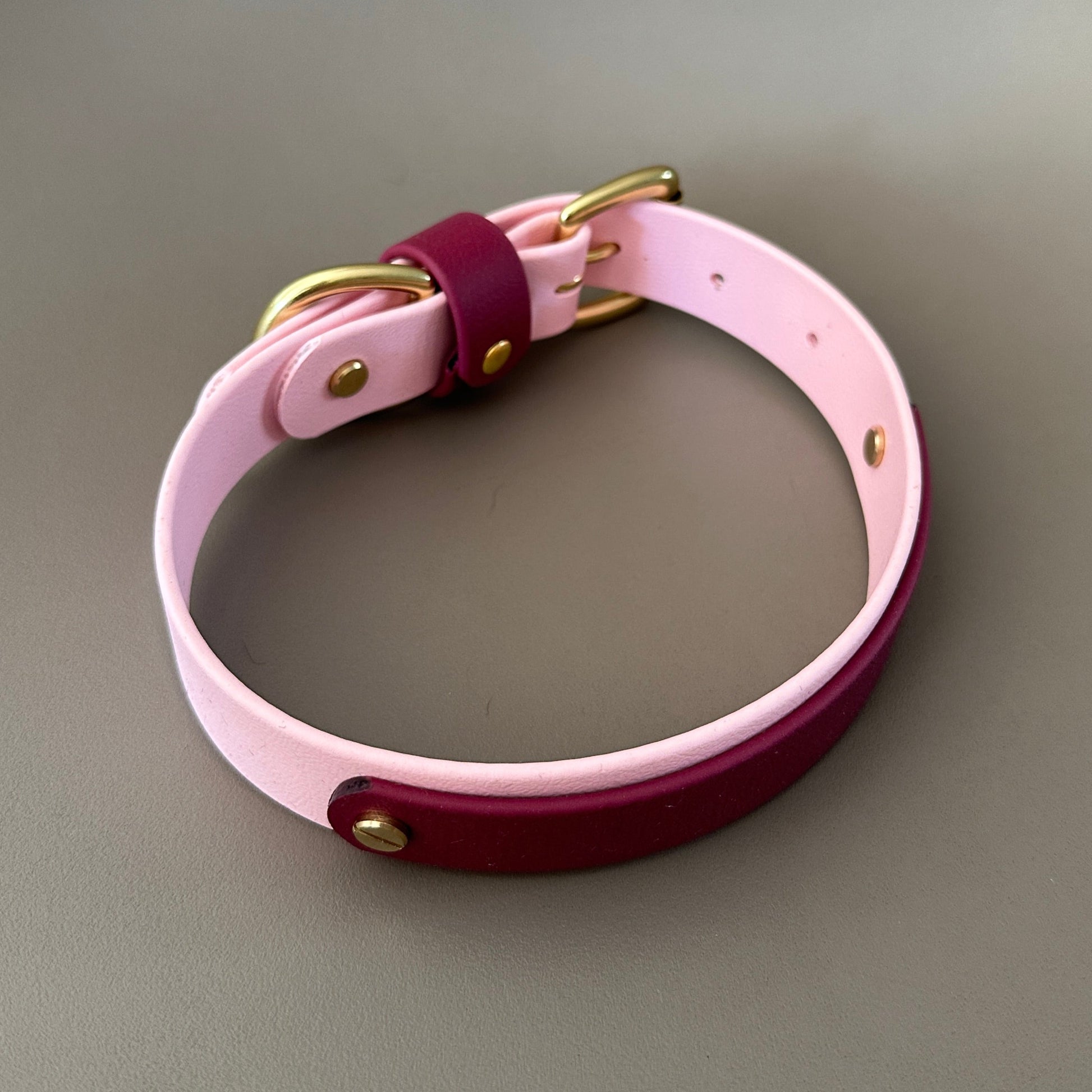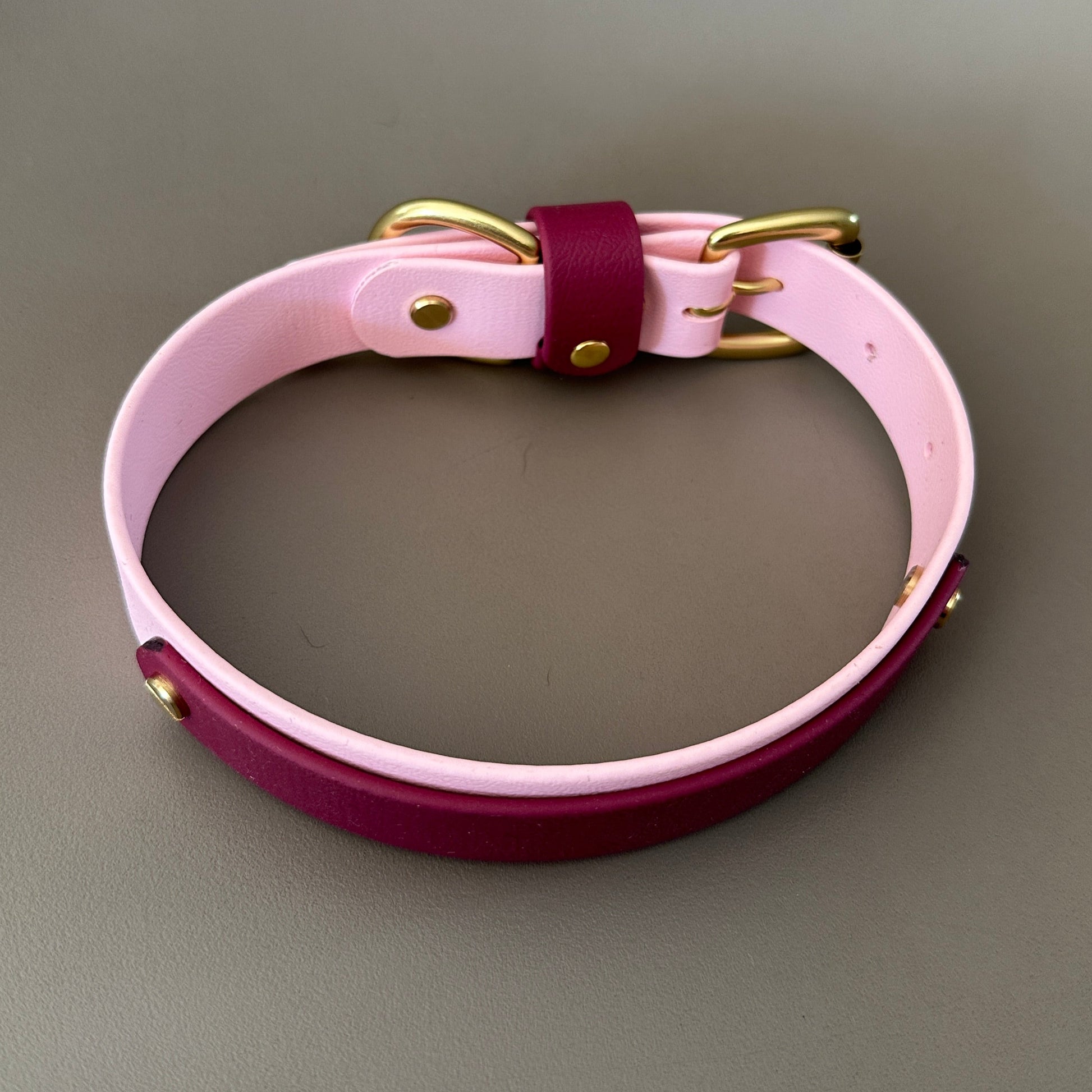 Our Pastel Pink as the main colour with a highlight of Wine on the keeper and band. Designed & worn by pretty customer Mellie the Doberman.