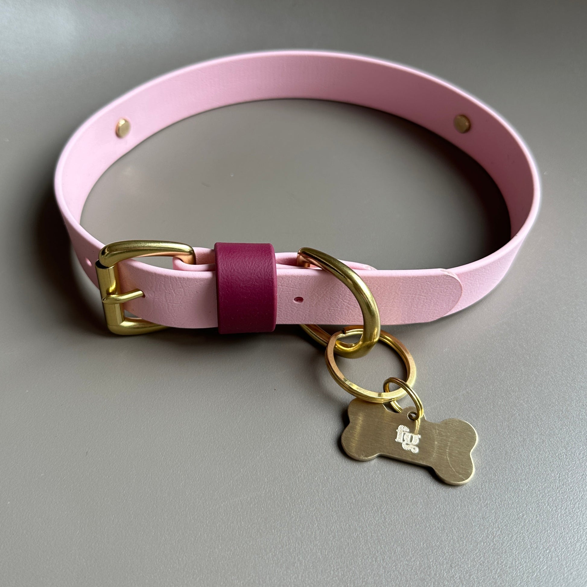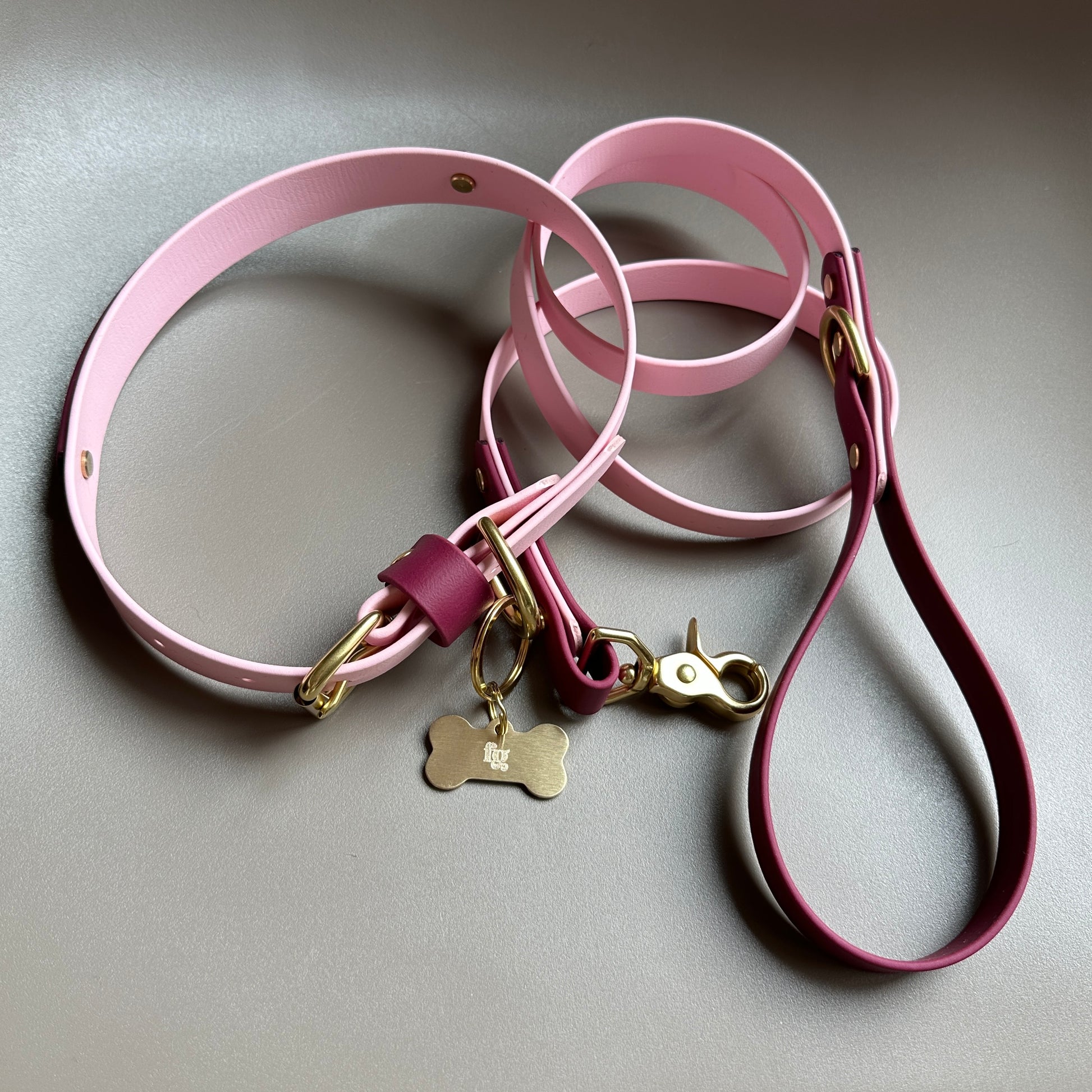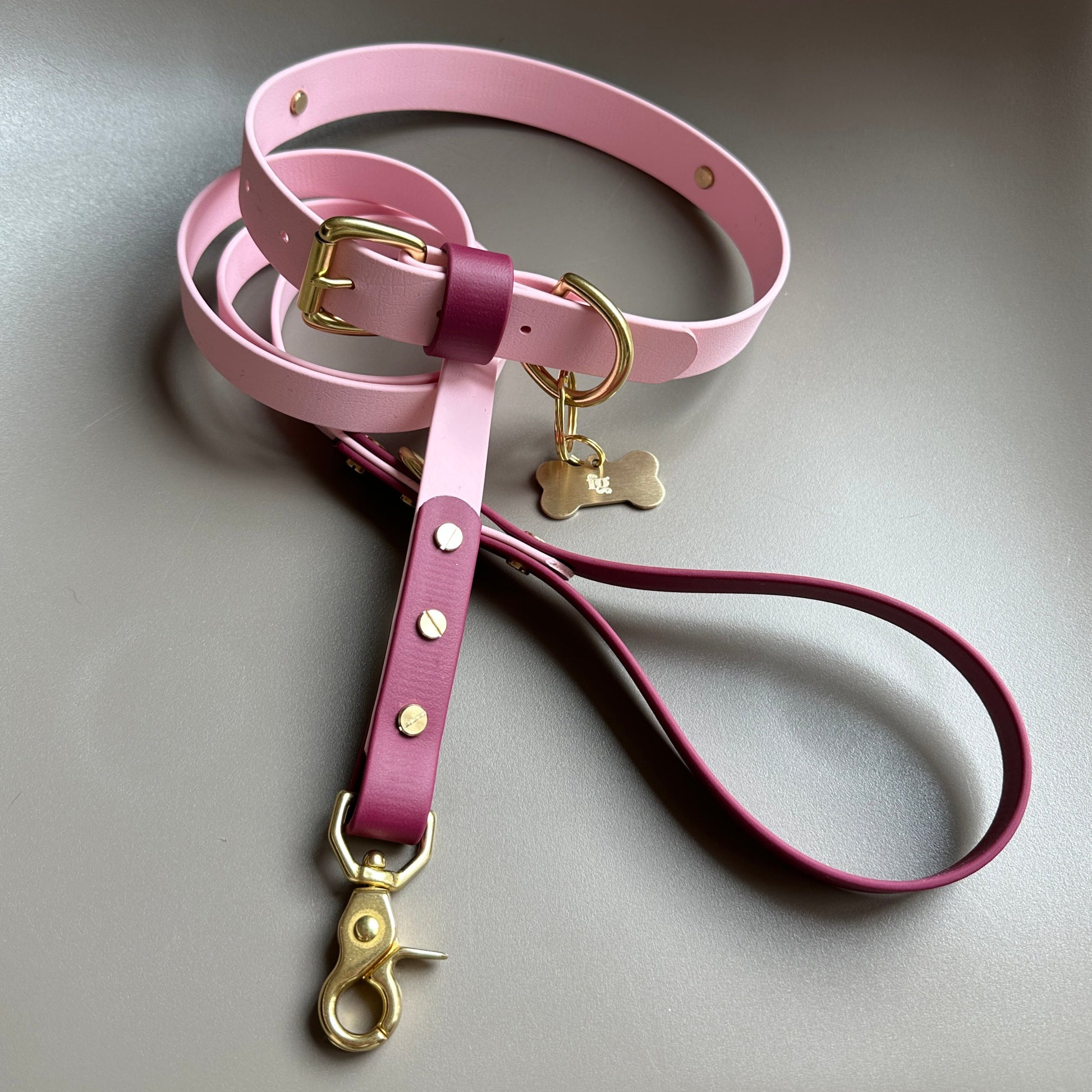 Our Pastel Pink as the main colour with a highlight of Wine on the keeper and band. Designed & worn by pretty customer Mellie the Doberman.