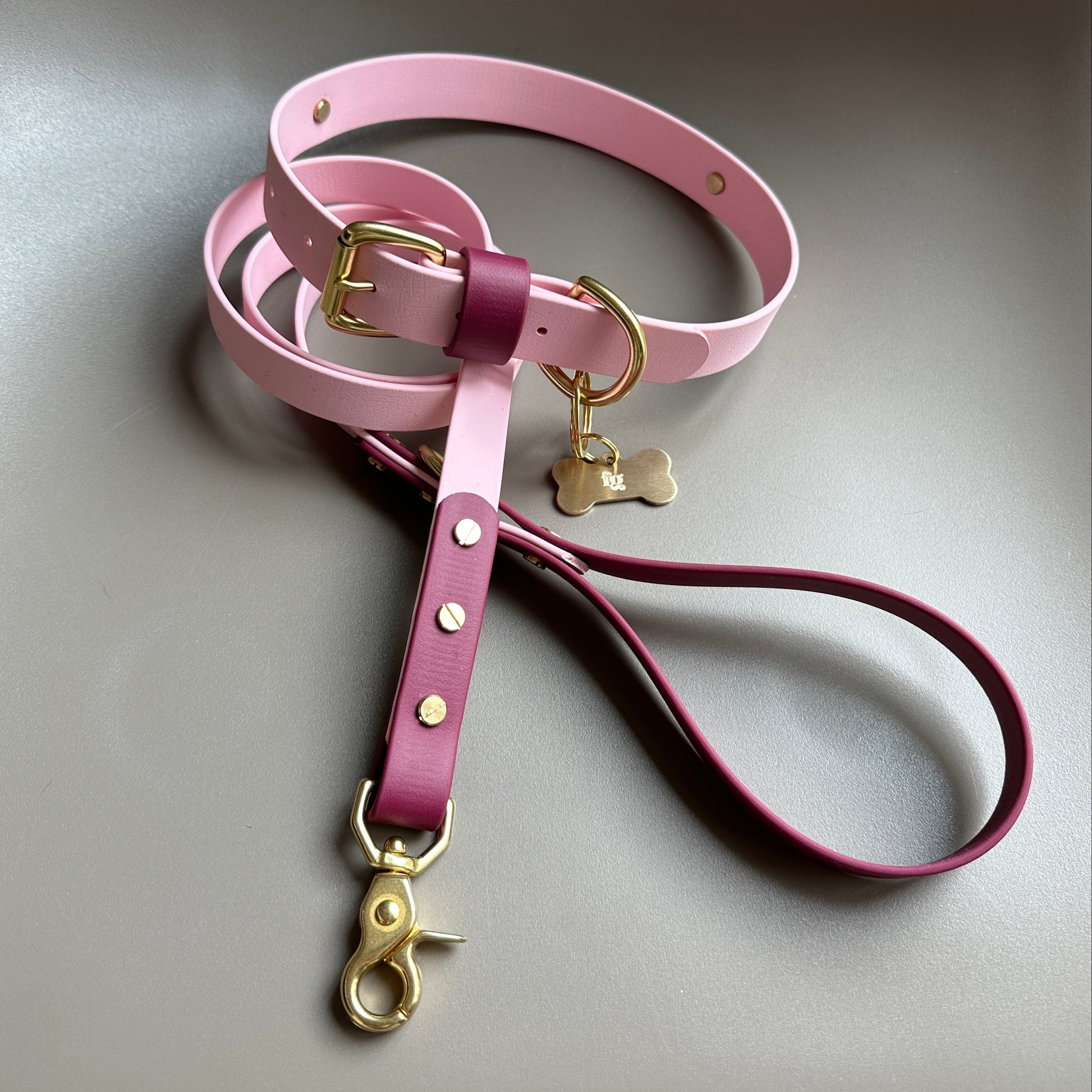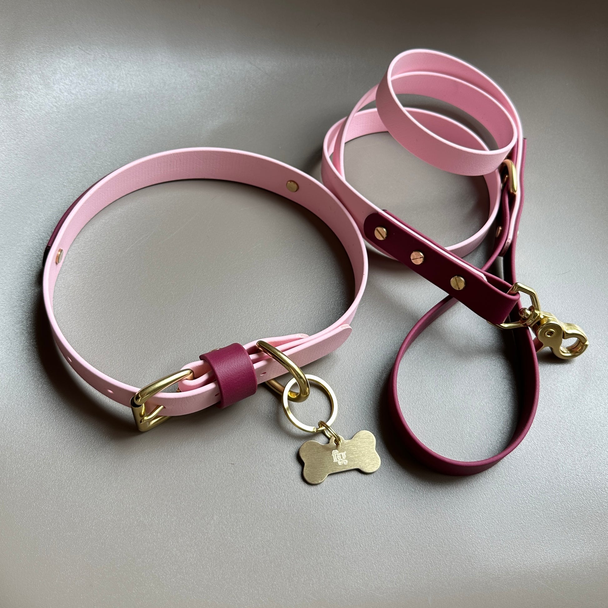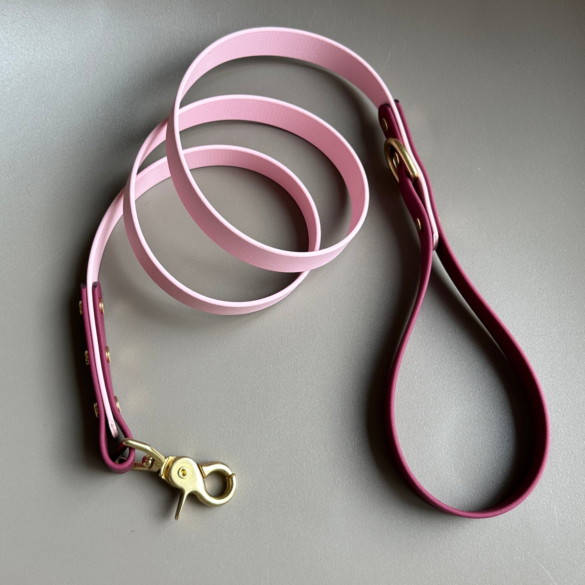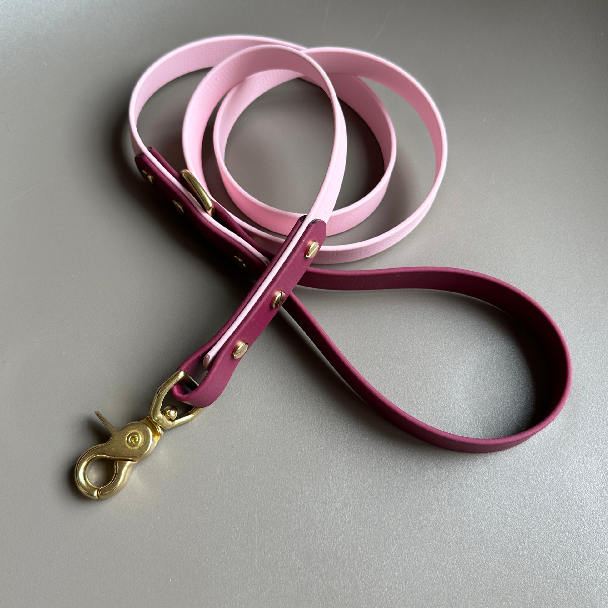 Our Pastel Pink as the main colour with a highlight of Wine. This lead matches our Mellie Berry Colourband Collar designed by customer Mellie the Dobermann.