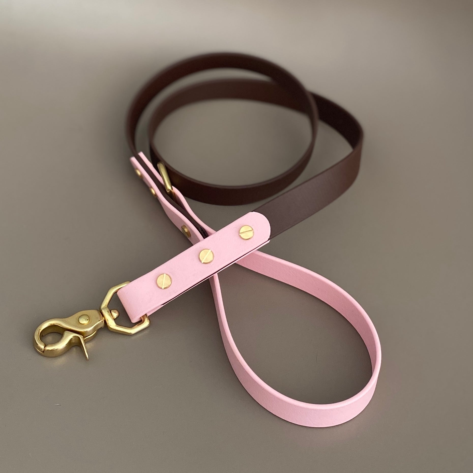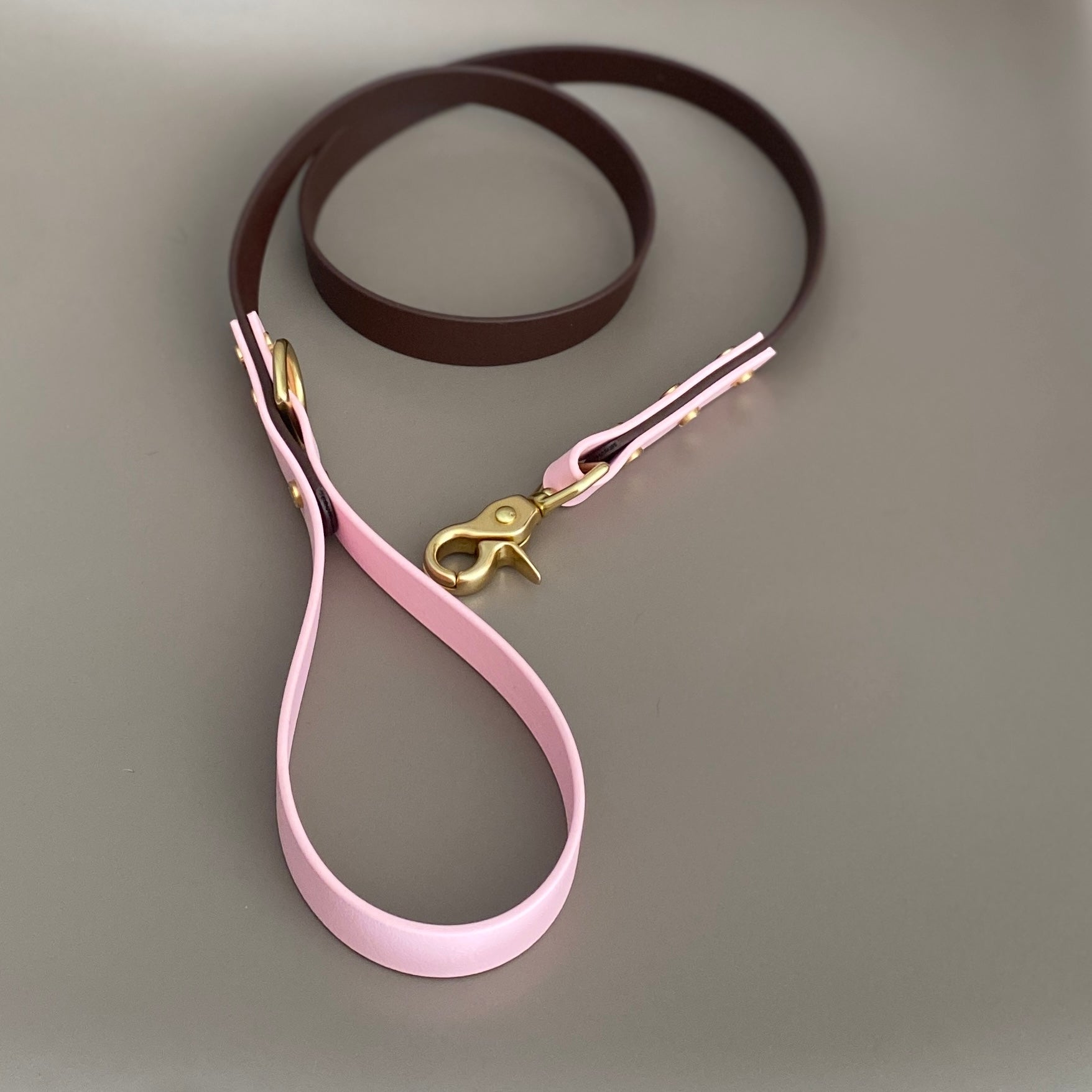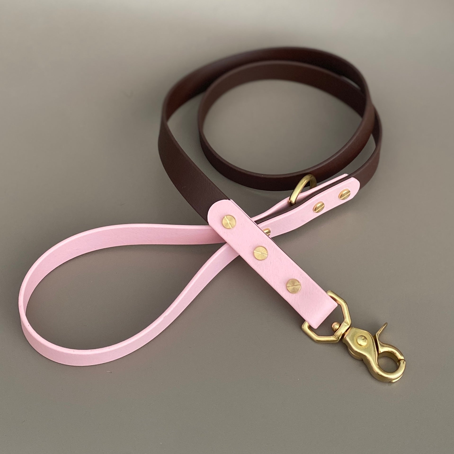Our leads are 120cm (4ft) in length with a fixed solid brass d-ring at the handle loop to attach poo bags or other accessories. All our leads come with solid brass trigger clasps as standard.
