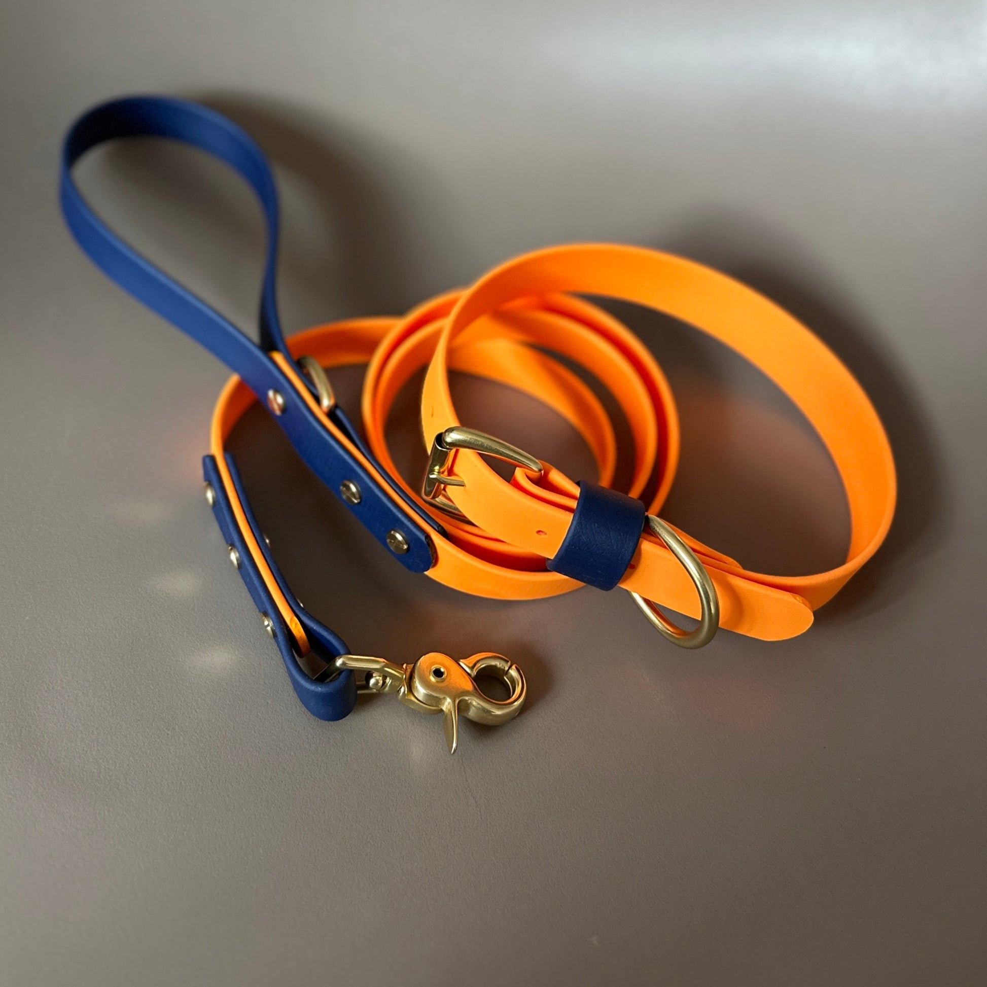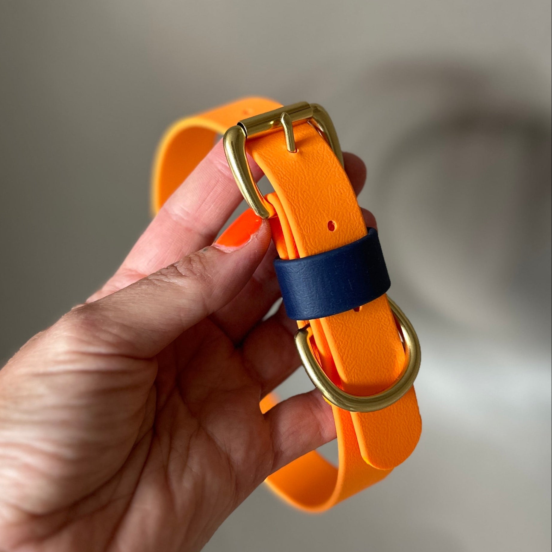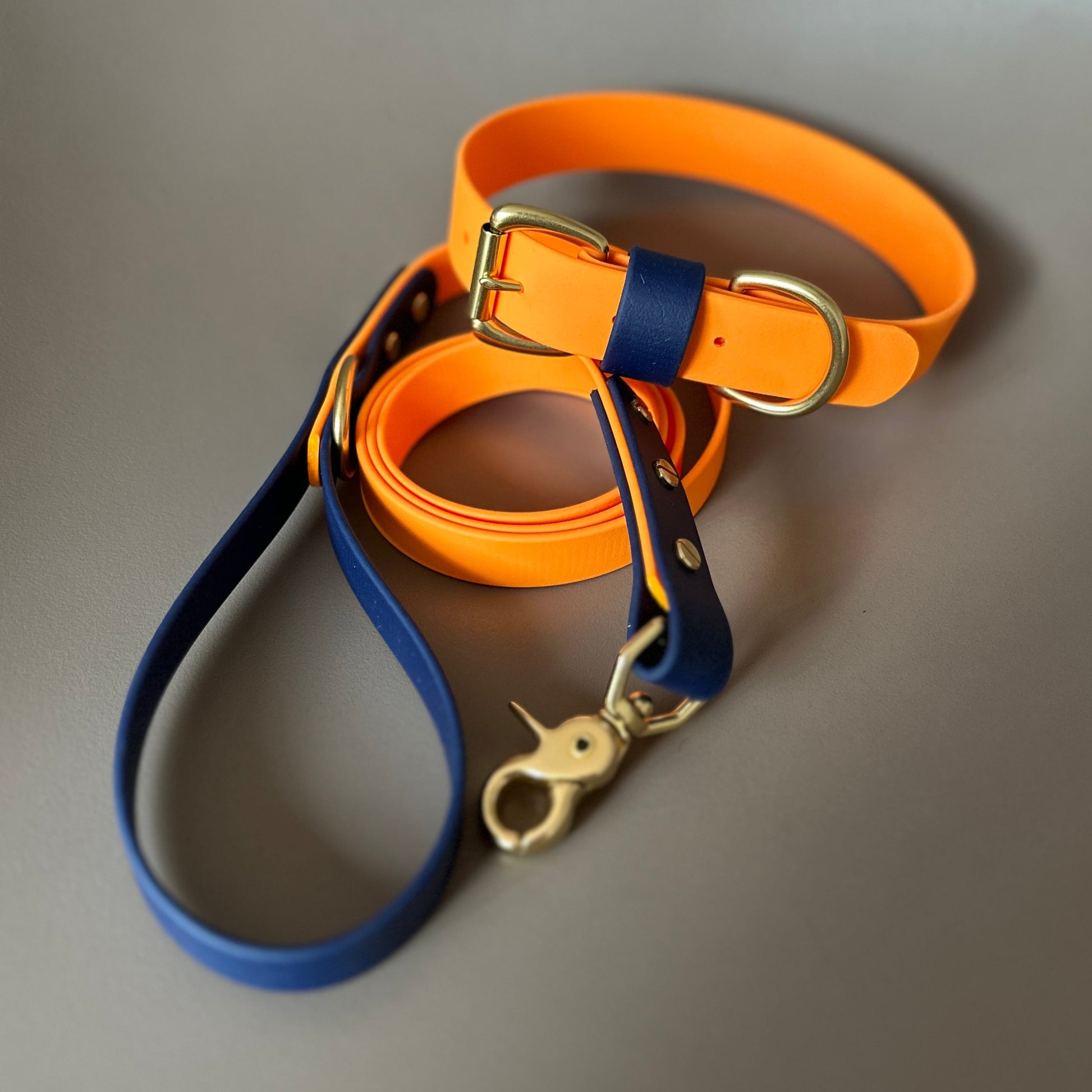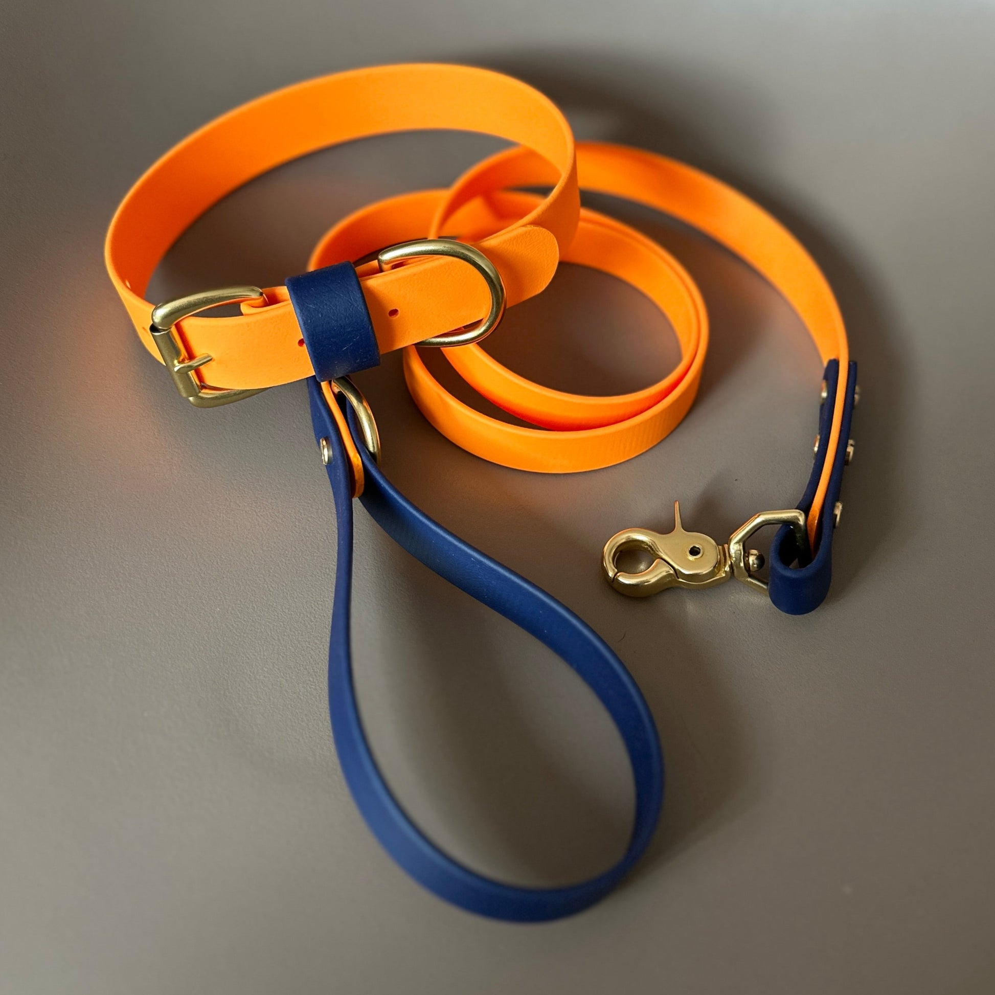 Our Orange as the main colour with a highlight of Navy on the keeper. Designed & worn by handsome customer Mick the Collie.
