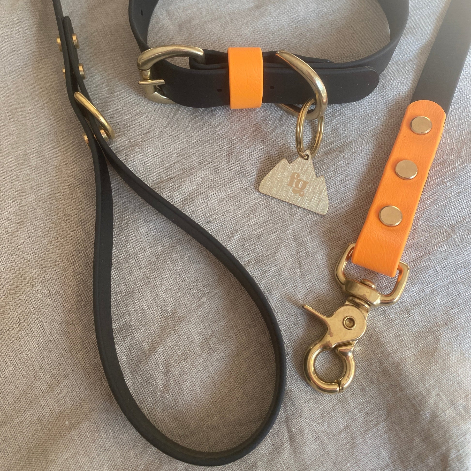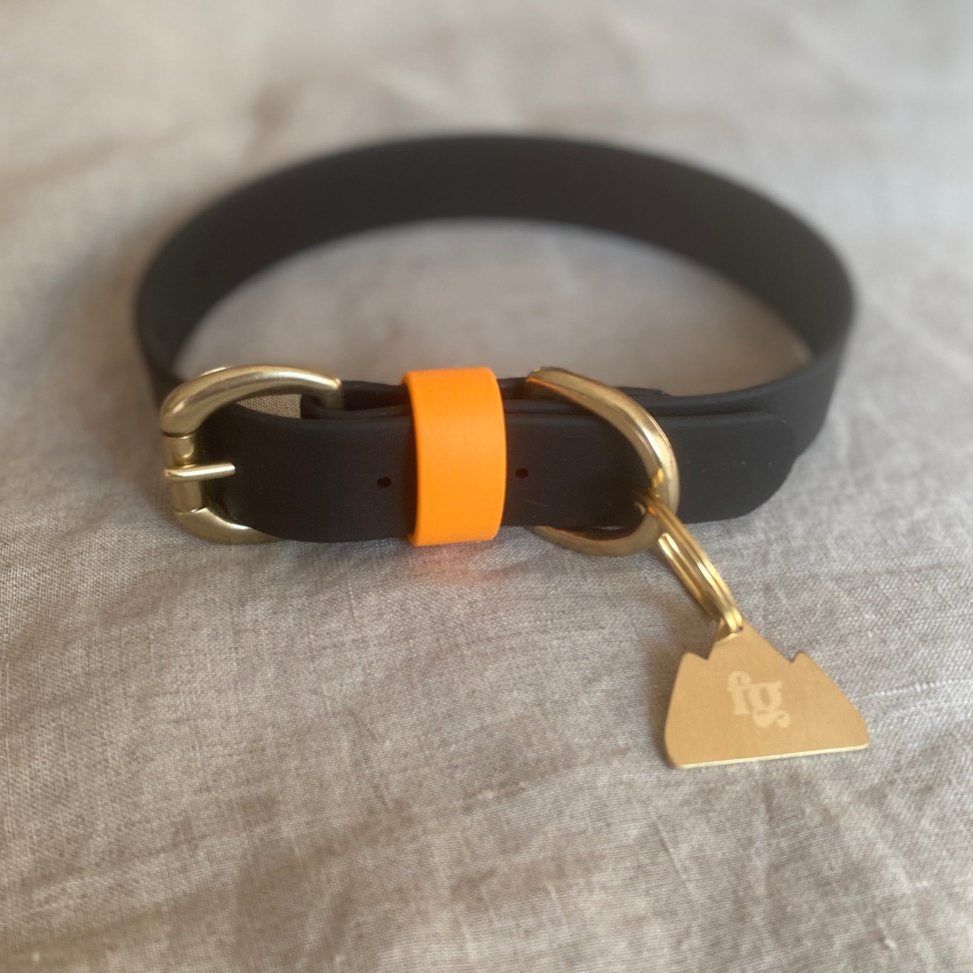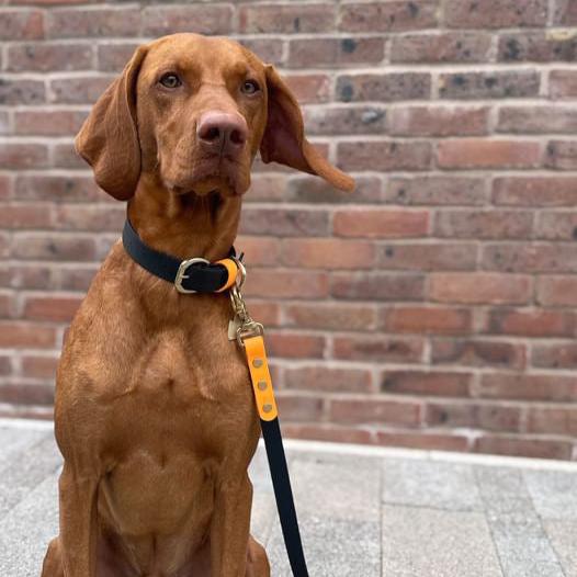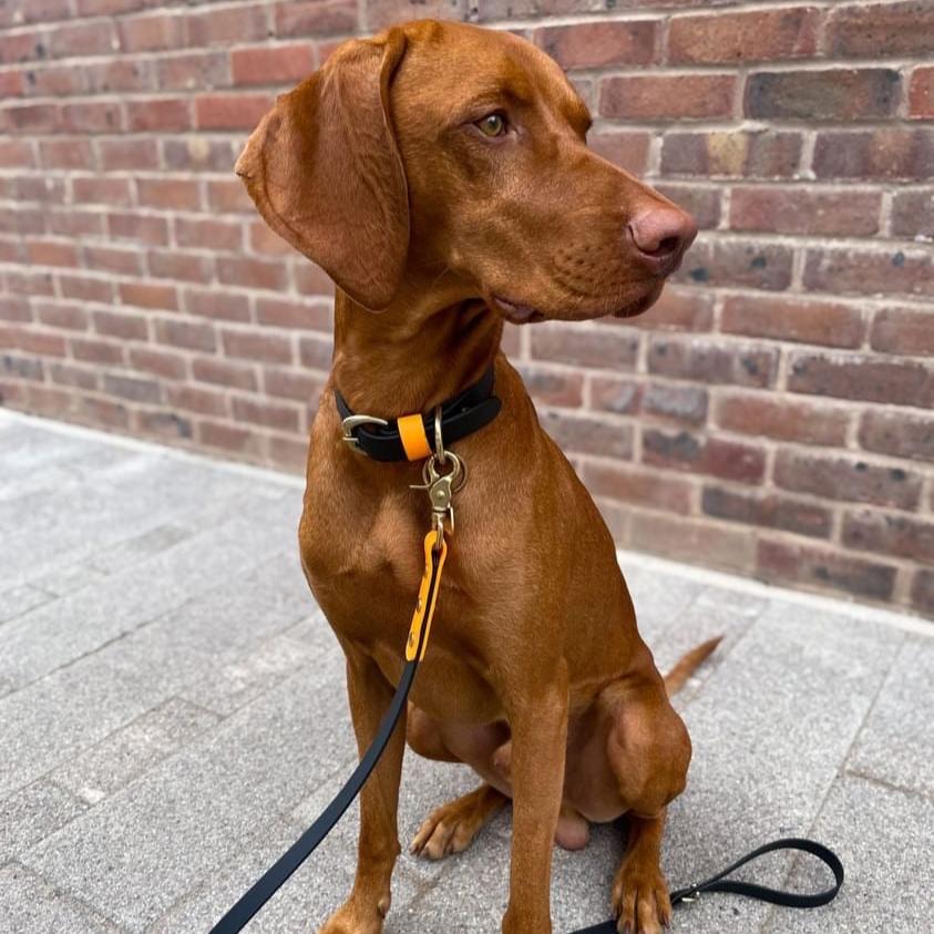 Our black as the main colour with a highlight of Orange. Designed & worn by cute customer Moose the Vizsla.