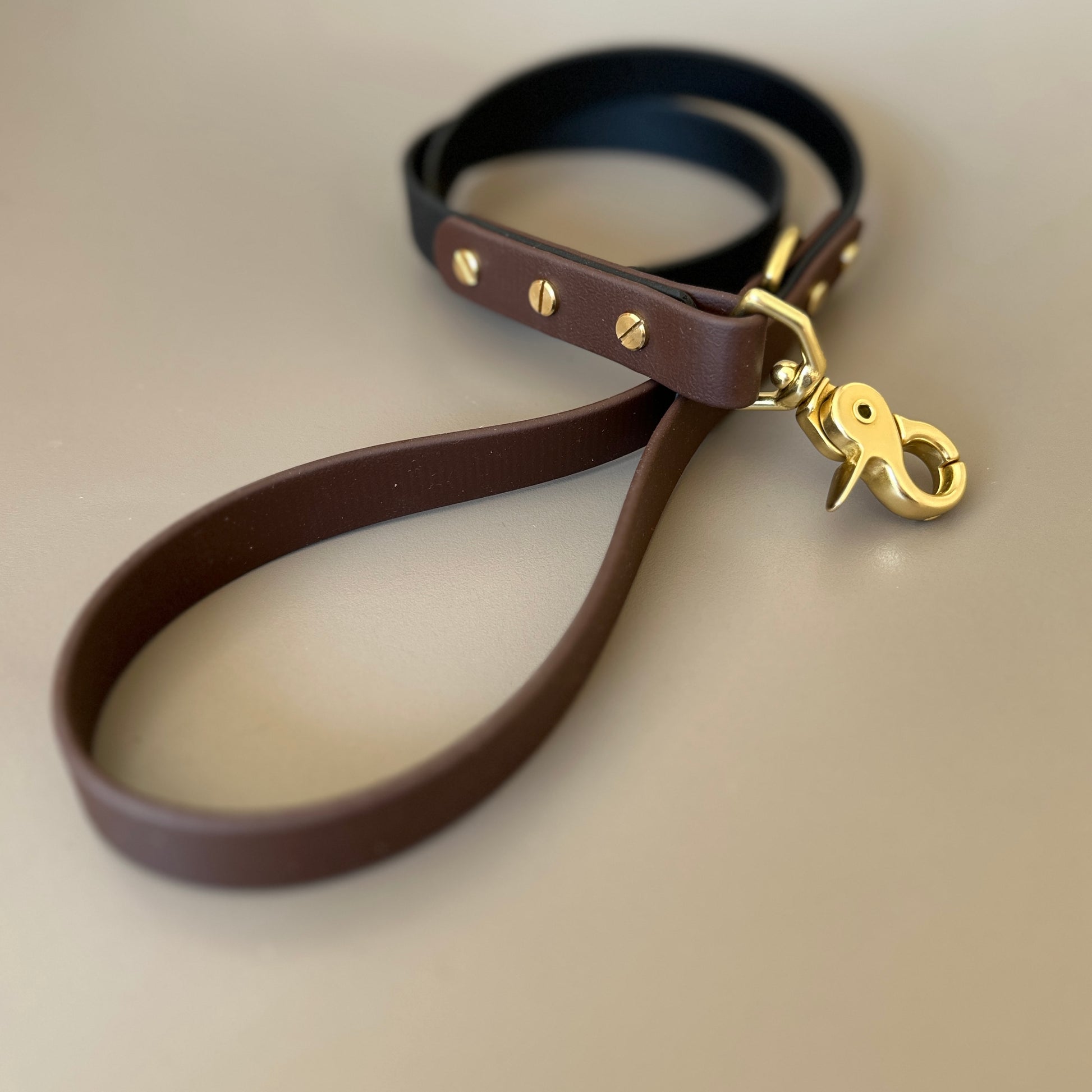 Our leads are 120cm (4ft) in length with a fixed solid brass d-ring at the handle loop to attach poo bags or other accessories. All our leads come with solid brass trigger clasps as standard.