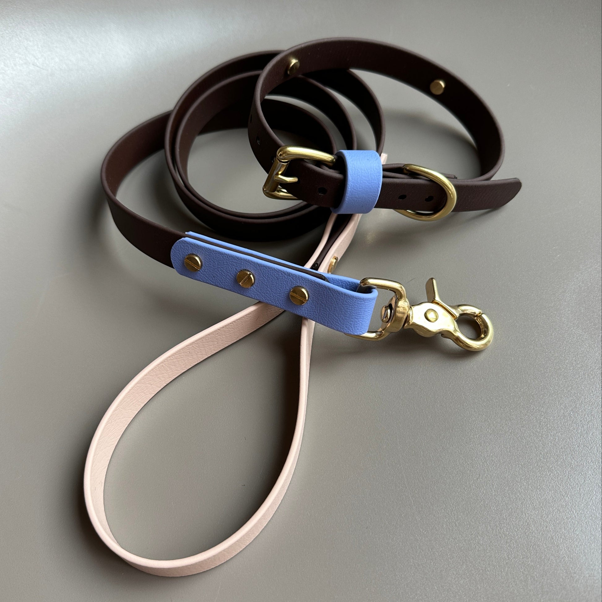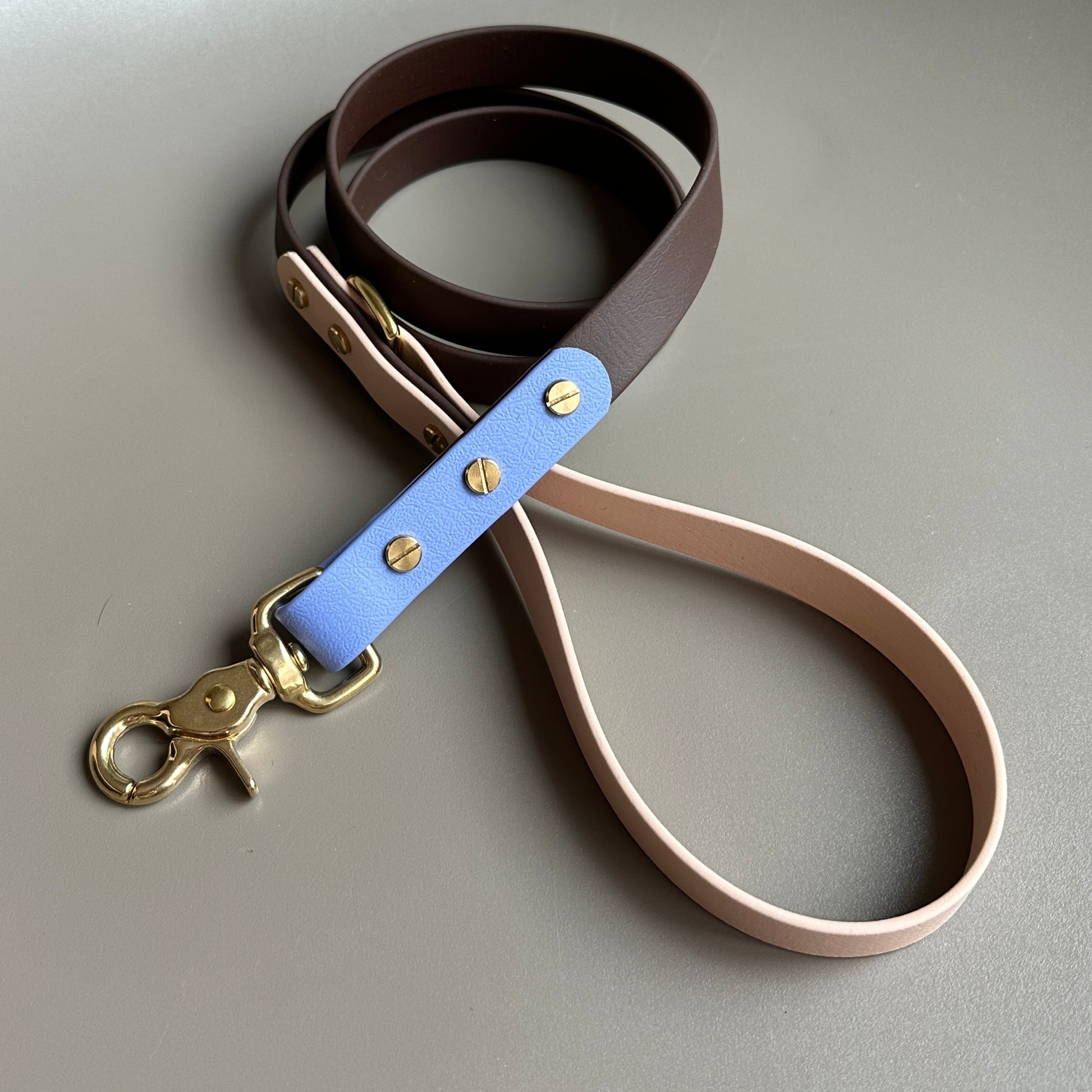 Our Dark Brown as the main colour with highlights of Bluebell and Latte. Designed & worn by pretty customer Nova the Vizsla.