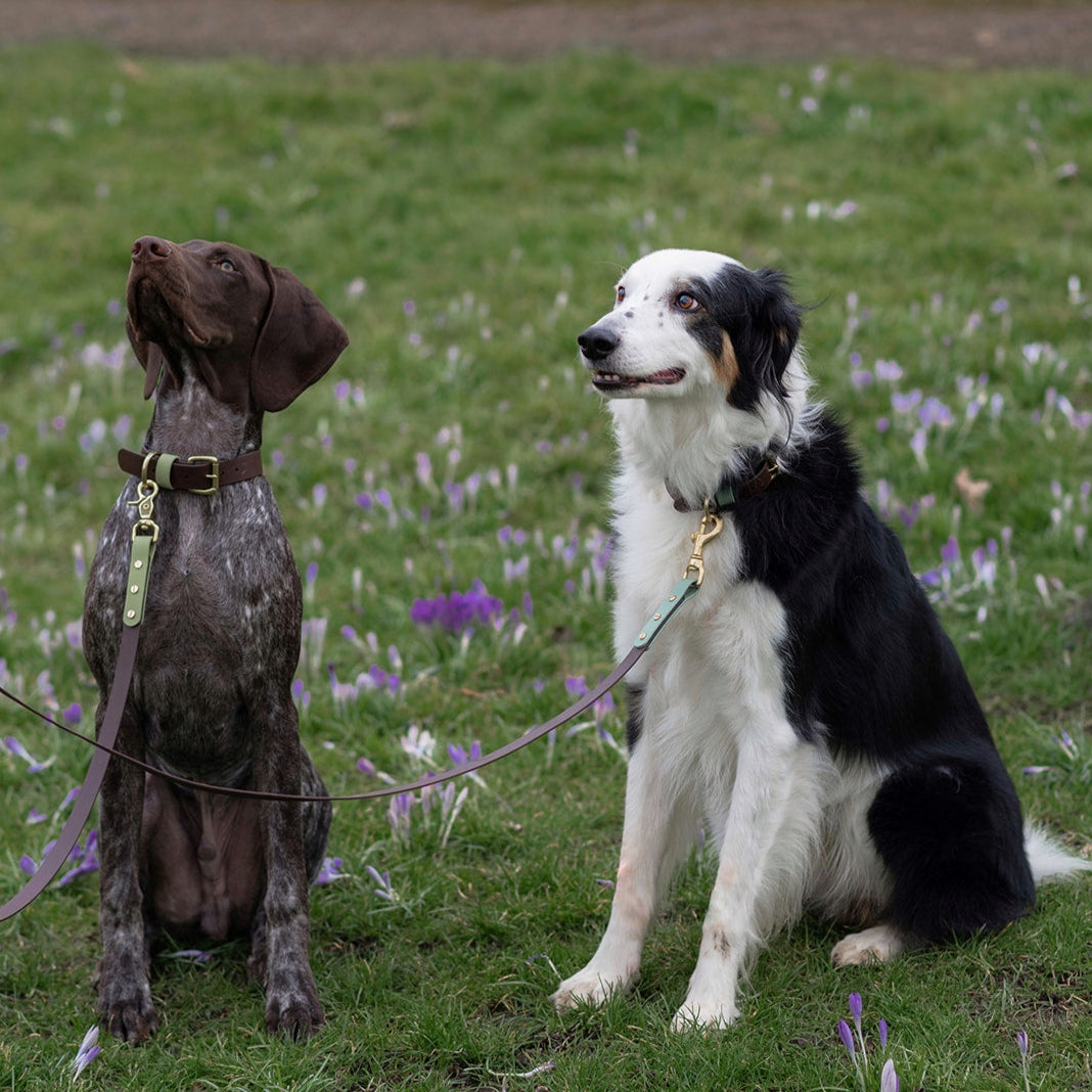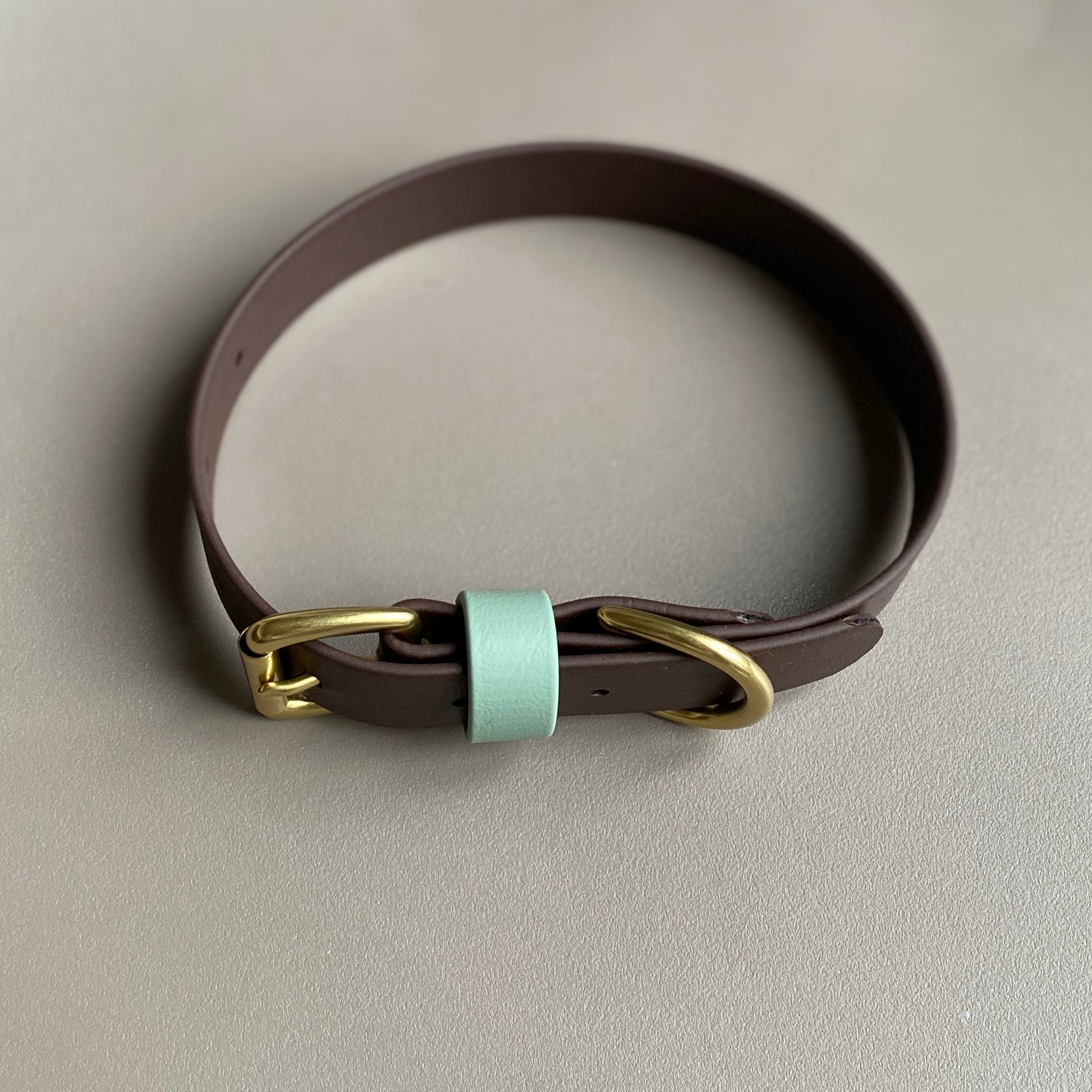 Our Dark Brown as the main colour with a highlight of Sage on the keeper. Designed and worn by gorgeous Ozzy the Border Collie.