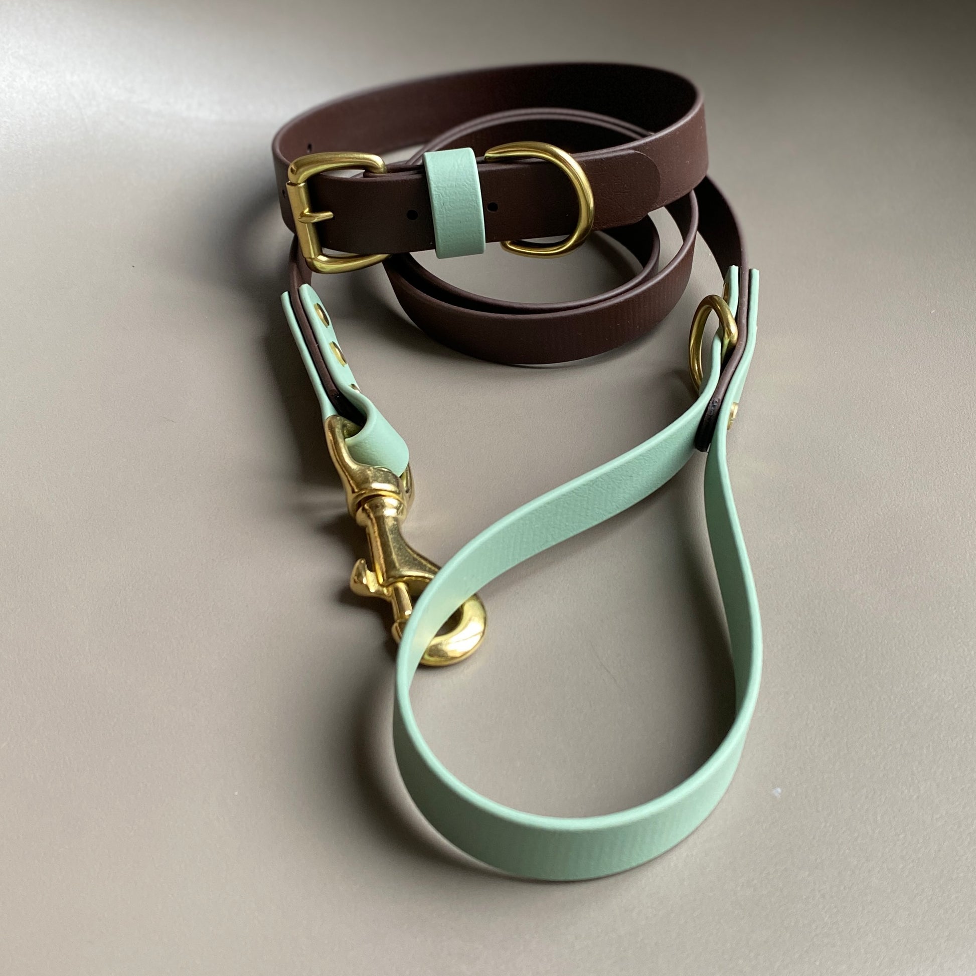 Our handmade collars and leads are made of BioThane®, a very strong rubber coated webbing that has a soft pliable leather like look and feel. BioThane® is water resistant, mould resistant, odour resistant, anti-bacterial and easy to keep clean. The ideal material for any active pup, especially if your dog likes a swim or gets very dirty during their walks, simply wipe it clean afterwards and it will be as good as new.