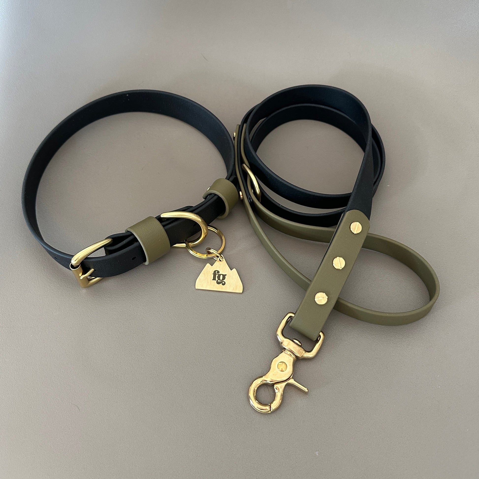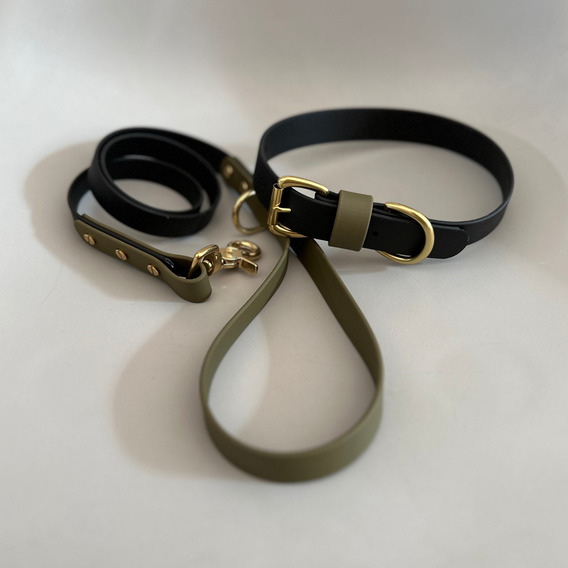 Our Black as the main colour with a highlight of Olive. Designed & worn by handsome customer Rafe the Fox Red Labrador.