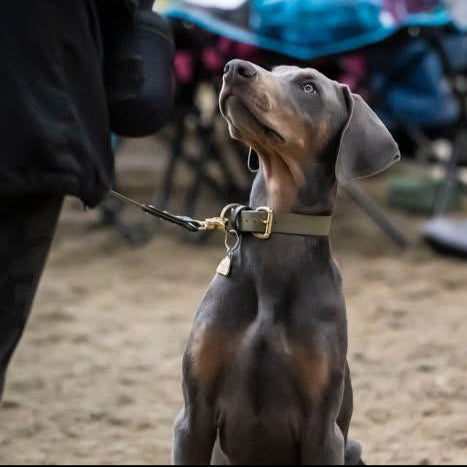 Olive as the main colour with a highlight of Black on the keeper. Designed & worn by cute customer Ray the Blue Doberman puppy.