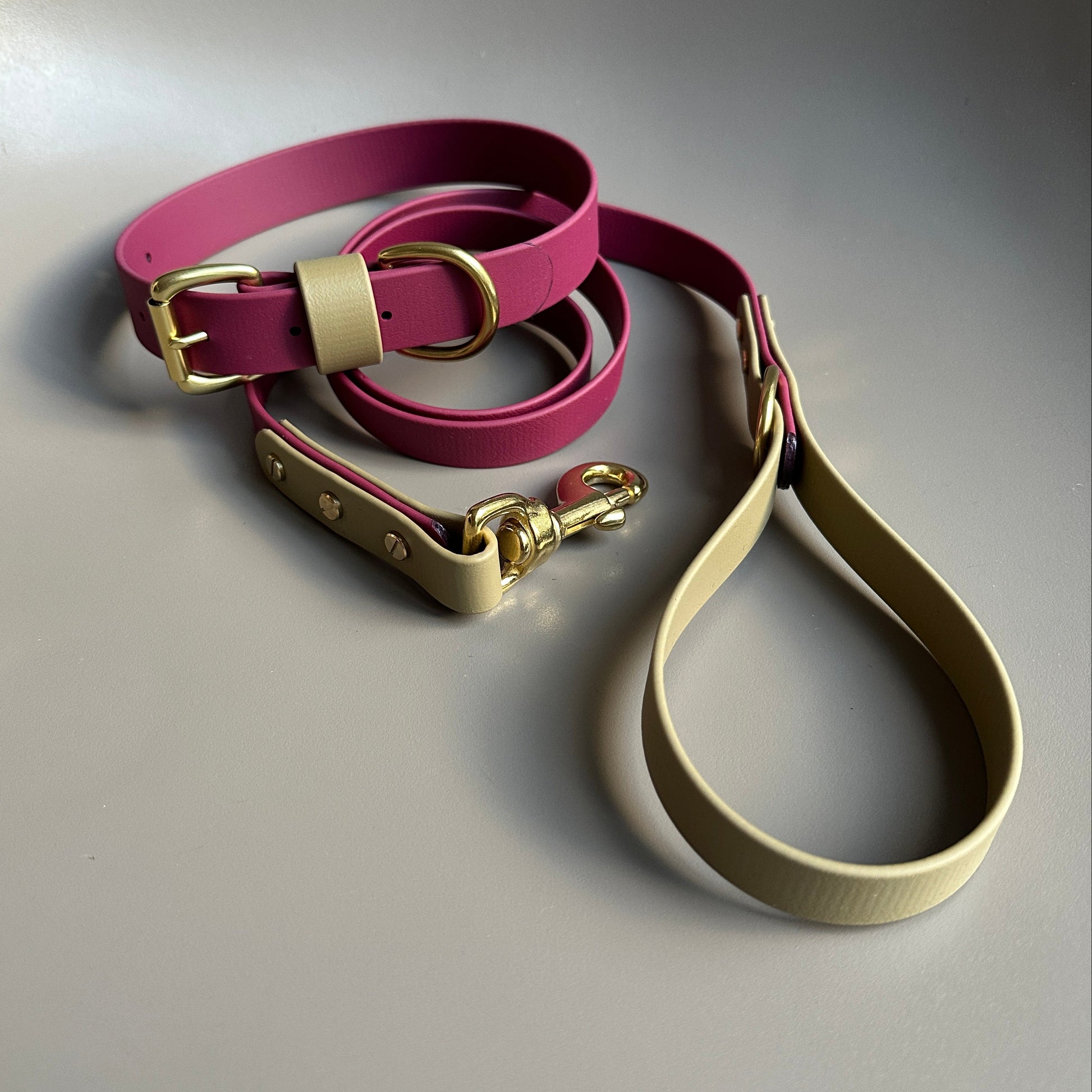 Our handmade collars and leads are made of BioThane®, a very strong rubber coated webbing that has a soft pliable leather like look and feel. BioThane® is water resistant, mould resistant, odour resistant, anti-bacterial and easy to keep clean. The ideal material for any active pup, especially if your dog likes a swim or gets very dirty during their walks, simply wipe it clean afterwards and it will be as good as new.