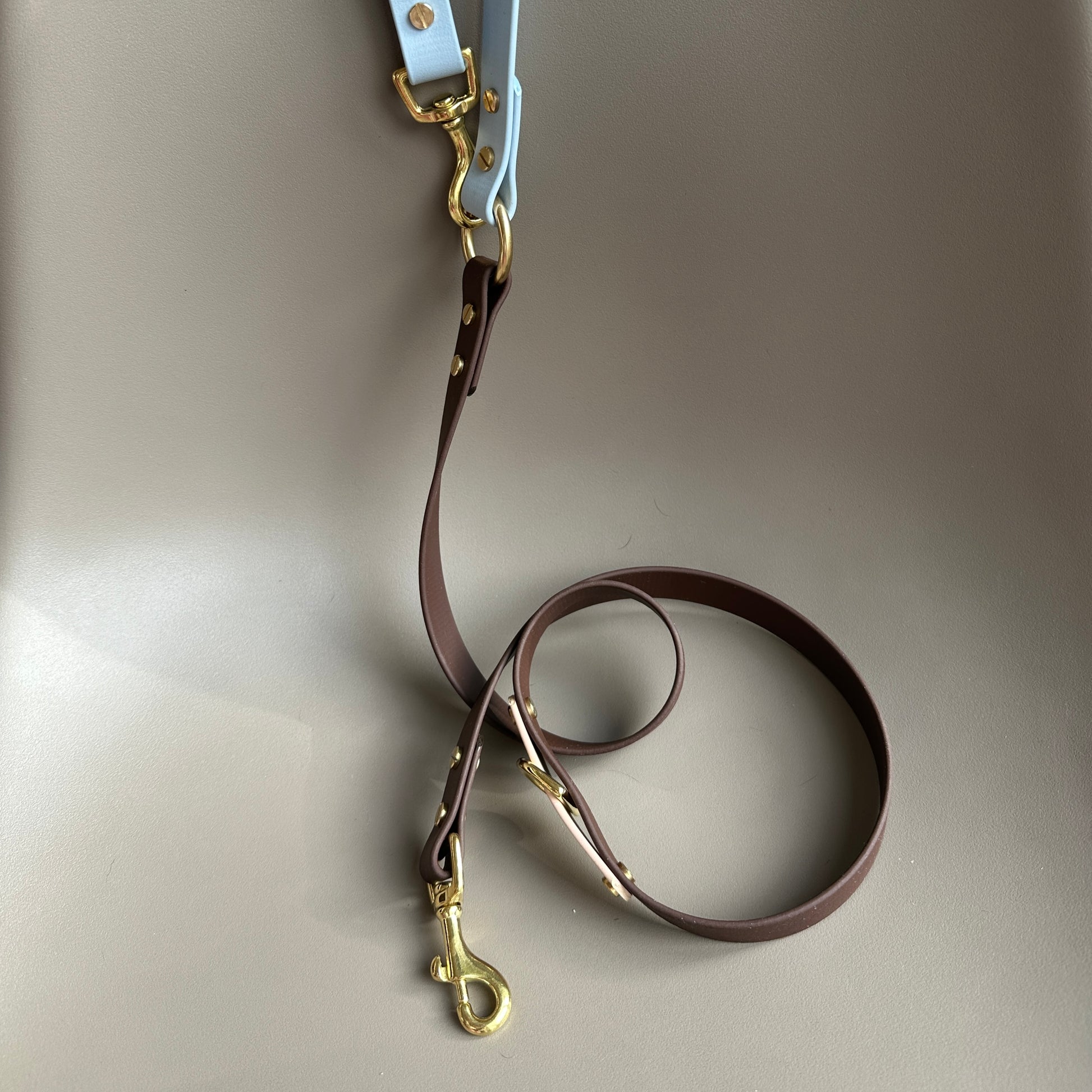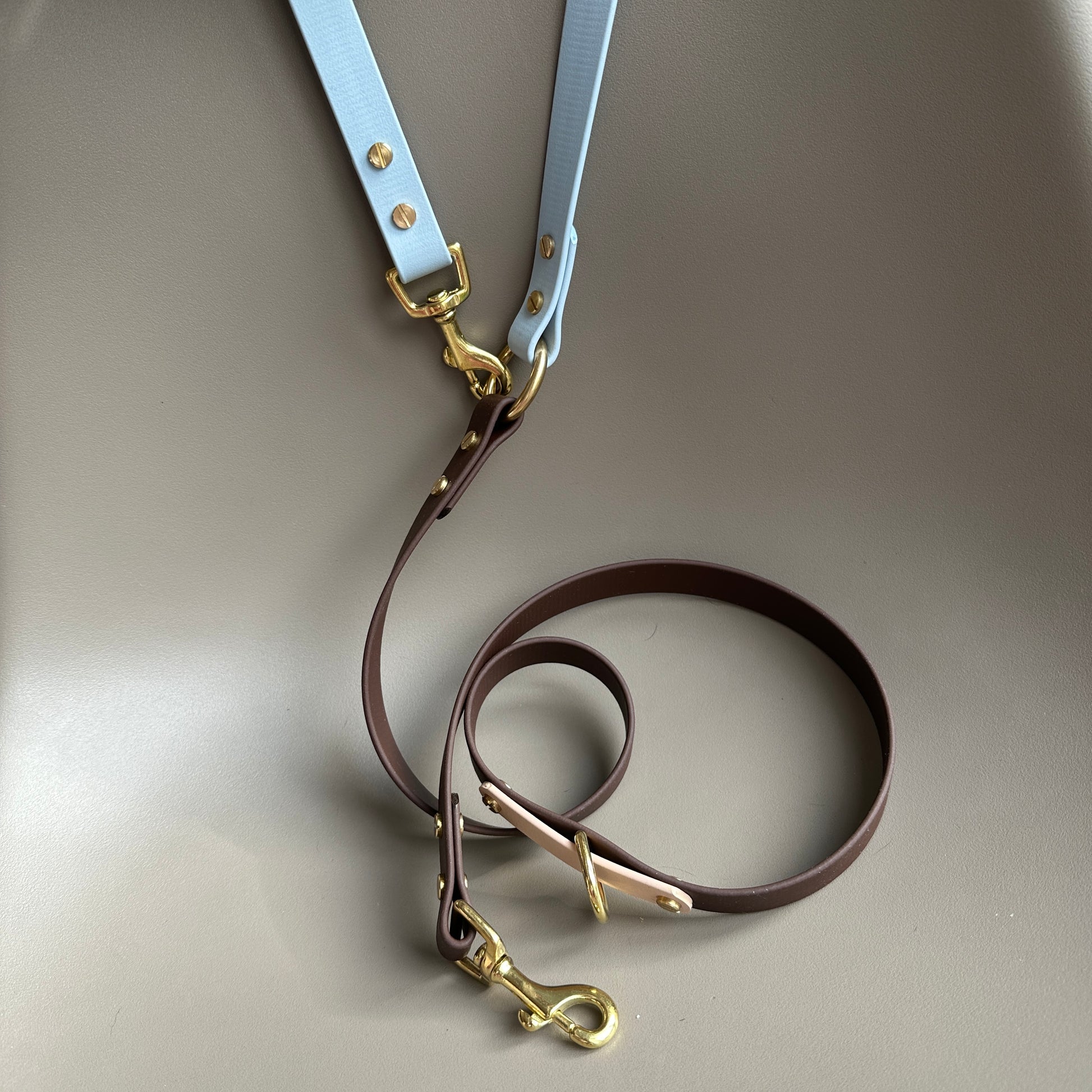 A stunning colourblock multiway lead in Powder Blue, Latte and Dark Brown. Created by handsome customer Reuben the Standard Poodle.