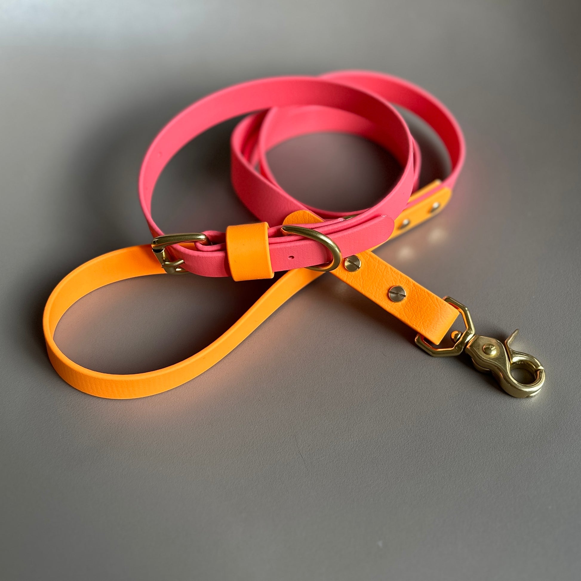 Our handmade collars and leads are made of BioThane®, a very strong rubber coated webbing that has a soft pliable leather like look and feel. BioThane® is water resistant, mould resistant, odour resistant, anti-bacterial and easy to keep clean. The ideal material for any active pup, especially if your dog likes a swim or gets very dirty during their walks, simply wipe it clean afterwards and it will be as good as new.